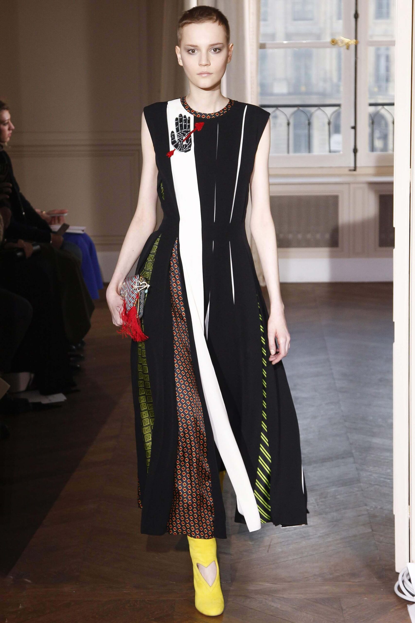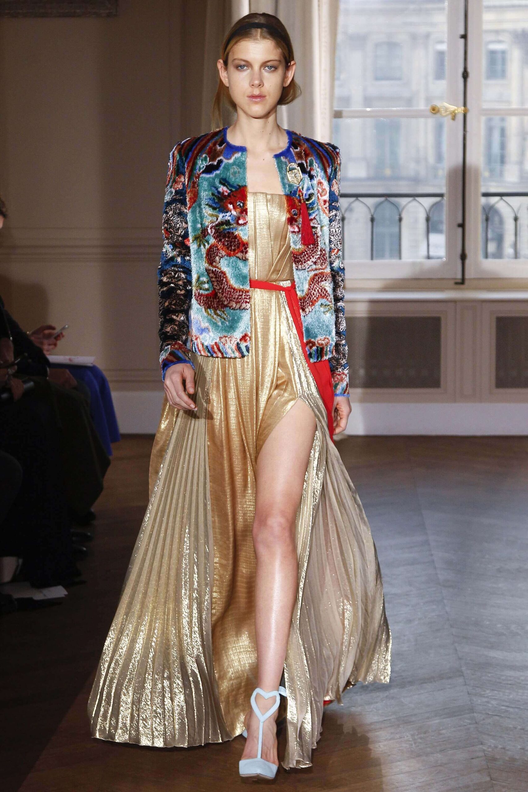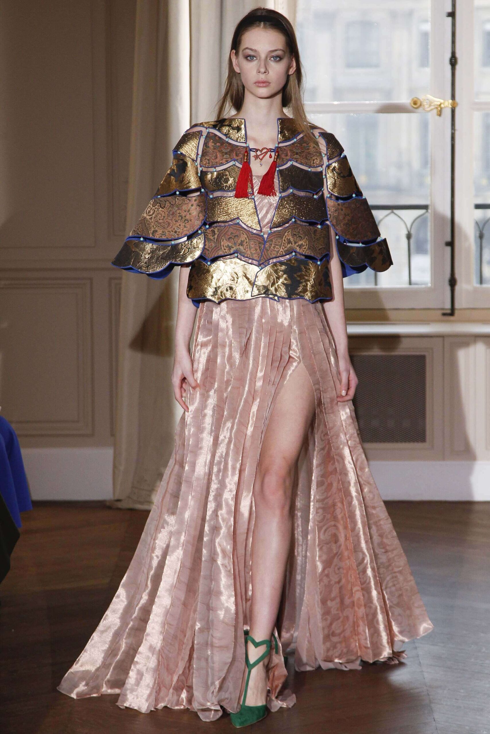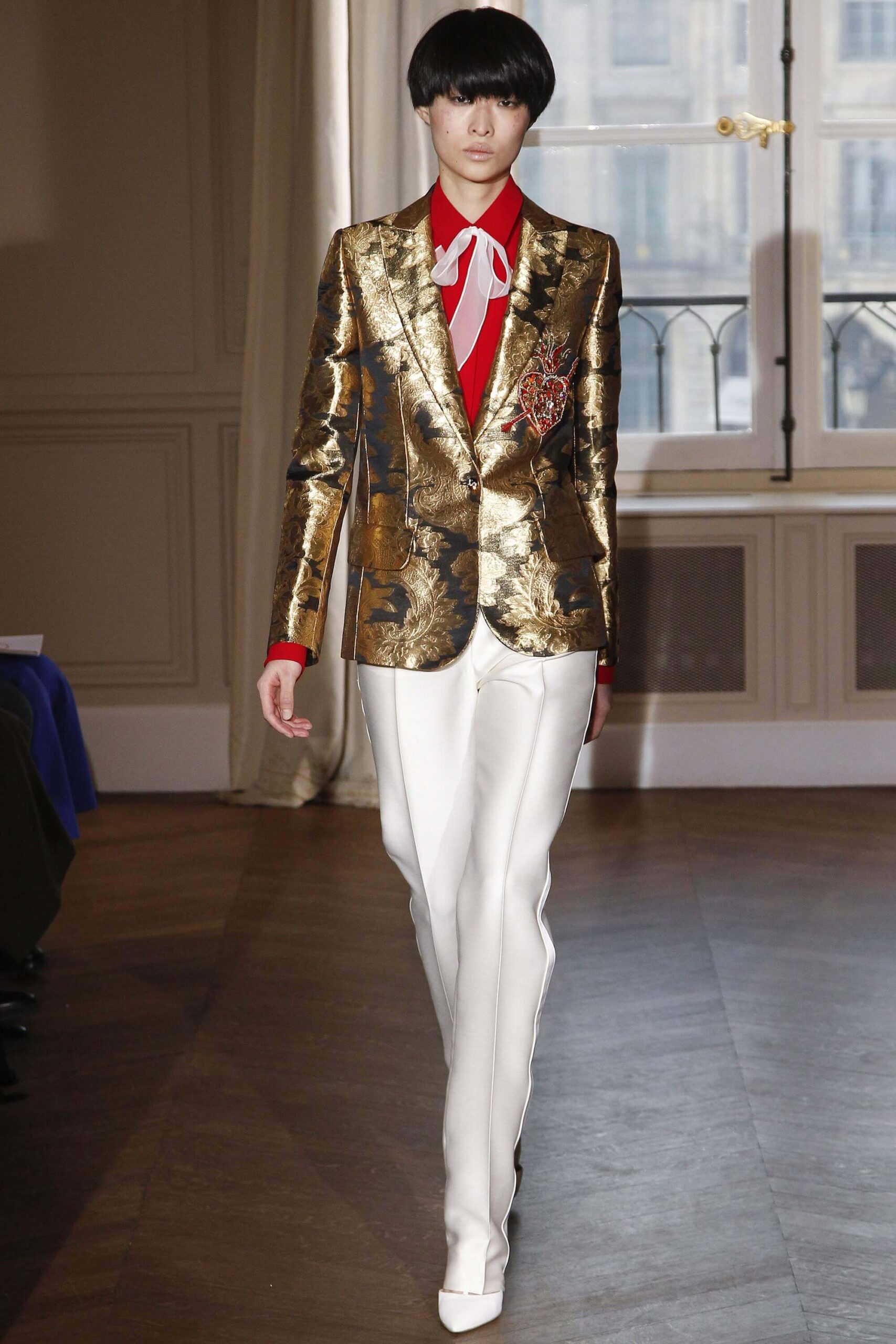 If the Village People, or, for that matter, the Pet Shop Boys, had not gone west, but east, then they probably would have ended up somewhere around here. Because Schiaparelli’s SS17 Haute Couture offering, their first since becoming an official Haute Couture house once again, was about looking eastward – “Chinoiserie at heart,” the collection was titled. But banish any thoughts of cheap0y cultural rip-offs – instead, it was more about those ideas of opulence at the heart of traditional Chinese and Japanese dressing, siphoned here through the filter of Schiaparelli’s surrealist lens. Which, in real terms, meant the hanfu and kimono (which Elsa herself sashayed about her house wearing) became a loose inspiration – not so much in shape (though there were obi-style belts and Cheongsam-ish tailoring) but in that richness of fabric – traditional woodblock-style florals, jacquards with a golden sheen, dragon embellishments. Fantasy dressing, basically. O-p-u-l-e-n-c-e!