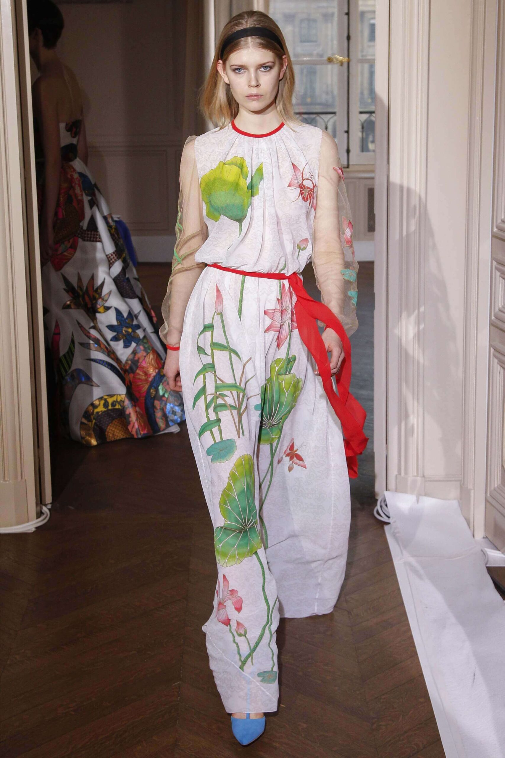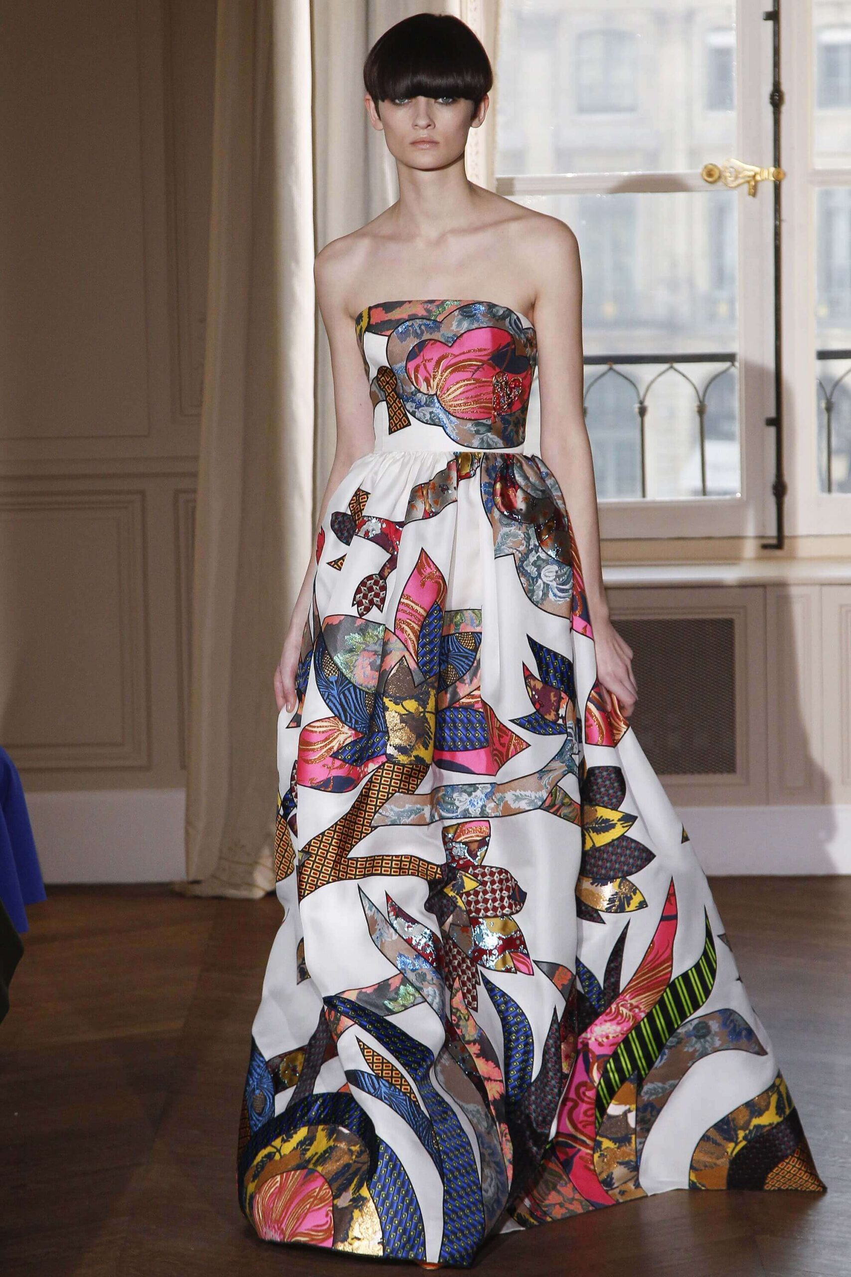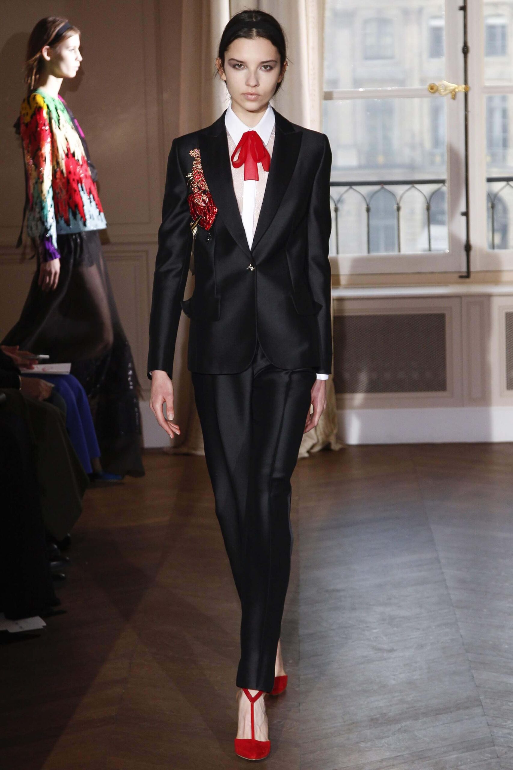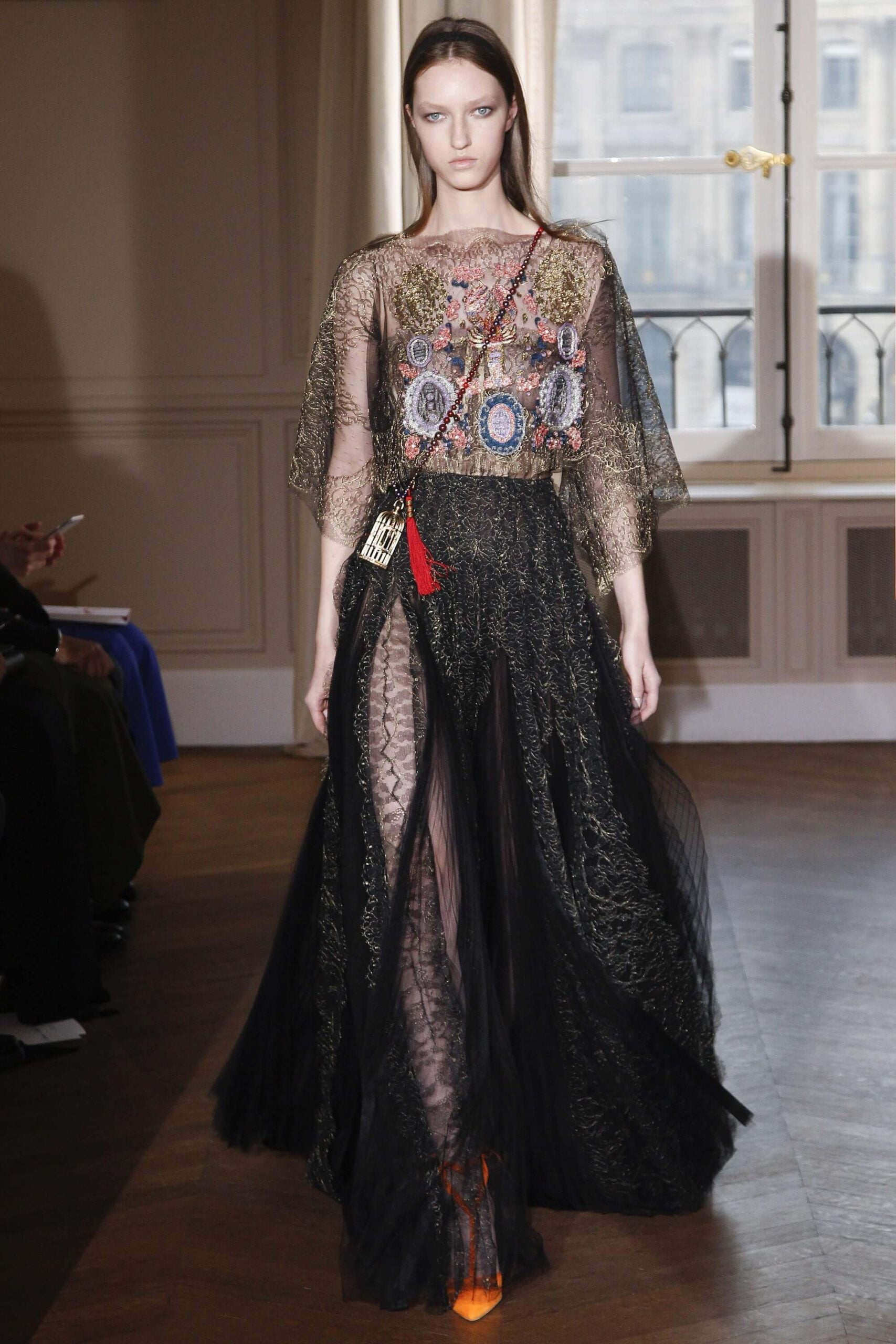 If the Village People, or, for that matter, the Pet Shop Boys, had not gone west, but east, then they probably would have ended up somewhere around here. Because Schiaparelli’s SS17 Haute Couture offering, their first since becoming an official Haute Couture house once again, was about looking eastward – “Chinoiserie at heart,” the collection was titled. But banish any thoughts of cheap0y cultural rip-offs – instead, it was more about those ideas of opulence at the heart of traditional Chinese and Japanese dressing, siphoned here through the filter of Schiaparelli’s surrealist lens. Which, in real terms, meant the hanfu and kimono (which Elsa herself sashayed about her house wearing) became a loose inspiration – not so much in shape (though there were obi-style belts and Cheongsam-ish tailoring) but in that richness of fabric – traditional woodblock-style florals, jacquards with a golden sheen, dragon embellishments. Fantasy dressing, basically. O-p-u-l-e-n-c-e!