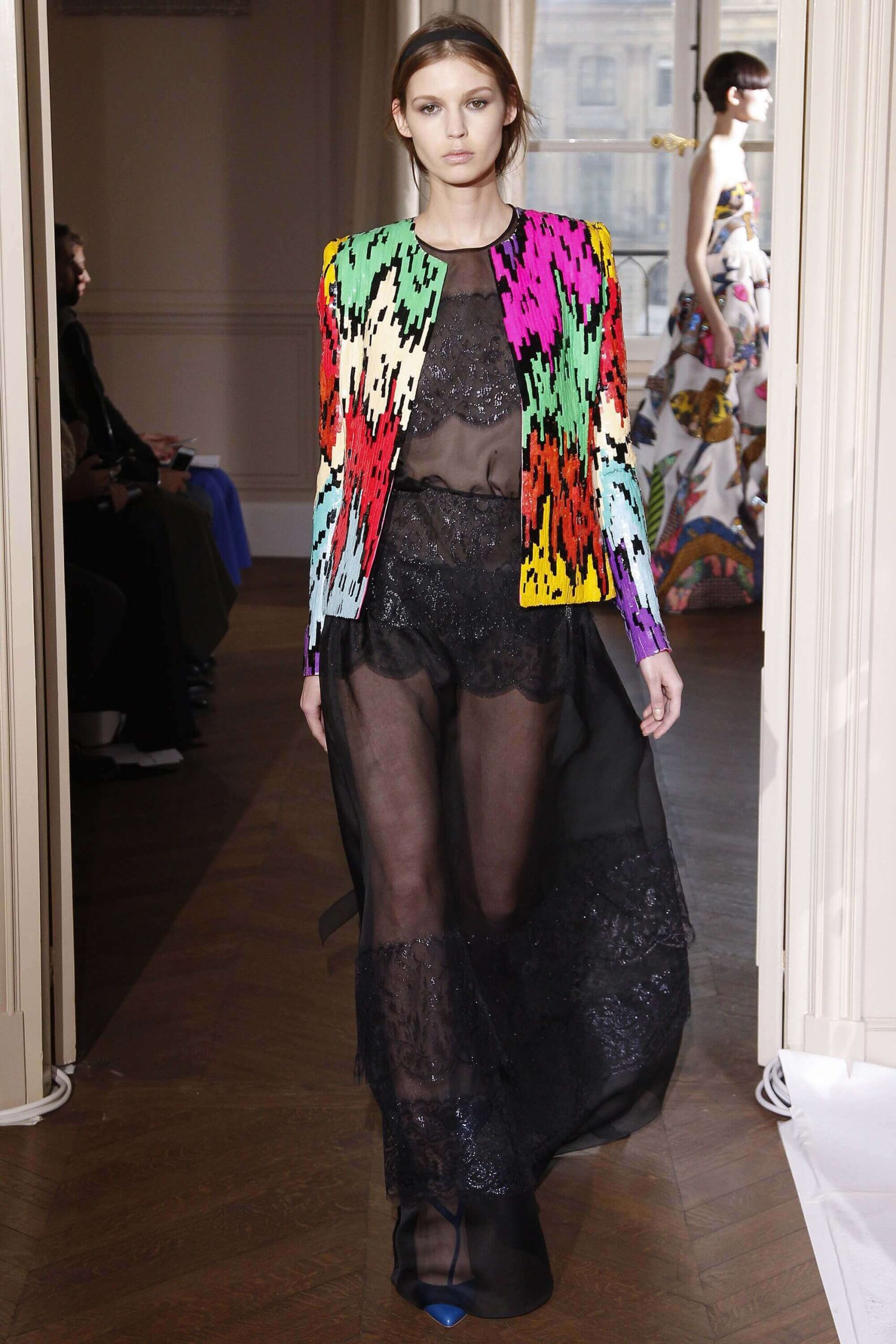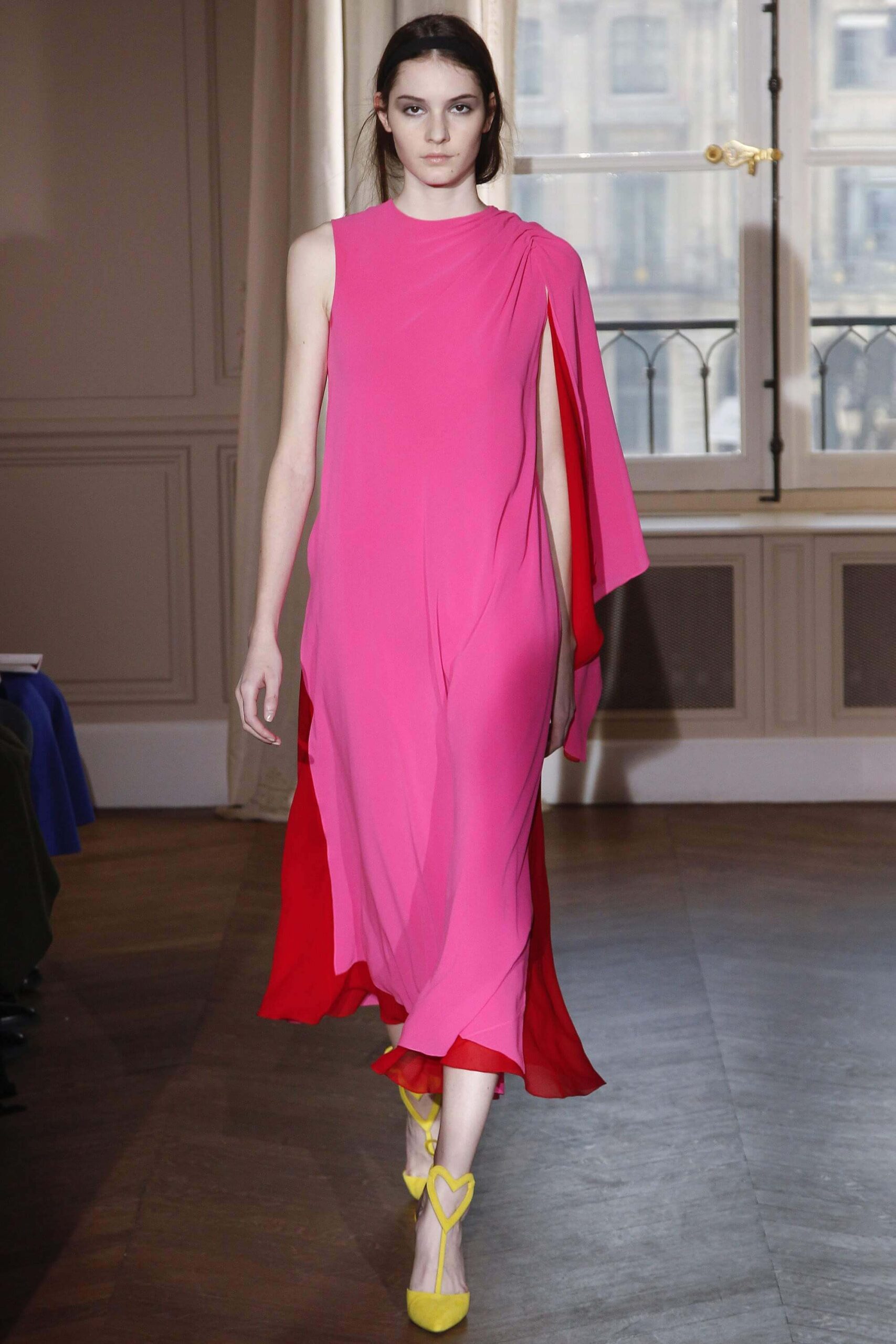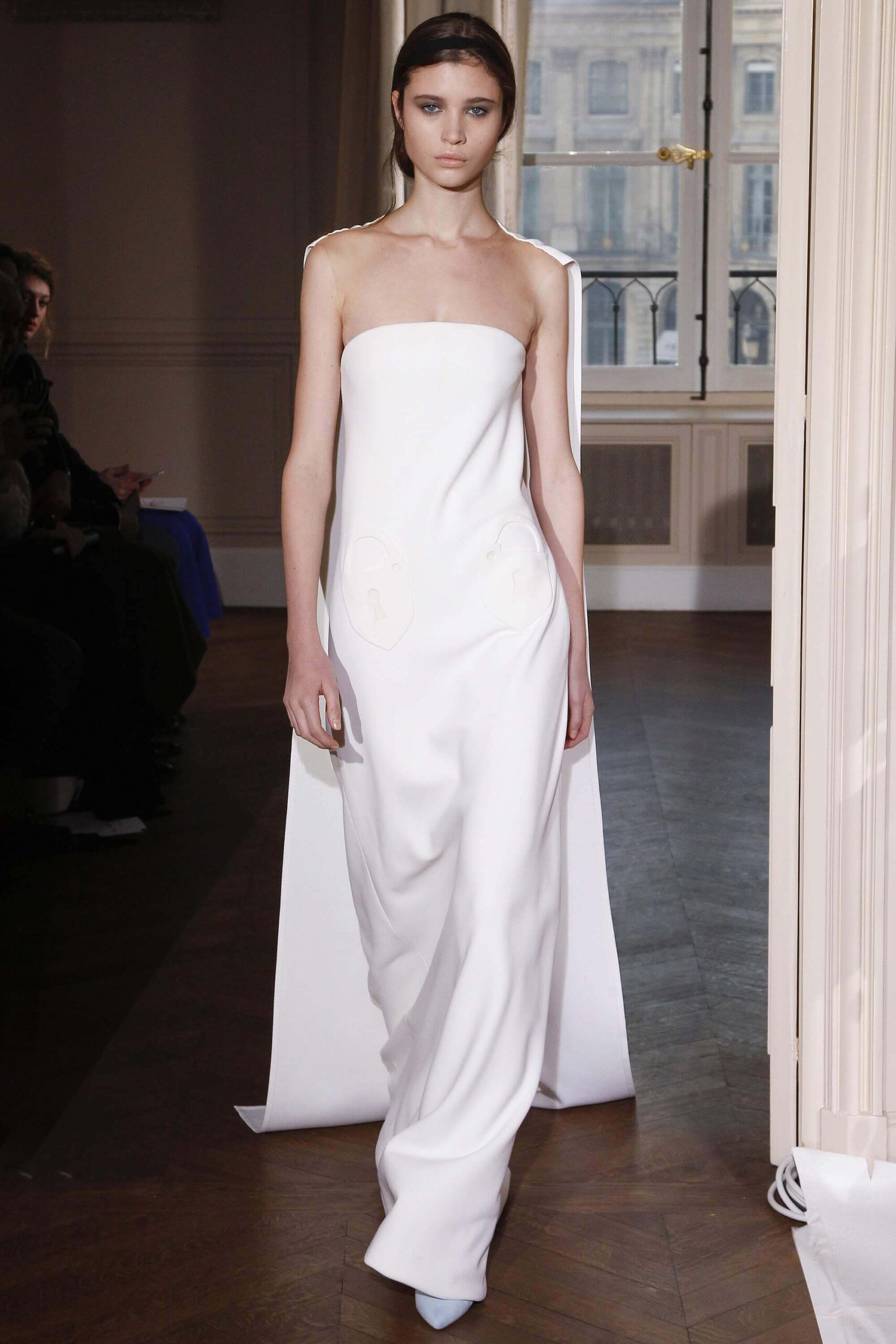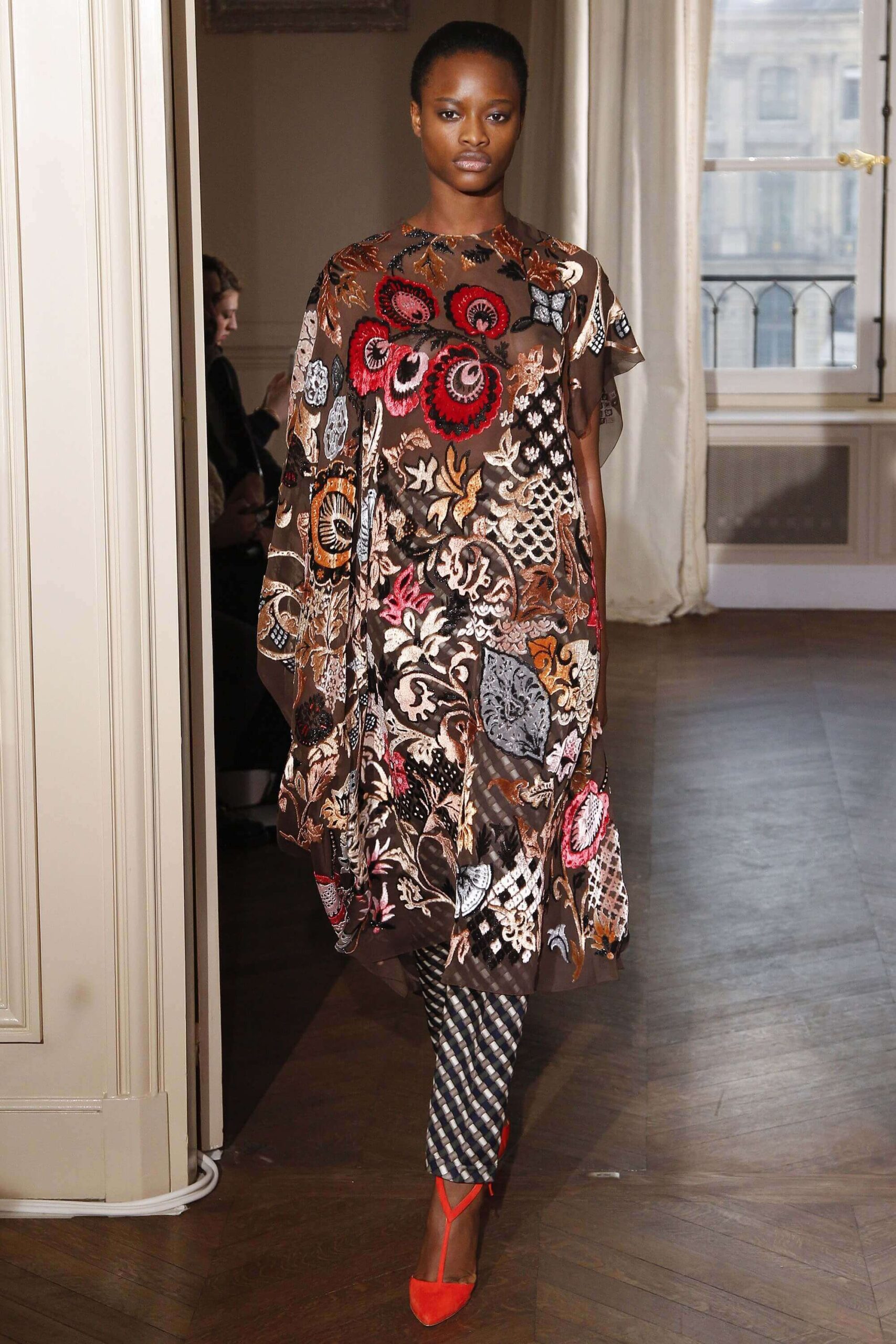 If the Village People, or, for that matter, the Pet Shop Boys, had not gone west, but east, then they probably would have ended up somewhere around here. Because Schiaparelli’s SS17 Haute Couture offering, their first since becoming an official Haute Couture house once again, was about looking eastward – “Chinoiserie at heart,” the collection was titled. But banish any thoughts of cheap0y cultural rip-offs – instead, it was more about those ideas of opulence at the heart of traditional Chinese and Japanese dressing, siphoned here through the filter of Schiaparelli’s surrealist lens. Which, in real terms, meant the hanfu and kimono (which Elsa herself sashayed about her house wearing) became a loose inspiration – not so much in shape (though there were obi-style belts and Cheongsam-ish tailoring) but in that richness of fabric – traditional woodblock-style florals, jacquards with a golden sheen, dragon embellishments. Fantasy dressing, basically. O-p-u-l-e-n-c-e!