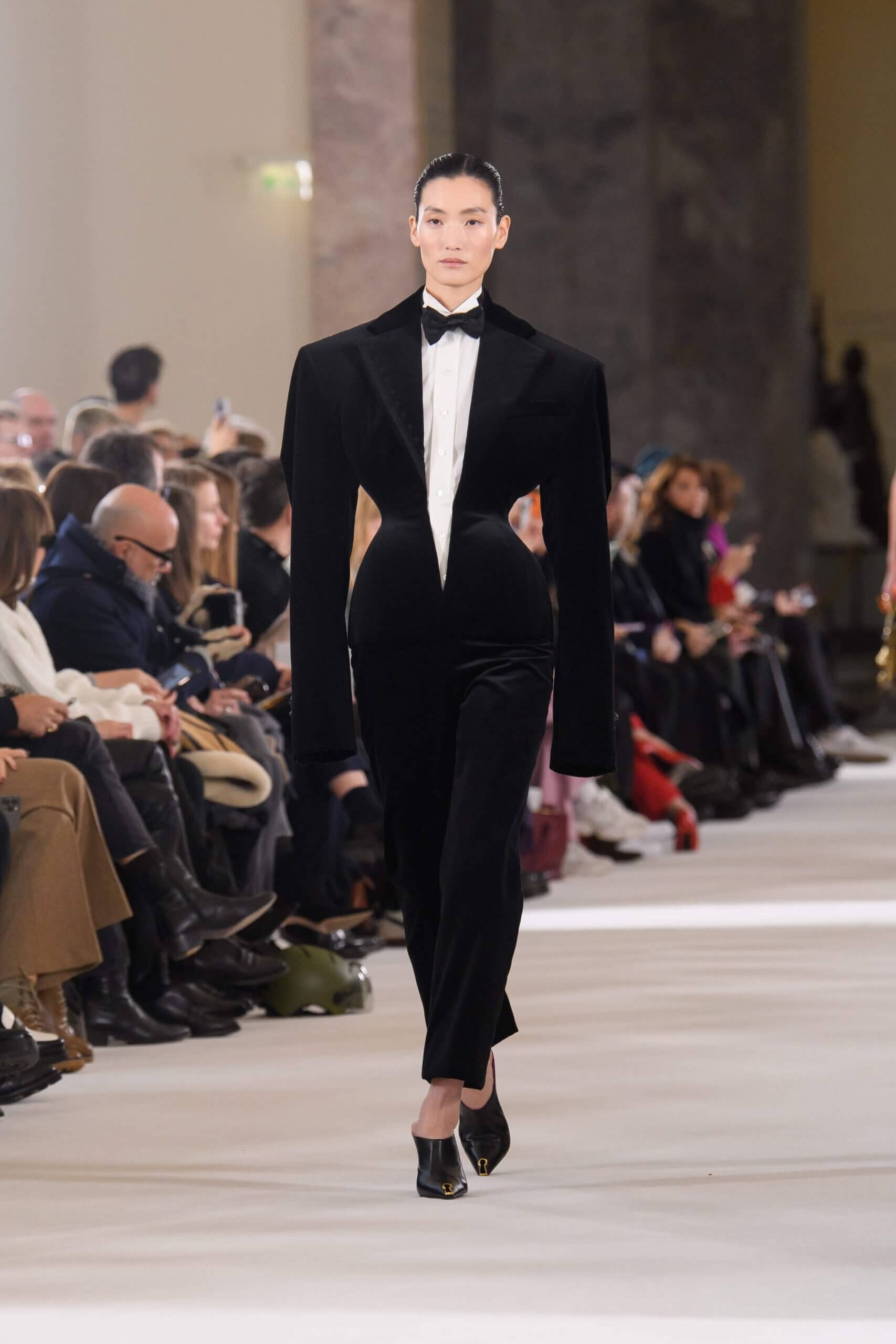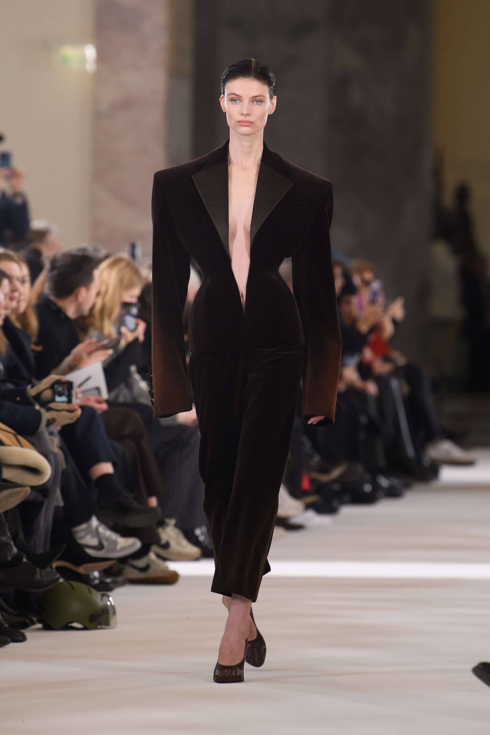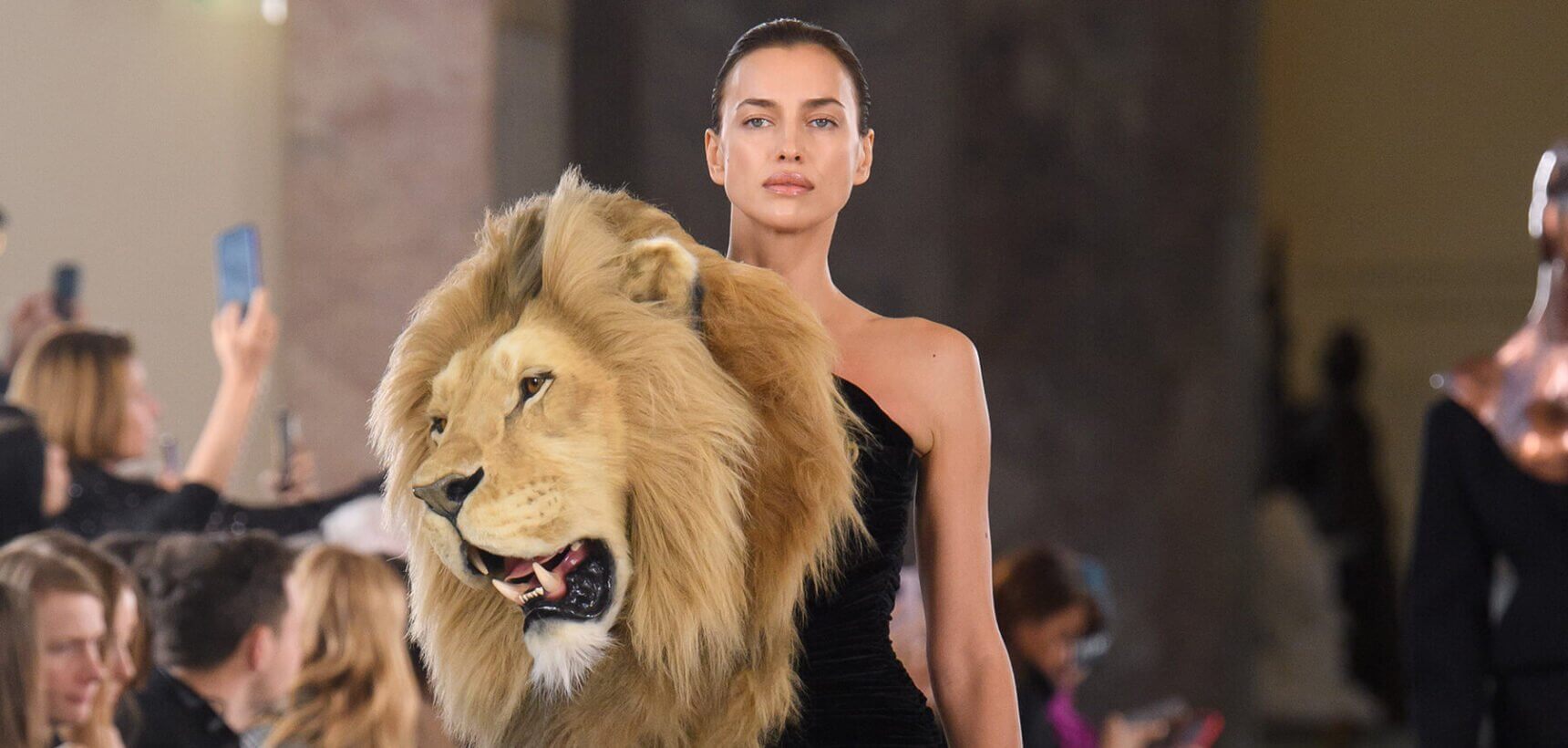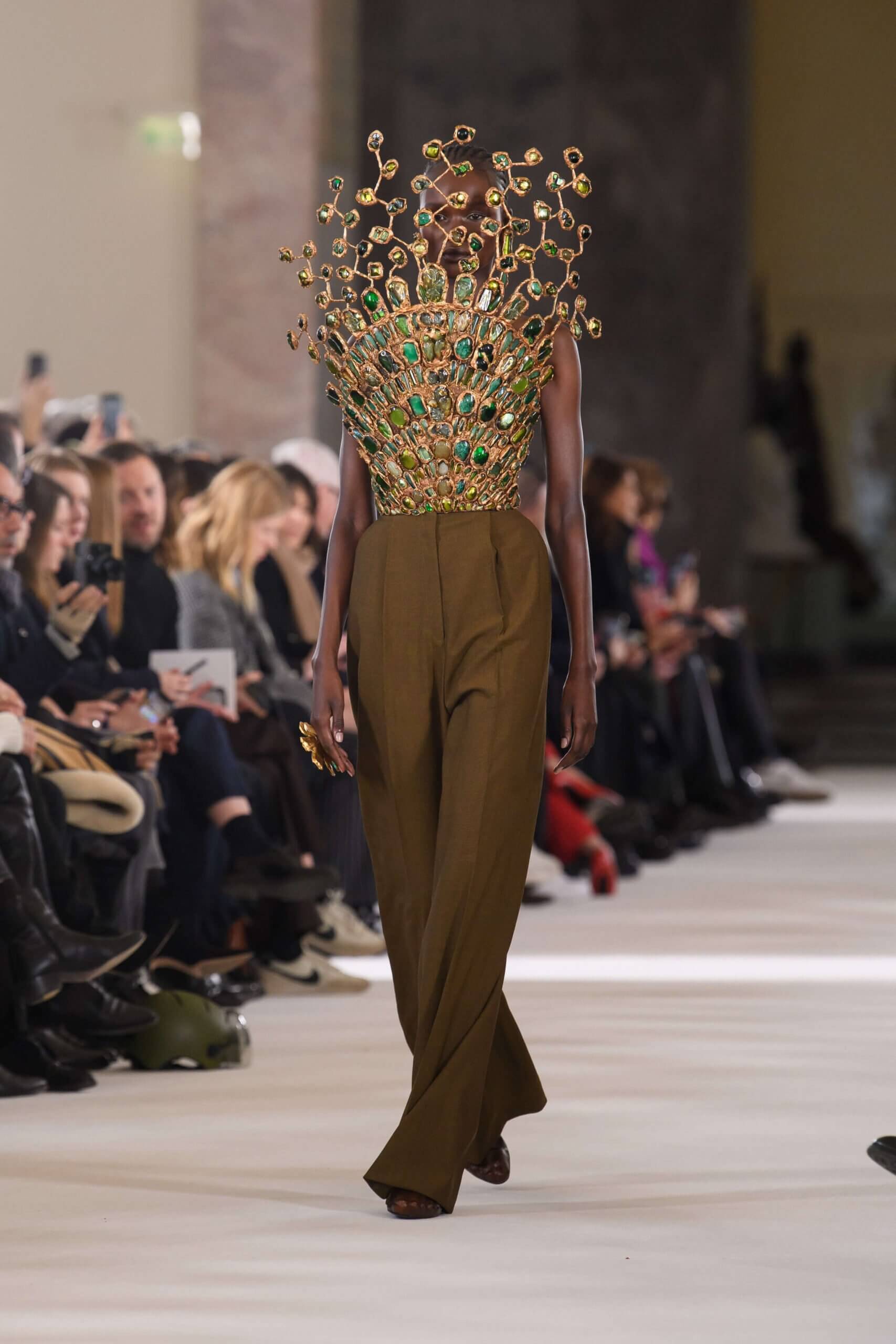 One word: epic. And Daniel Roseberry does it very nicely at Schiaparelli. Even before the show began at the Petit Palais, Kylie Jenner with faux obv. lion’s head and Doja Cat in top-to-toe tiny red paillettes had dialed things up. Entitled Inferno – hence the devilish Doja – Dante’s 1308 poem The Divine Comedy had inspired Roseberry. And while the themes of doubt, torment and risk taking were explored by its creator these looks were emphatically fantastical. Accomplished. Expert. Exquisite. The leopard, the lion (hence Jenner) and the she-wolf of the original poem representing lust, pride and avarice were faux-taxidermied into amazing looks made by hand from foam, and resin and worn by the originals Shalom Harlow and Naomi Campbell. Irina Shayk in the mix too. The program notes delivered a thoughtful inner wrestling with the nature of creativity on Roseberry’s part but here it all was, excellence, a wonderland of look after look that erupted in a standing ovation. From theose secretly corseted waists in the expertly tailored jackets to the sculptural, this couture explored textures of broken glass, shell marquetry plastron, brass keyhole detailing, and rooster feathers. It was awesome.