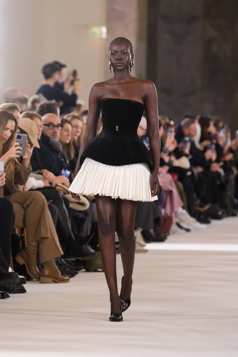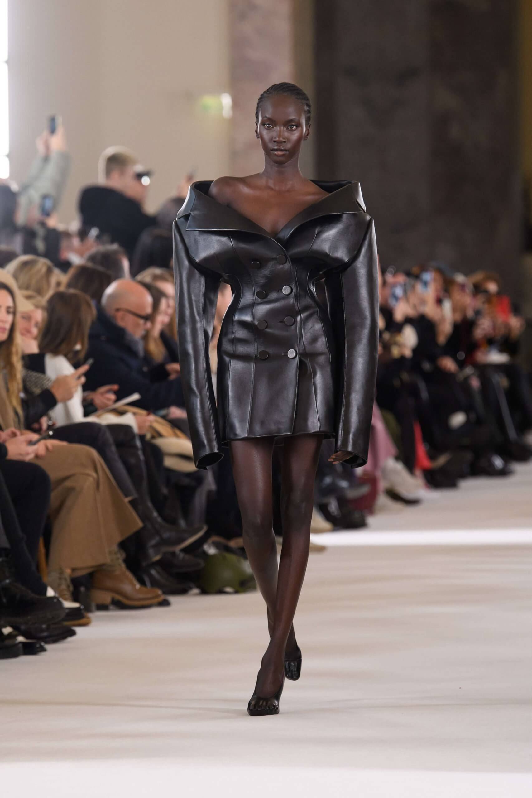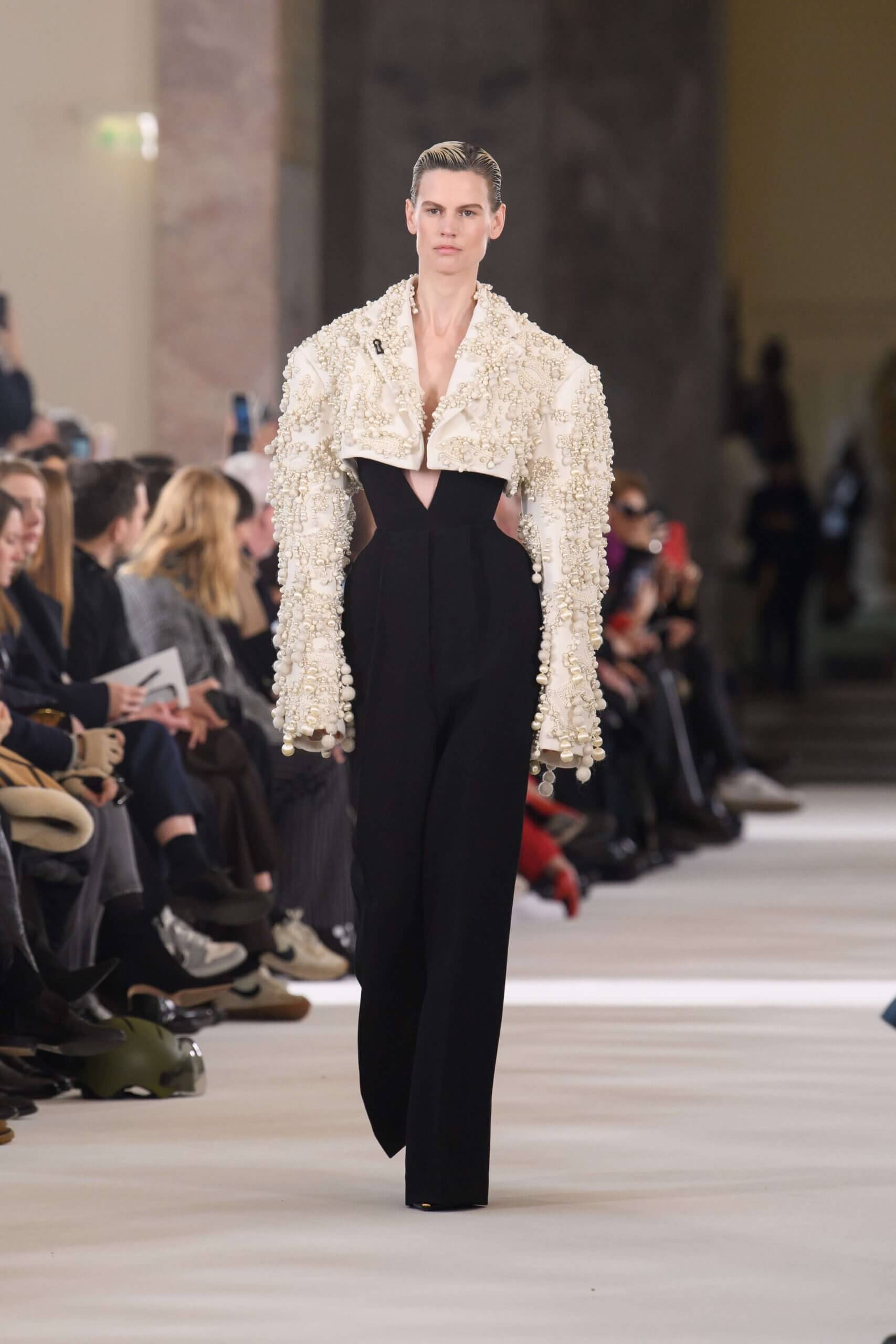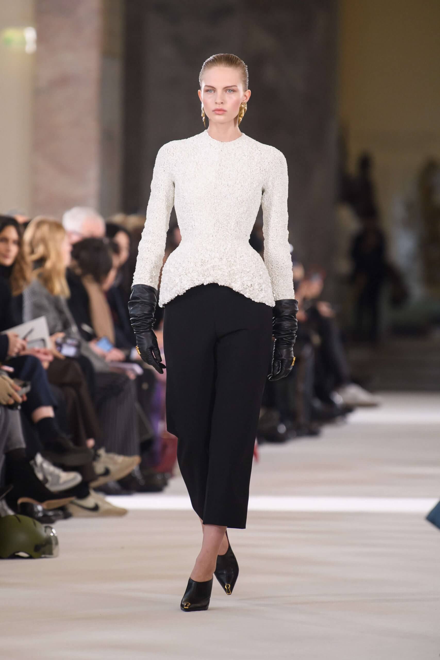 One word: epic. And Daniel Roseberry does it very nicely at Schiaparelli. Even before the show began at the Petit Palais, Kylie Jenner with faux obv. lion’s head and Doja Cat in top-to-toe tiny red paillettes had dialed things up. Entitled Inferno – hence the devilish Doja – Dante’s 1308 poem The Divine Comedy had inspired Roseberry. And while the themes of doubt, torment and risk taking were explored by its creator these looks were emphatically fantastical. Accomplished. Expert. Exquisite. The leopard, the lion (hence Jenner) and the she-wolf of the original poem representing lust, pride and avarice were faux-taxidermied into amazing looks made by hand from foam, and resin and worn by the originals Shalom Harlow and Naomi Campbell. Irina Shayk in the mix too. The program notes delivered a thoughtful inner wrestling with the nature of creativity on Roseberry’s part but here it all was, excellence, a wonderland of look after look that erupted in a standing ovation. From theose secretly corseted waists in the expertly tailored jackets to the sculptural, this couture explored textures of broken glass, shell marquetry plastron, brass keyhole detailing, and rooster feathers. It was awesome.