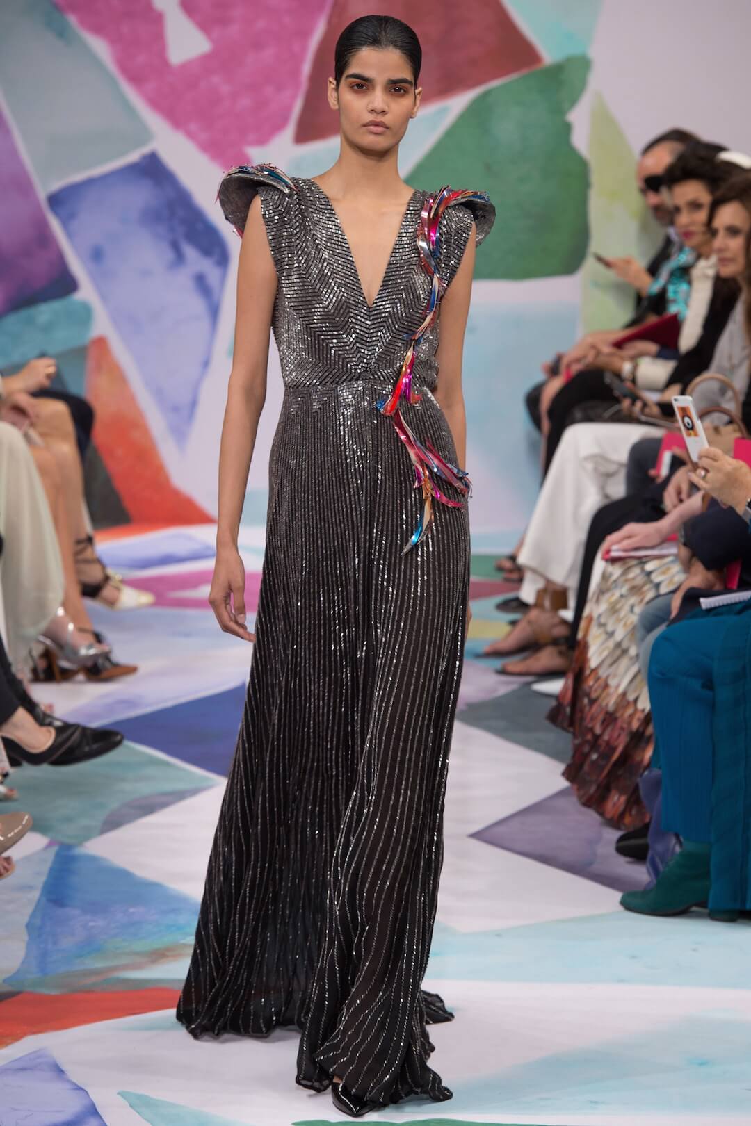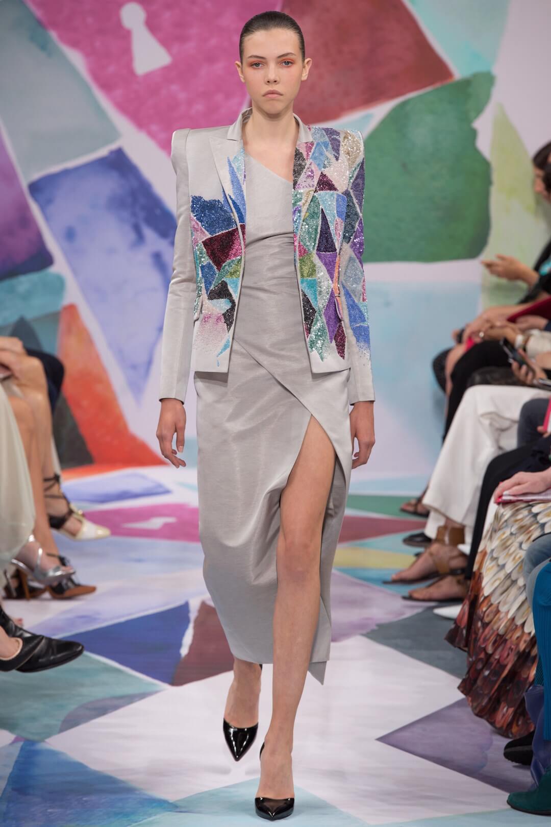 Celestial bodies. Circus in space? Bertrand Guyon’s Elsa Schiaparelli collection was a sort of cubist reimagining of the future. And the future was bright. Bright pink. Well the carpet was on the way in, anyway, perfect for a pre-show couture mince. The whole thing, according to the press release, was a respectful homage to Elsa Schiaparelli’s famed Circus collection – think harlequin triangles, suns and moons, zodiac galaxies that expanded over floating chiffon. It was about dresses, really – fantastical, surreal concoctions that played with proportion – some raised at the shoulders, others cinched at the waist with little metal sculptures. That said, piece of the day thus far has to go to the embellished bloomers (or, as Alexander Fury wrote, couture diaper) – we didn’t know we needed such an item in our lives, but now we do. This was fantasy clothing. A perfect start to a Monday morning. Take us away to the circus, Bertrand.