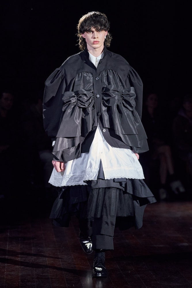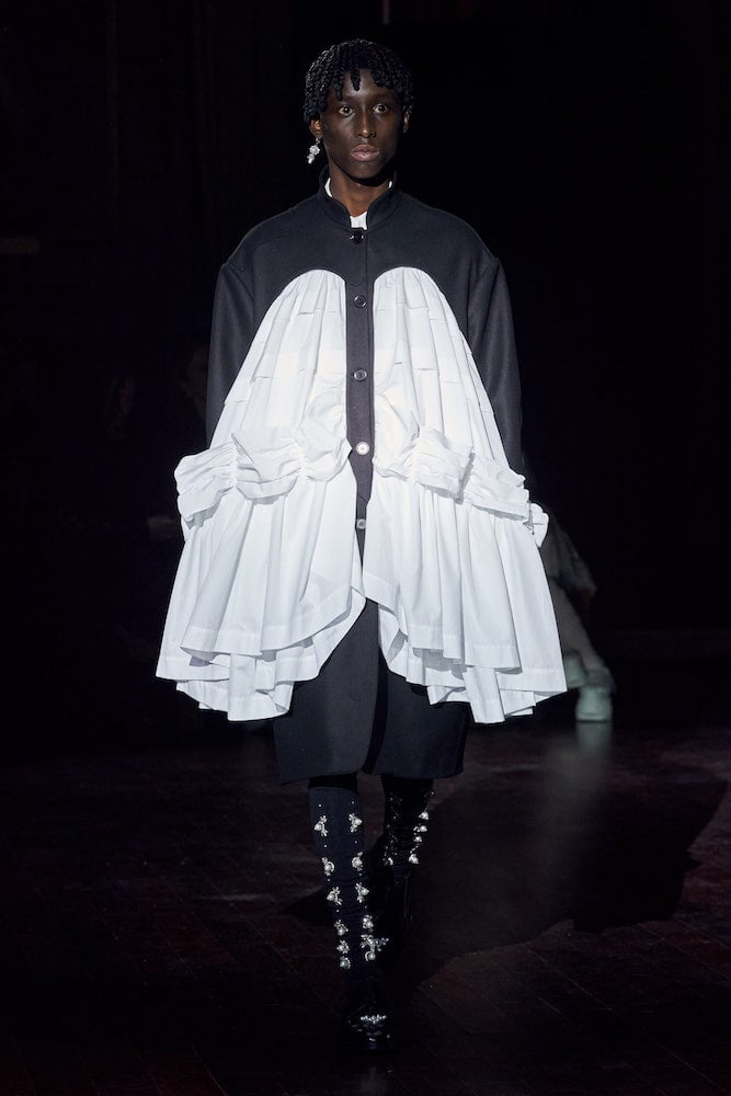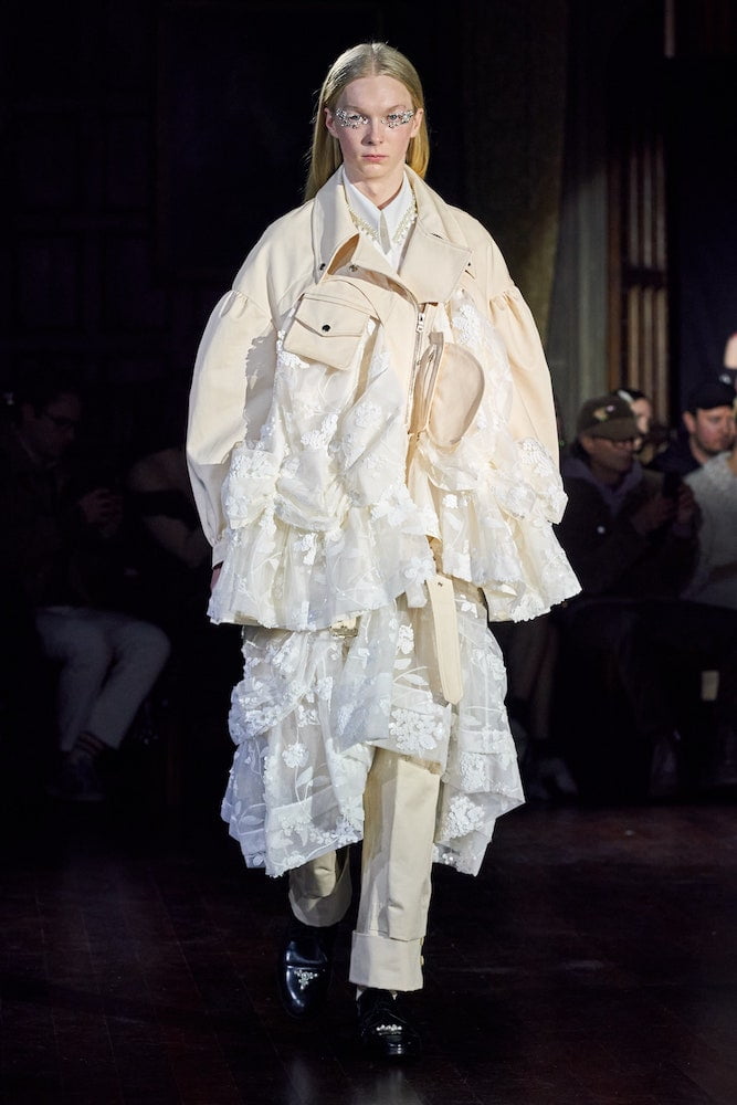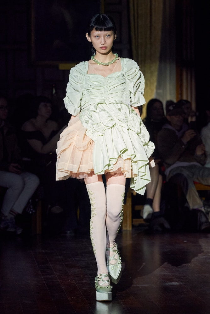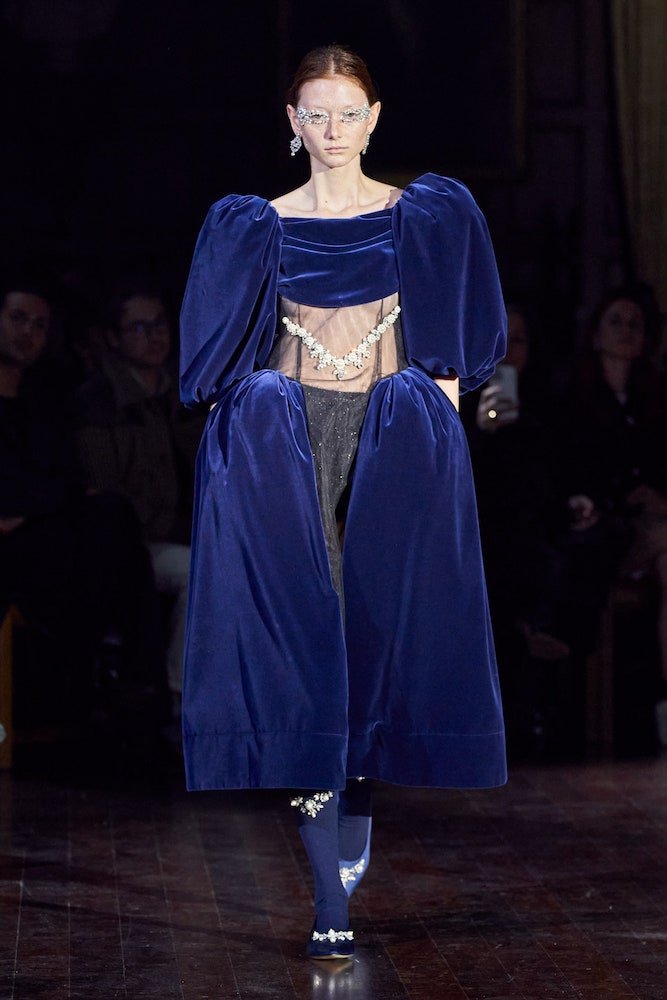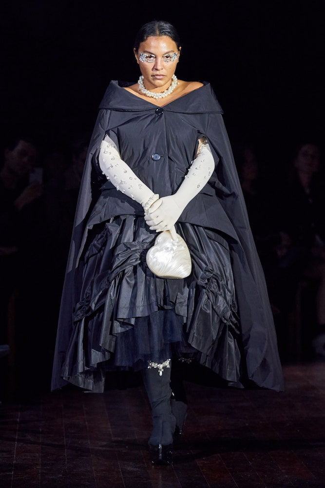 Simone Rocha’s clients crammed into the historic grandeur of London’s medieval Inns of Court. In their flounced and frilled finery, dripping in pearl embellishments, they looked like Victorian dolls come to life. Her inspiration came from an Irish fairytale Children of the Lir, about an evil Queen who turns her stepchildren into swans. They live as birds for 900 years before becoming human again and dying.