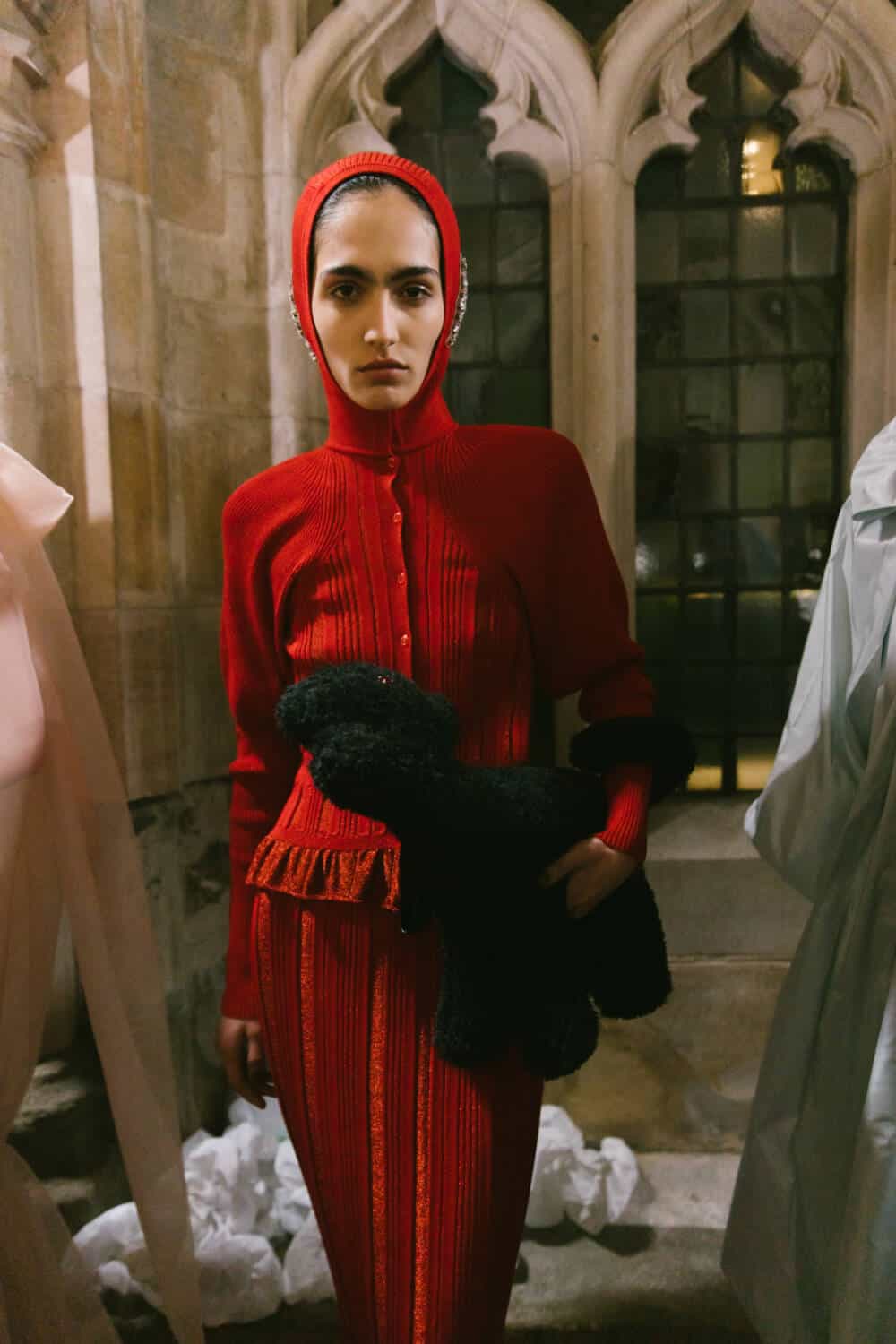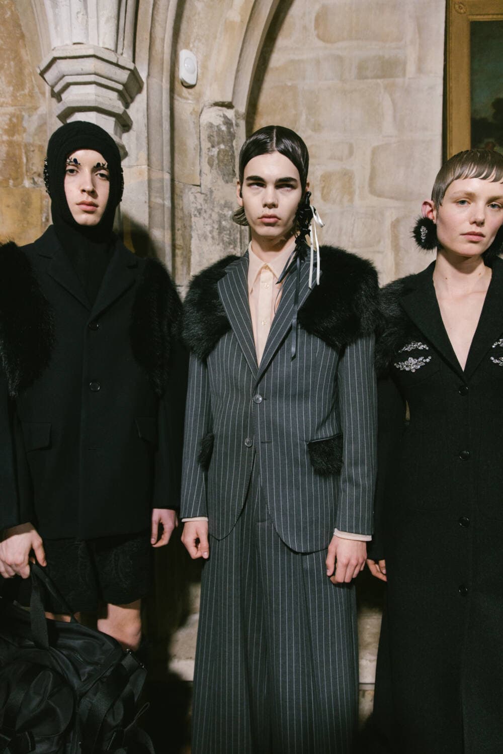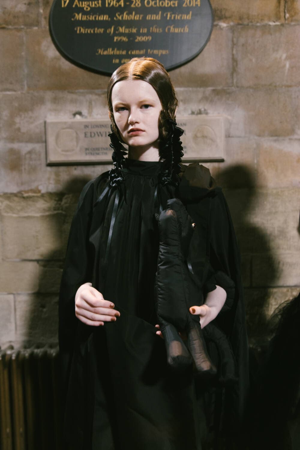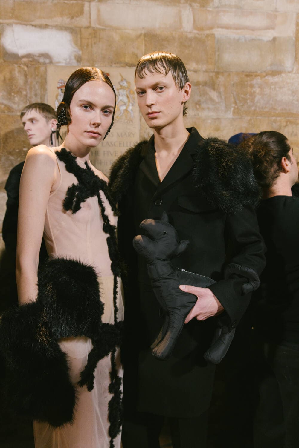 This was the final part of a triptych of collections that Simone Rocha worked on simultaneously. She described last season’s SS24’ show as “the dress rehearsal” her Gaultier couture collection, shown in July, as “the parade” and this AW24 offering as “the wake”. Presenting in a medieval church in East London, with the air perfumed with incense, Rocha took a deep dive into fashion history. The designer studied preserved garments in archive collections including Queen Victoria’s mourning dress, which is stored at Hampton Court Palace. The theme sat well with her trademark poetic, Irish gothic aesthetic. It was the element of protection from those historical garments that she felt was most relevant in 2024. “The fact that these clothes were very much her security blanket and like a uniform,“ said the designer. During her research she became interested in underwear and the garments closest to the skin, crafting beautiful corset jackets and coats. Then she became fascinated by the skin itself – expressing its beauty and vulnerability with a series of sensual veiled and sheer looks. Little toy-dog bags were an interpretation of a ‘grim’ – a canine charm associated with death. They evolved from an embroidery on tulle, into the playful fluffy zip top totes, that brought to mind a child’s pyjama case. The designer explained she wanted a naive moment to balance the grown-up elements of the wake. Faux fur bustles and bejewelled ear muffs, added to the charm whilst a Crocs collaboration – chunky plastic clogs glinting with Rocha’s signature pearl charms – also brought a 21st Century quirk, and underlined the accessories prowess that has supercharged her brand.