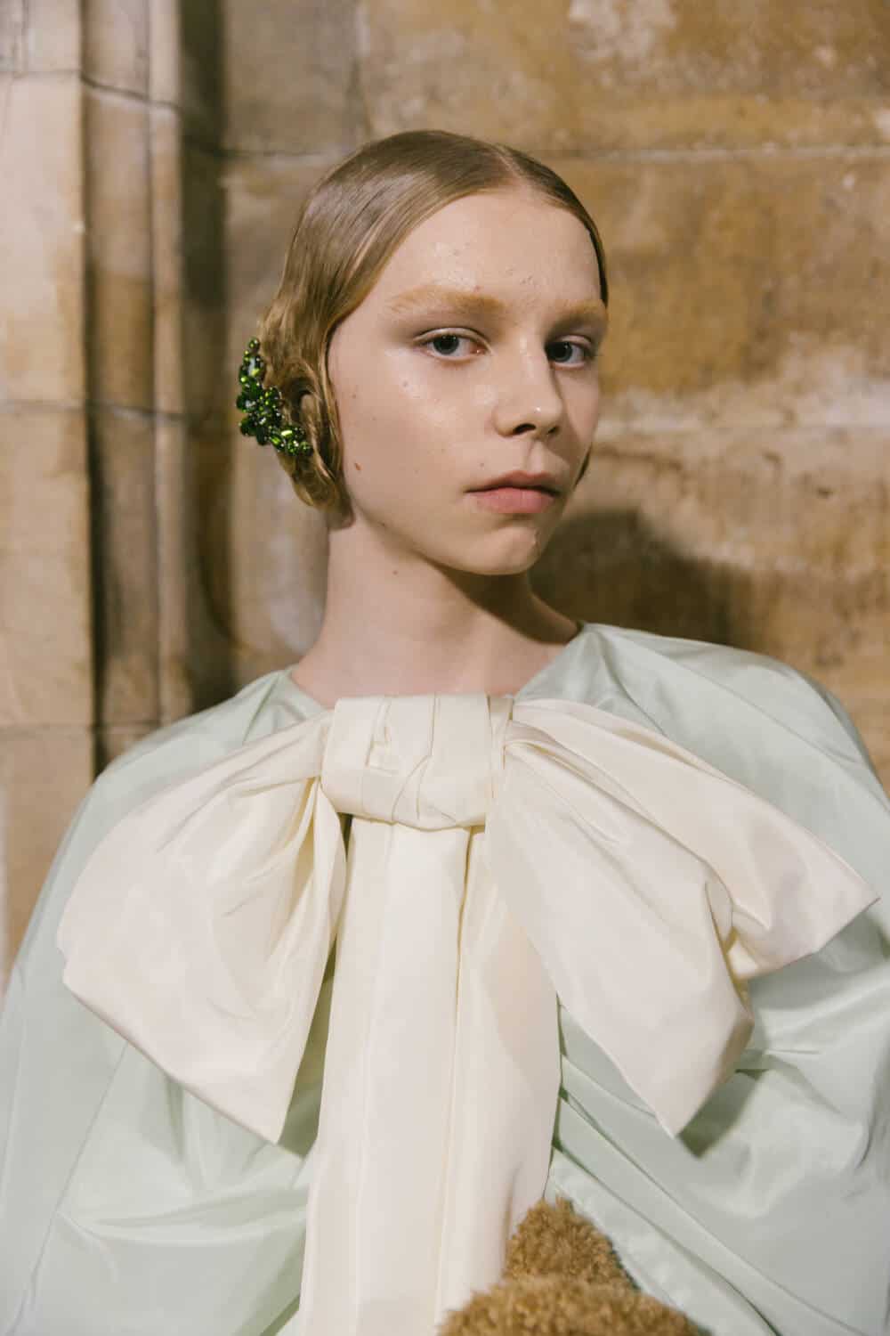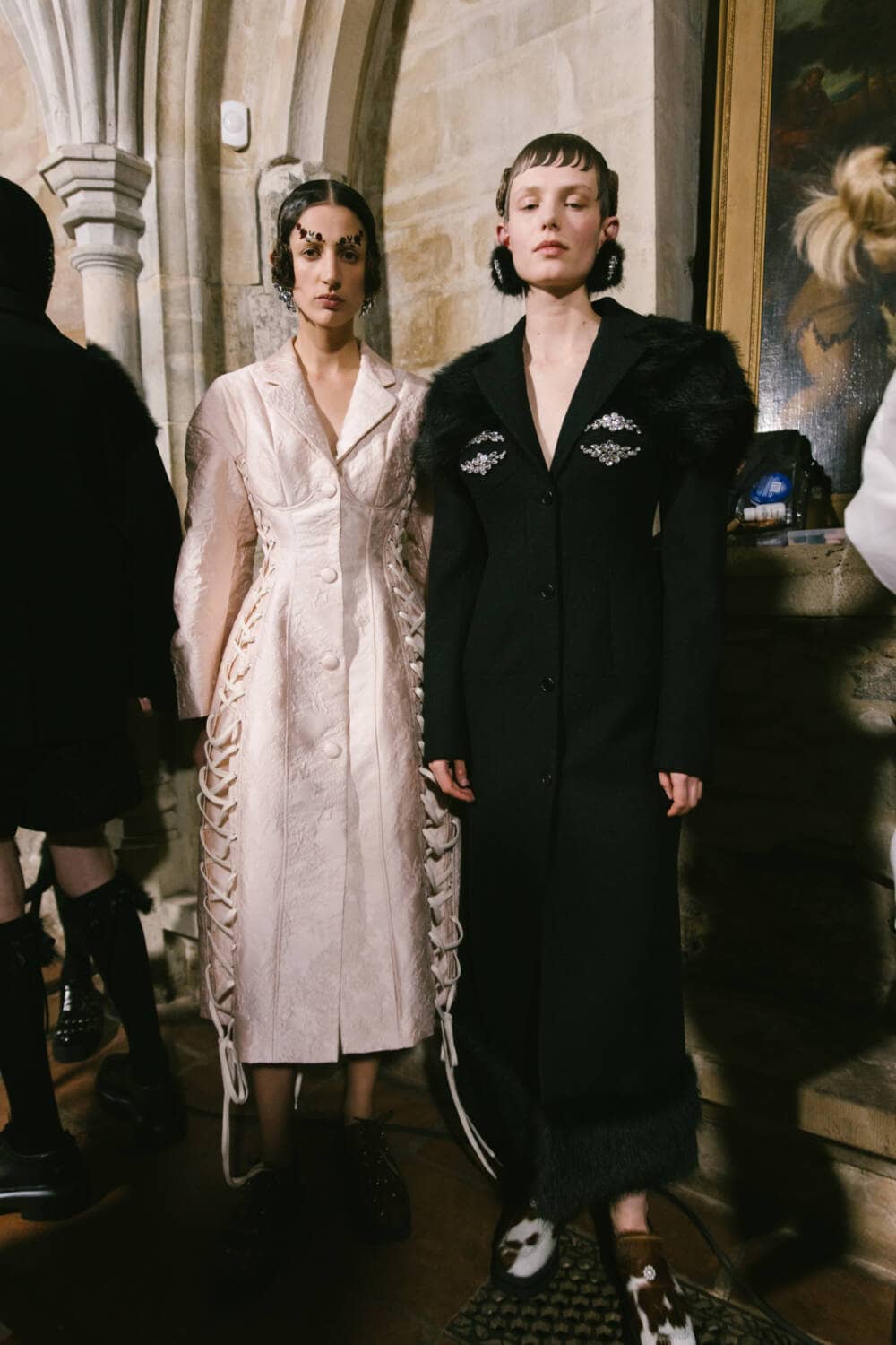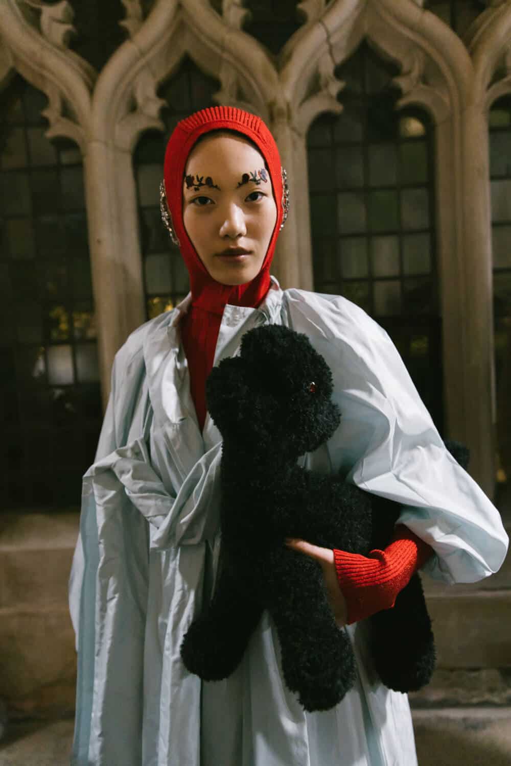 This was the final part of a triptych of collections that Simone Rocha worked on simultaneously. She described last season’s SS24’ show as “the dress rehearsal” her Gaultier couture collection, shown in July, as “the parade” and this AW24 offering as “the wake”. Presenting in a medieval church in East London, with the air perfumed with incense, Rocha took a deep dive into fashion history. The designer studied preserved garments in archive collections including Queen Victoria’s mourning dress, which is stored at Hampton Court Palace. The theme sat well with her trademark poetic, Irish gothic aesthetic. It was the element of protection from those historical garments that she felt was most relevant in 2024. “The fact that these clothes were very much her security blanket and like a uniform,“ said the designer. During her research she became interested in underwear and the garments closest to the skin, crafting beautiful corset jackets and coats. Then she became fascinated by the skin itself – expressing its beauty and vulnerability with a series of sensual veiled and sheer looks. Little toy-dog bags were an interpretation of a ‘grim’ – a canine charm associated with death. They evolved from an embroidery on tulle, into the playful fluffy zip top totes, that brought to mind a child’s pyjama case. The designer explained she wanted a naive moment to balance the grown-up elements of the wake. Faux fur bustles and bejewelled ear muffs, added to the charm whilst a Crocs collaboration – chunky plastic clogs glinting with Rocha’s signature pearl charms – also brought a 21st Century quirk, and underlined the accessories prowess that has supercharged her brand.