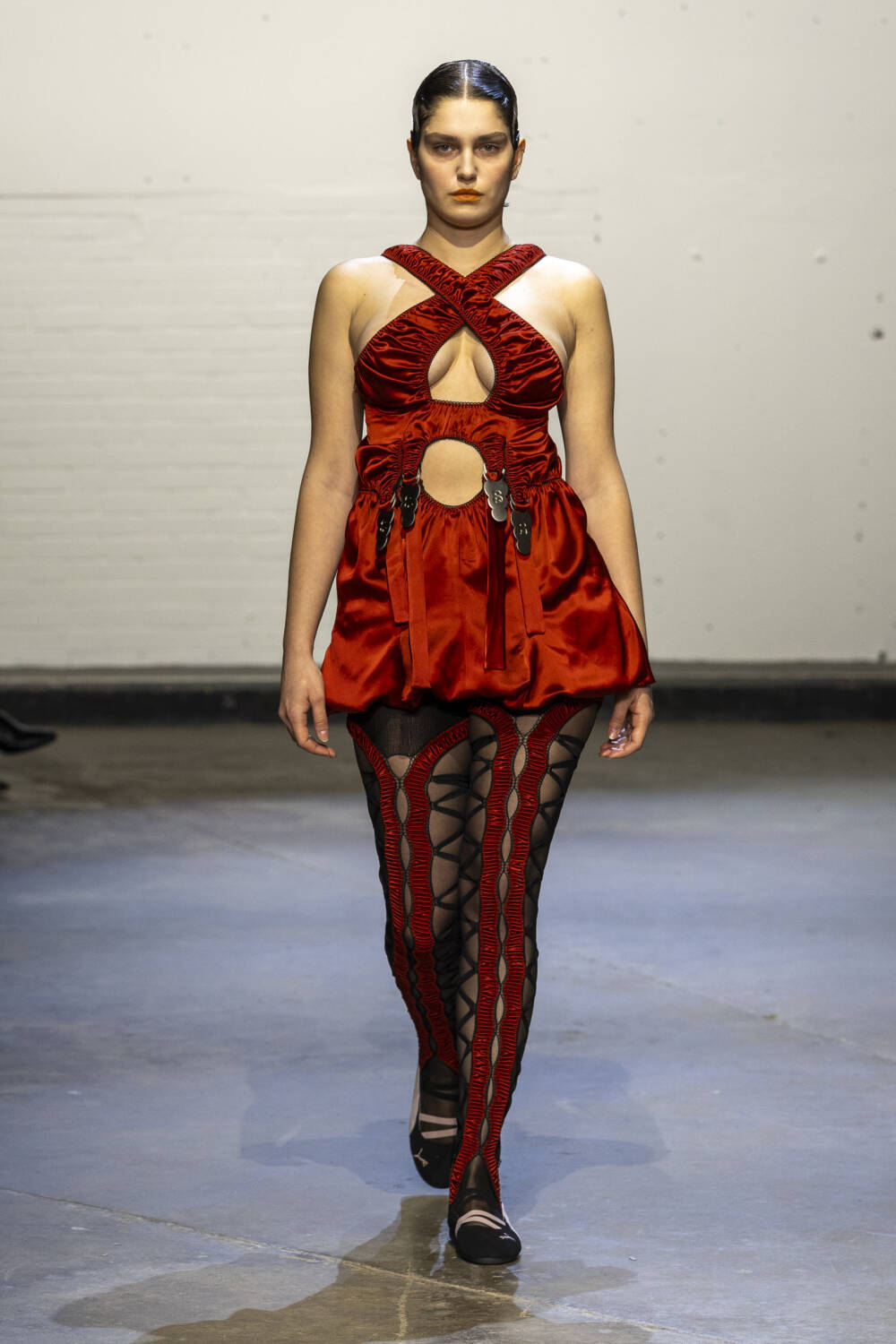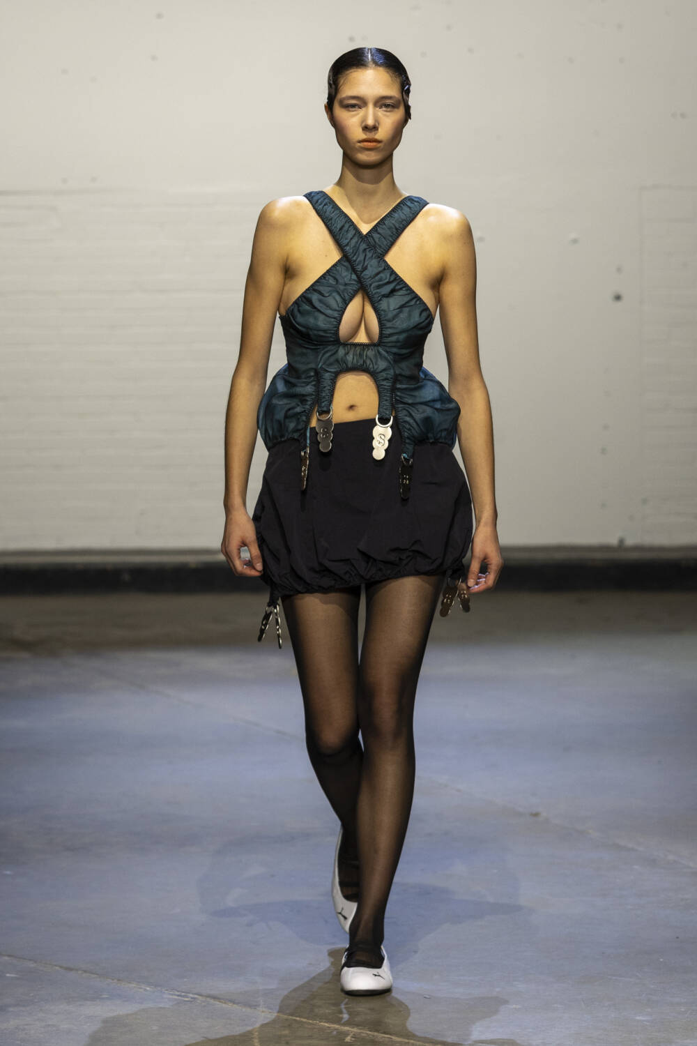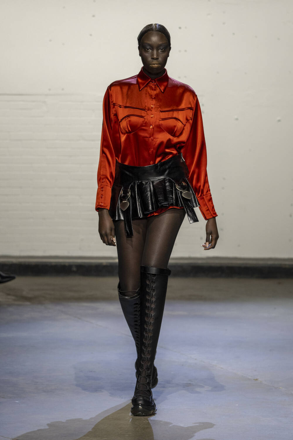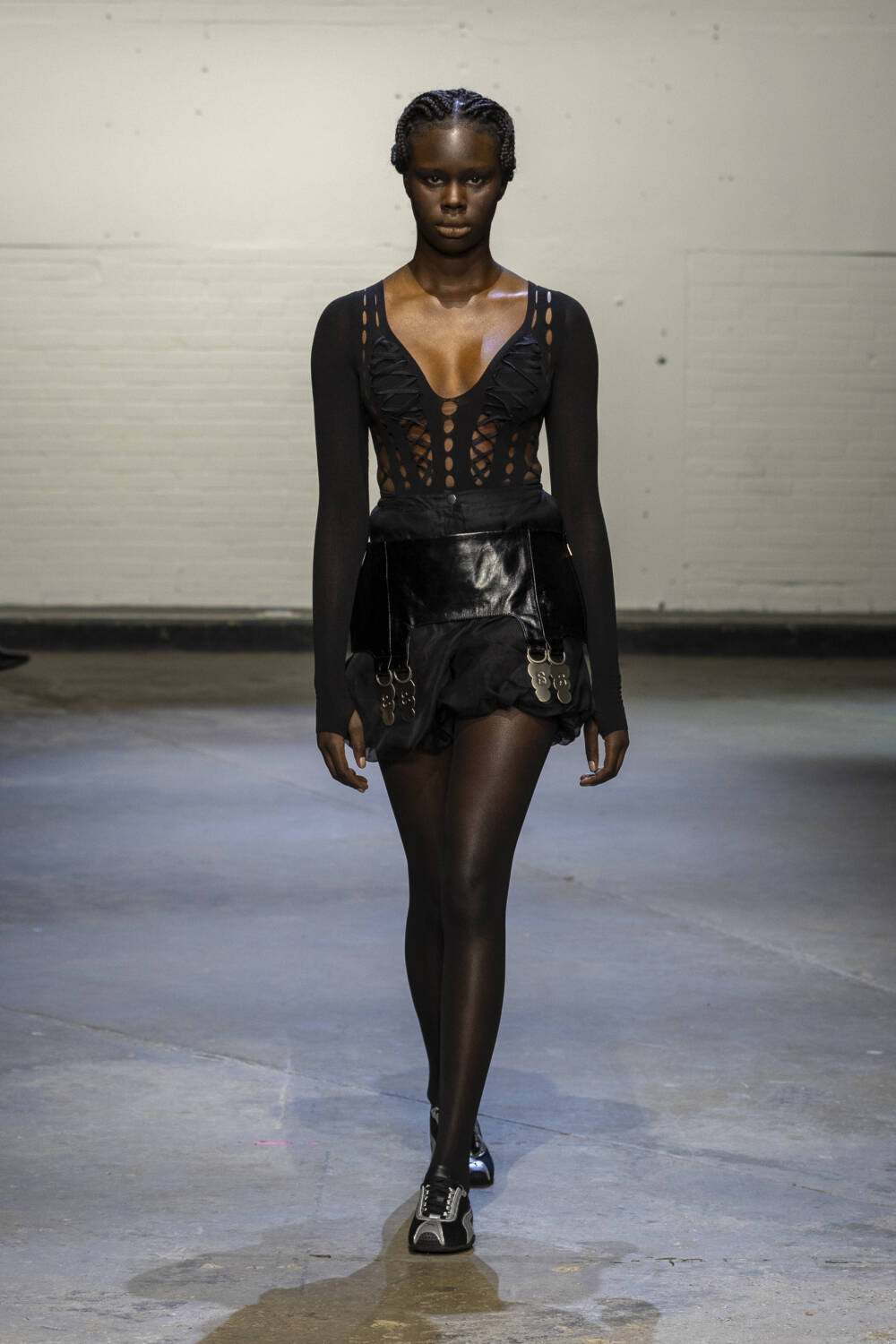 Her signature structured shirting returned, this time cut in crisp deadstock nylon with sculptural yoke detailing, while a pencil skirt with a bubble hem brought a new sense of drama. Sensuality pulsed through the collection – silk organza layered in black and turquoise mimicked the candlelit glow of a Visionaire editorial, while leather micro-culottes and cropped trench coats played with power and provocation. The brand’s iconic shibari knits evolved into sheer, body-tracing silhouettes, complete with Amber bead embellishments and slashes of scarlet satin.