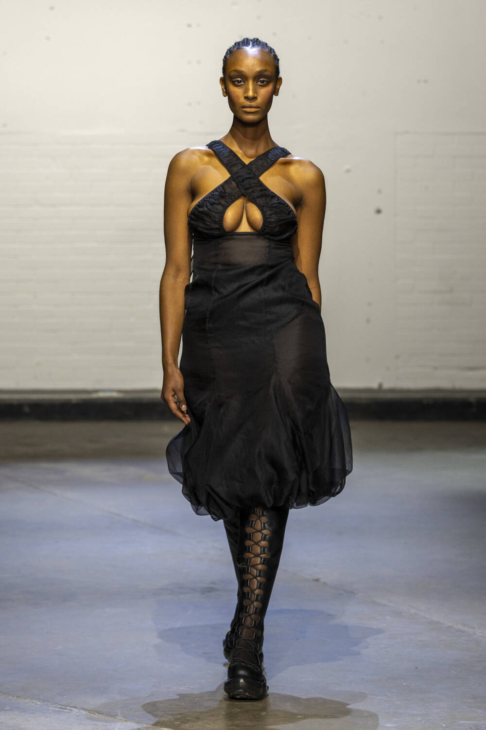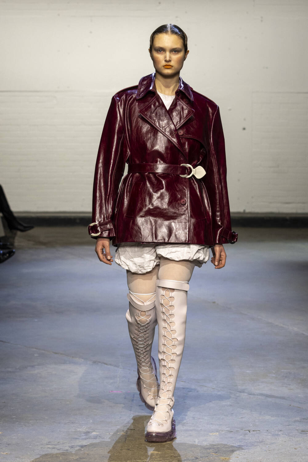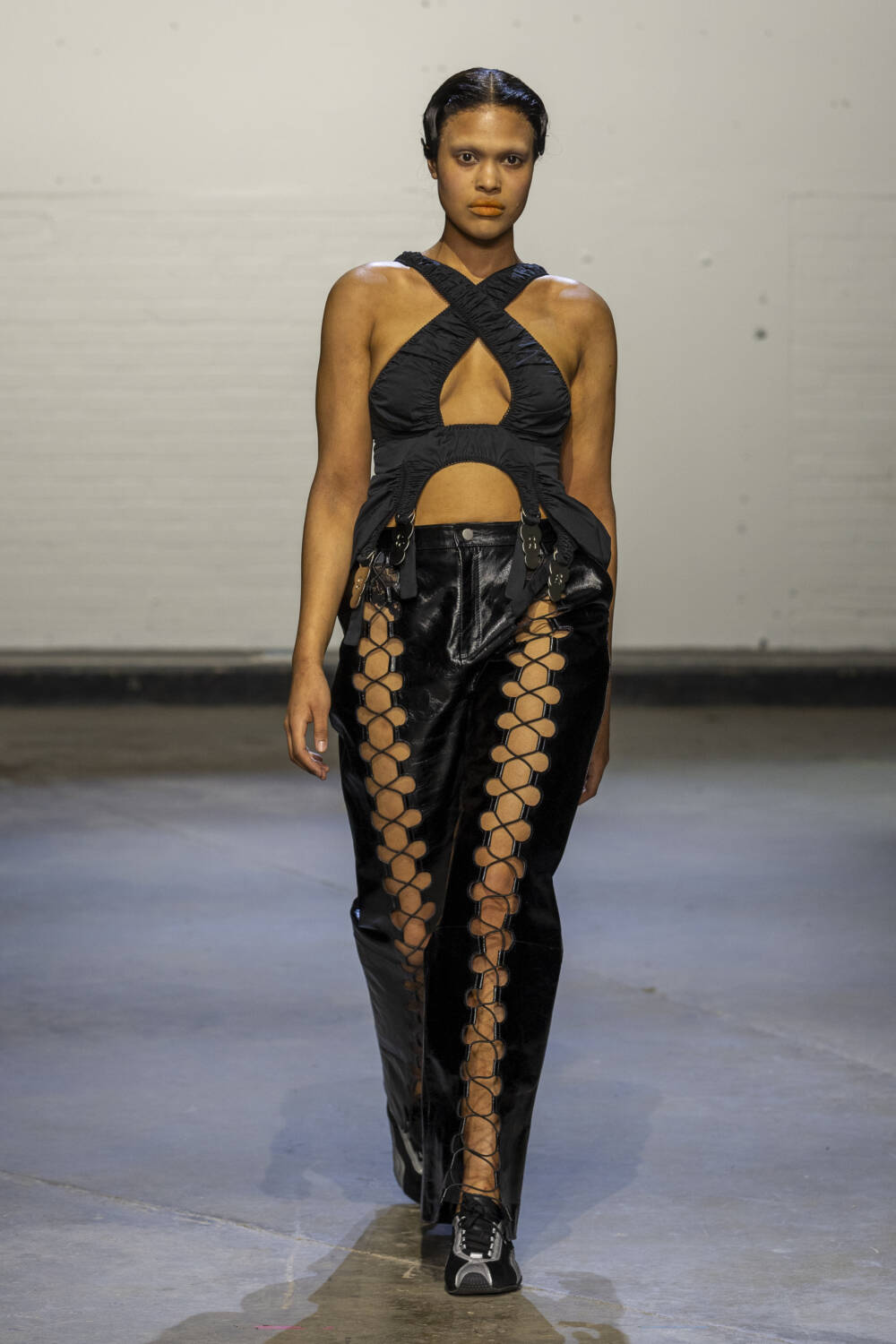 Her signature structured shirting returned, this time cut in crisp deadstock nylon with sculptural yoke detailing, while a pencil skirt with a bubble hem brought a new sense of drama. Sensuality pulsed through the collection – silk organza layered in black and turquoise mimicked the candlelit glow of a Visionaire editorial, while leather micro-culottes and cropped trench coats played with power and provocation. The brand’s iconic shibari knits evolved into sheer, body-tracing silhouettes, complete with Amber bead embellishments and slashes of scarlet satin.