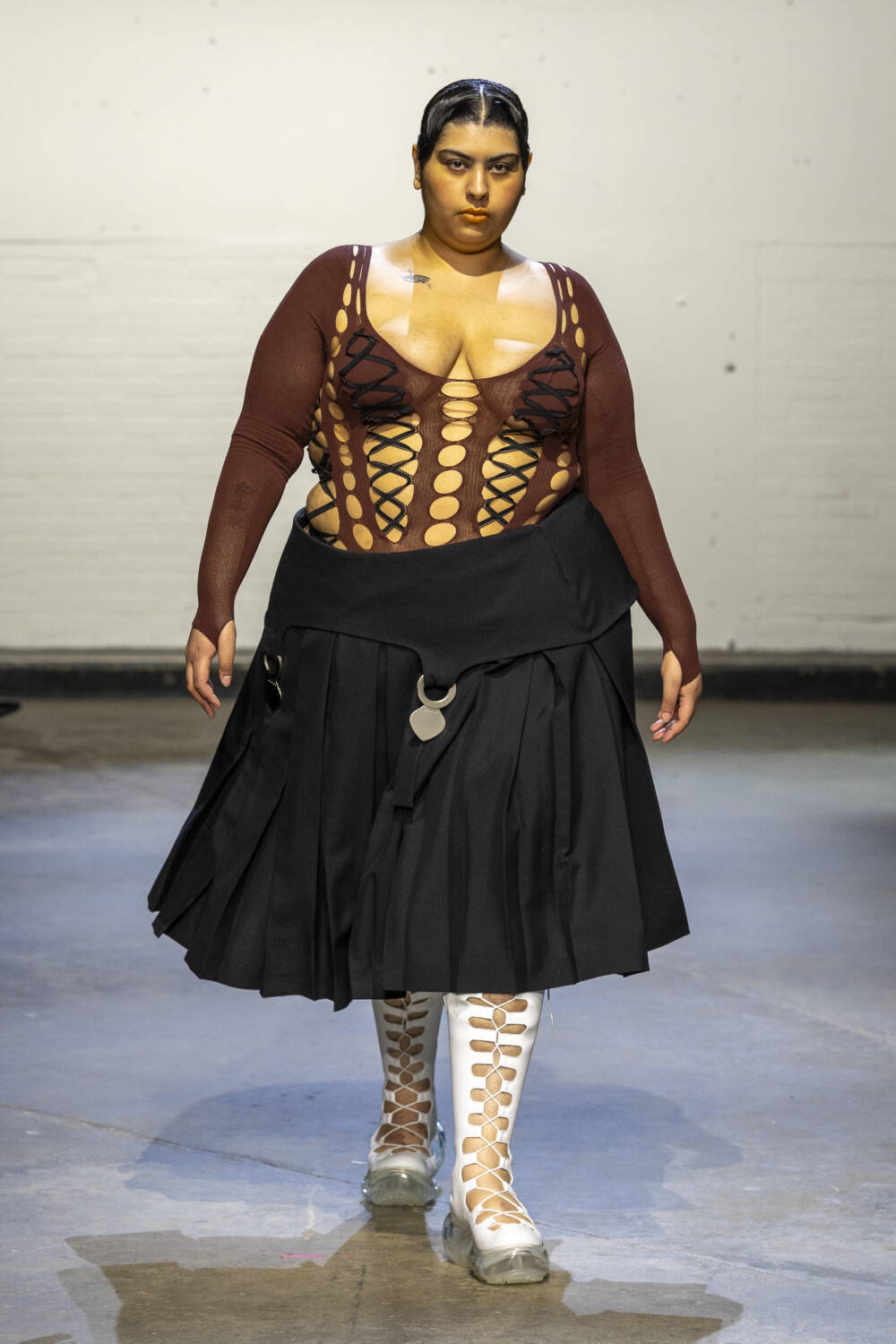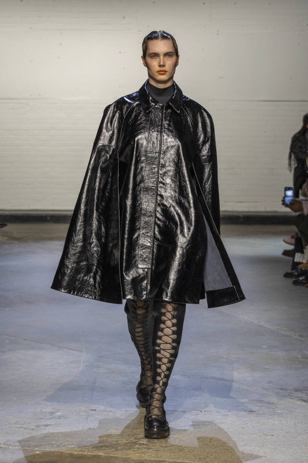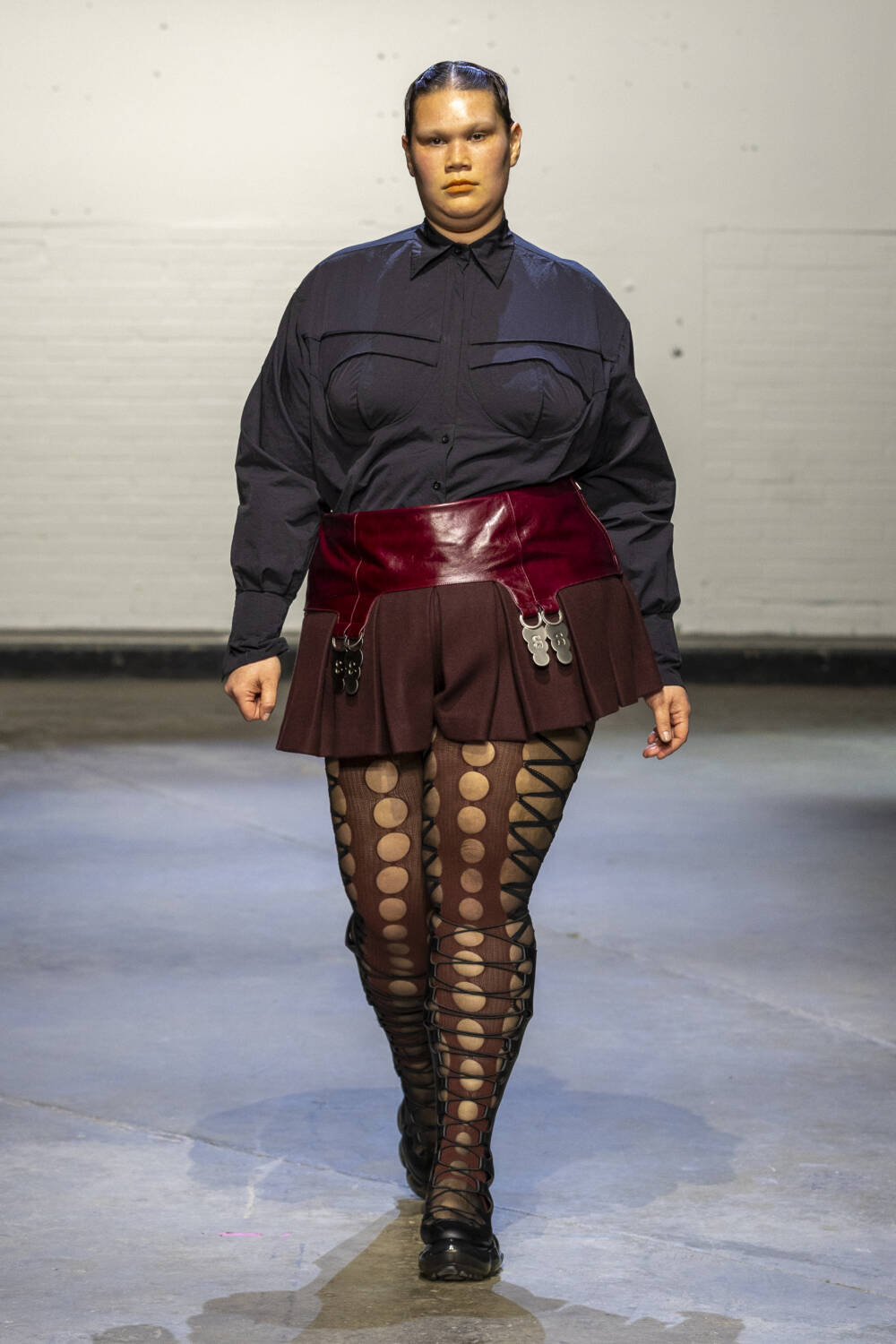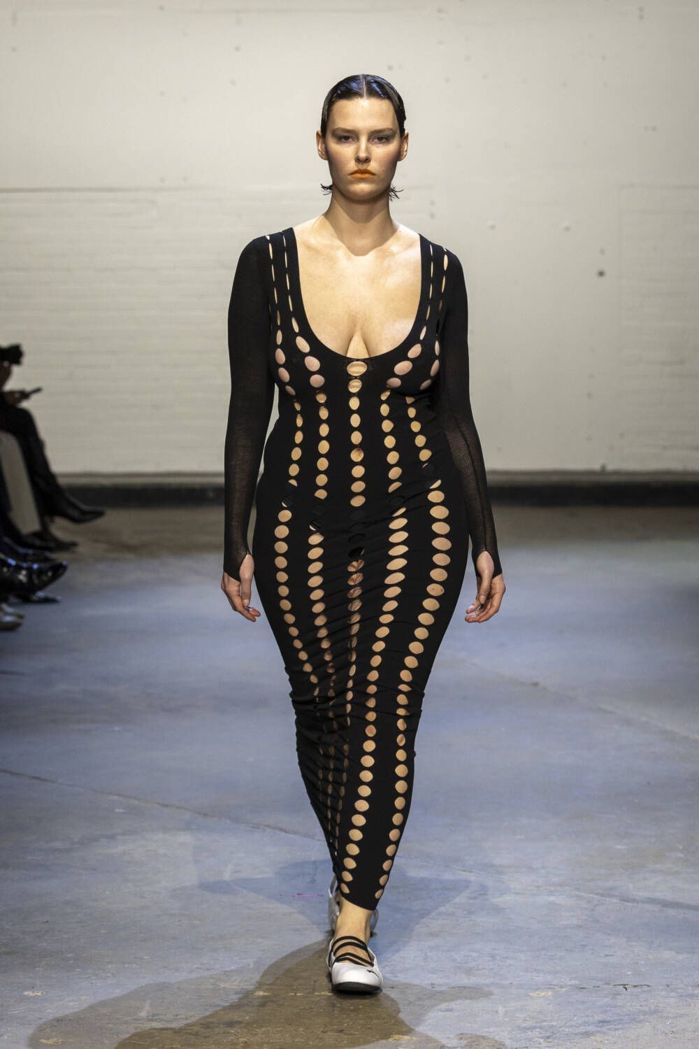 Her signature structured shirting returned, this time cut in crisp deadstock nylon with sculptural yoke detailing, while a pencil skirt with a bubble hem brought a new sense of drama. Sensuality pulsed through the collection – silk organza layered in black and turquoise mimicked the candlelit glow of a Visionaire editorial, while leather micro-culottes and cropped trench coats played with power and provocation. The brand’s iconic shibari knits evolved into sheer, body-tracing silhouettes, complete with Amber bead embellishments and slashes of scarlet satin.