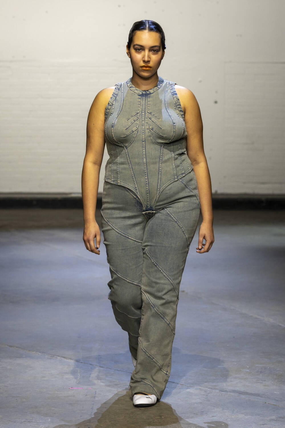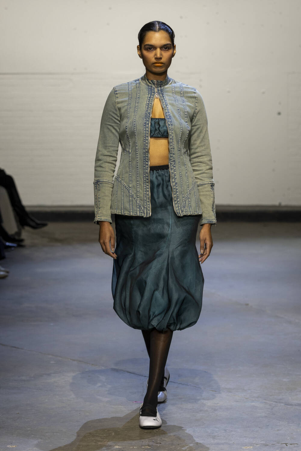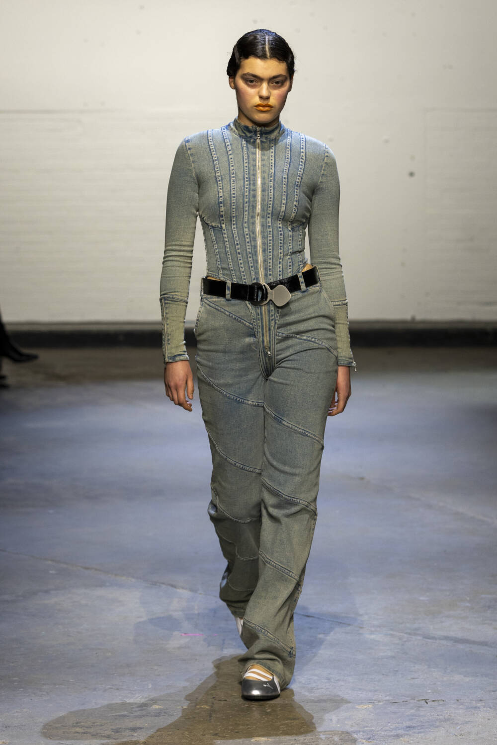 Denim and tailoring made a stronger statement – high-collared jackets, darted leotards, and spiral-seamed jeans exuded effortless edge. Footwear, a collaboration with Grounds and Puma, merged traditional Irish dance references with modern athleticism for sporty sneaks and alien-esque stompers.