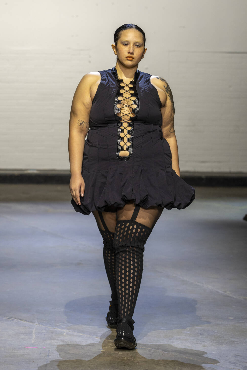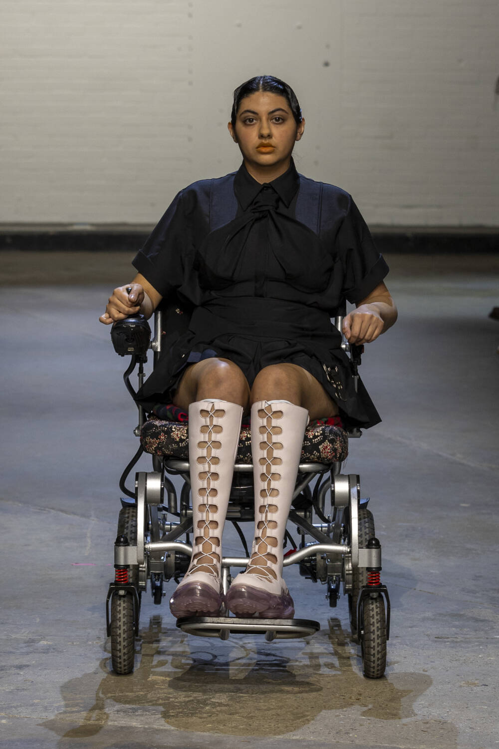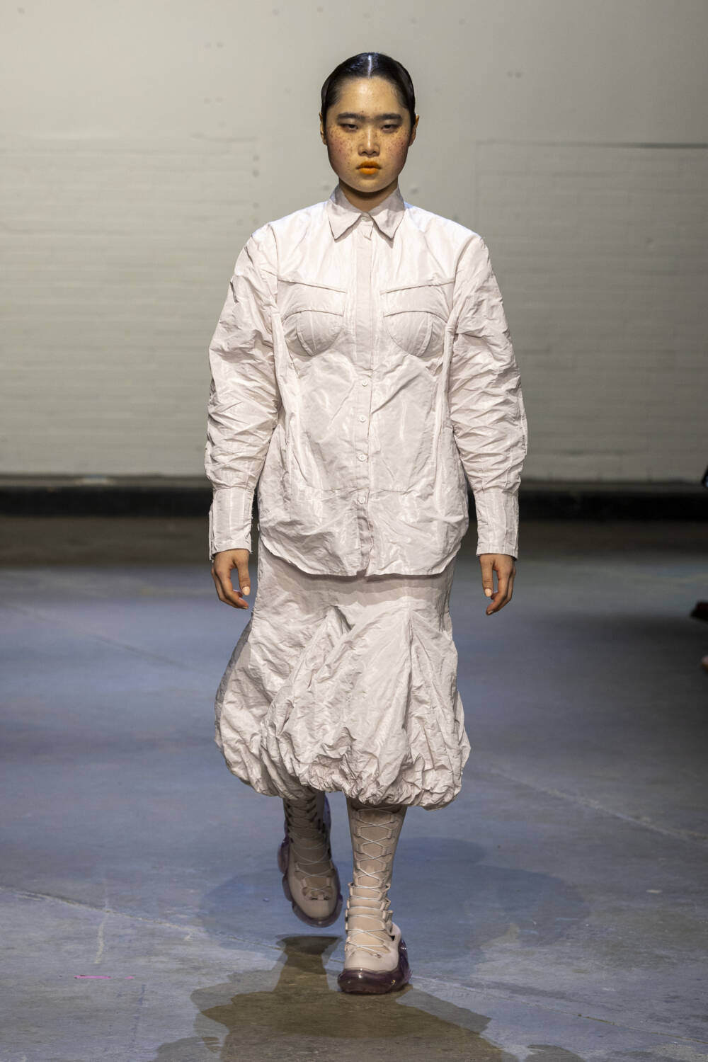 Denim and tailoring made a stronger statement – high-collared jackets, darted leotards, and spiral-seamed jeans exuded effortless edge. Footwear, a collaboration with Grounds and Puma, merged traditional Irish dance references with modern athleticism for sporty sneaks and alien-esque stompers.