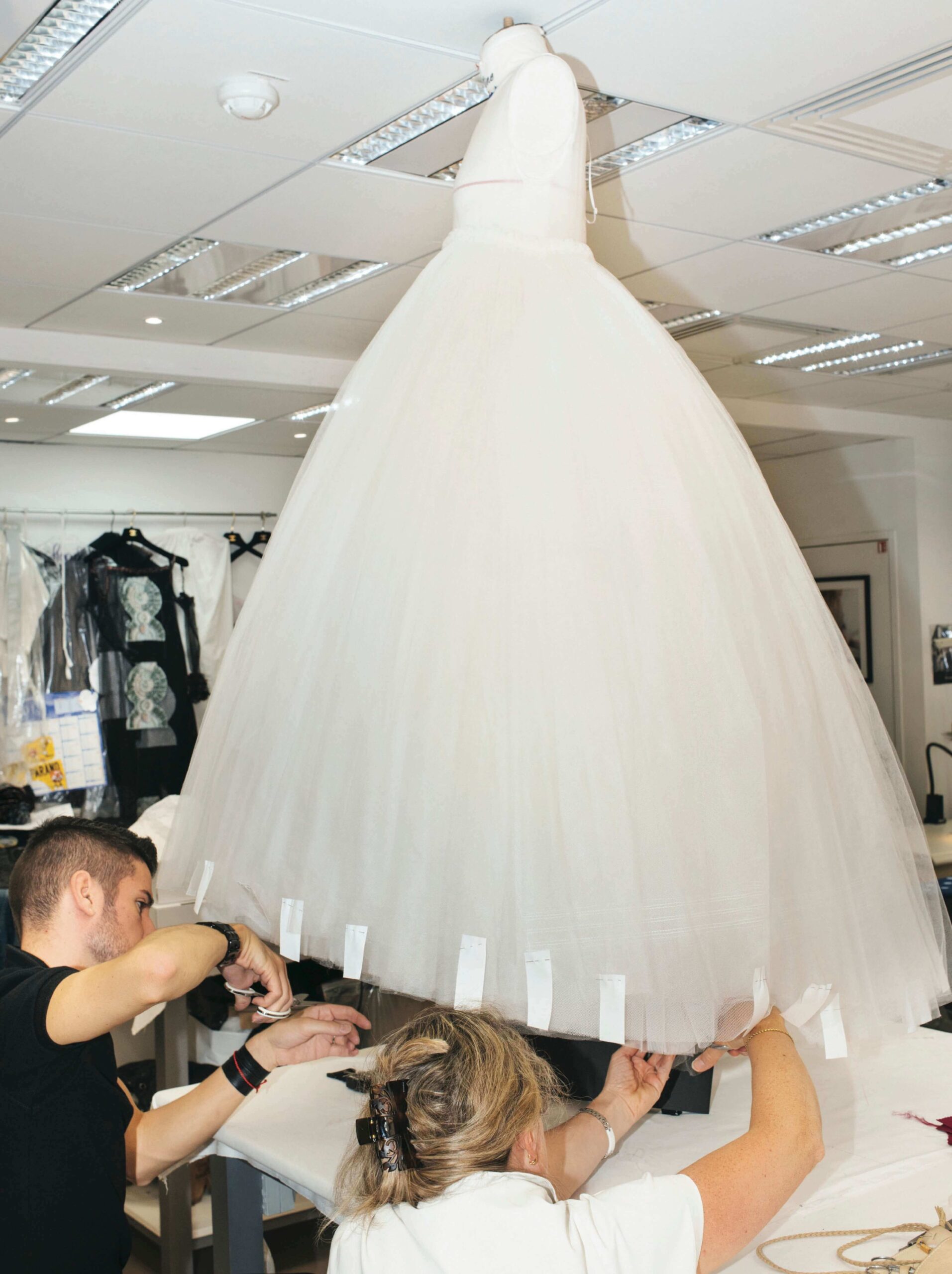 “It’s part of your job to know the people in the atelier who you can give the sketch to that will be able to realise it in that way,” adds Douchez. She is the youngest première, leading a team of 42, many of whom are well below the age of 30. “It looks like a classroom when you walk into the atelier now,” comments Lagerfeld. “I try to hire people between 25 and 30 years old, to renew the people who are leaving,” says Douchez. “I thinks it’s good to have all these ages. The most experienced one can teach in a way, or help, the ones who are younger.” The youngest in Atelier Olivia is 16, on a two-year placement mid-studies. “France is great for that,” she smiles. The young are replacing the old – one of Douchez’s most experienced staff members retired after this collection; as her parting gift, she was tasked with creating the white silk Mikado wedding gown.