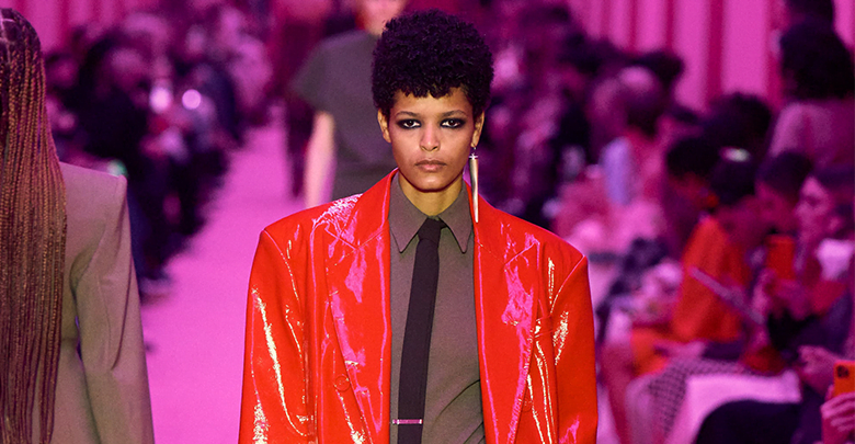 The brand’s AW22 collection is rooted in the femme fatales which have graced the big screen. From Hitchcock’s Vertigo to The Hunger, the collection highlights bygone erotic poster girls in an effort to explore female power dressing from the 1940s to now. Models came decorated in light-reflecting rhinestone dresses, Jessica Rabbit-inspired latex fittings and blazers – narrow at the waist with protruding shoulders matched – offset with pencil skirts taken from Sean Young’s magnified Blade Runner costume. As models sauntered beneath florescent pink lighting, a thumping soundtrack produced by Teho Teardo bled through the space, building on the venereal theme.
