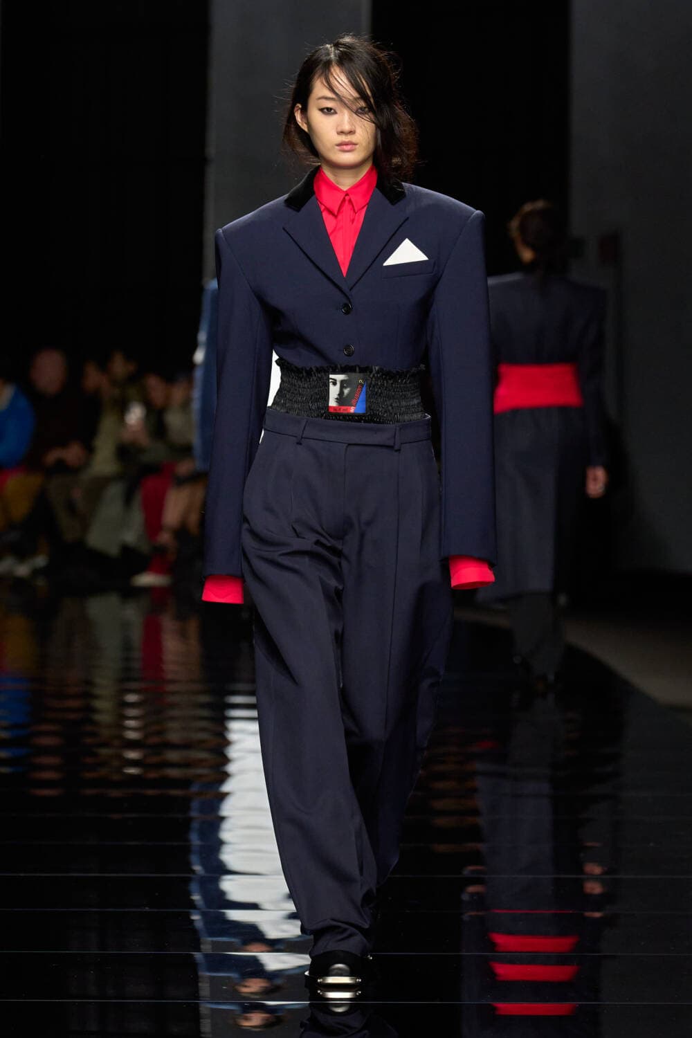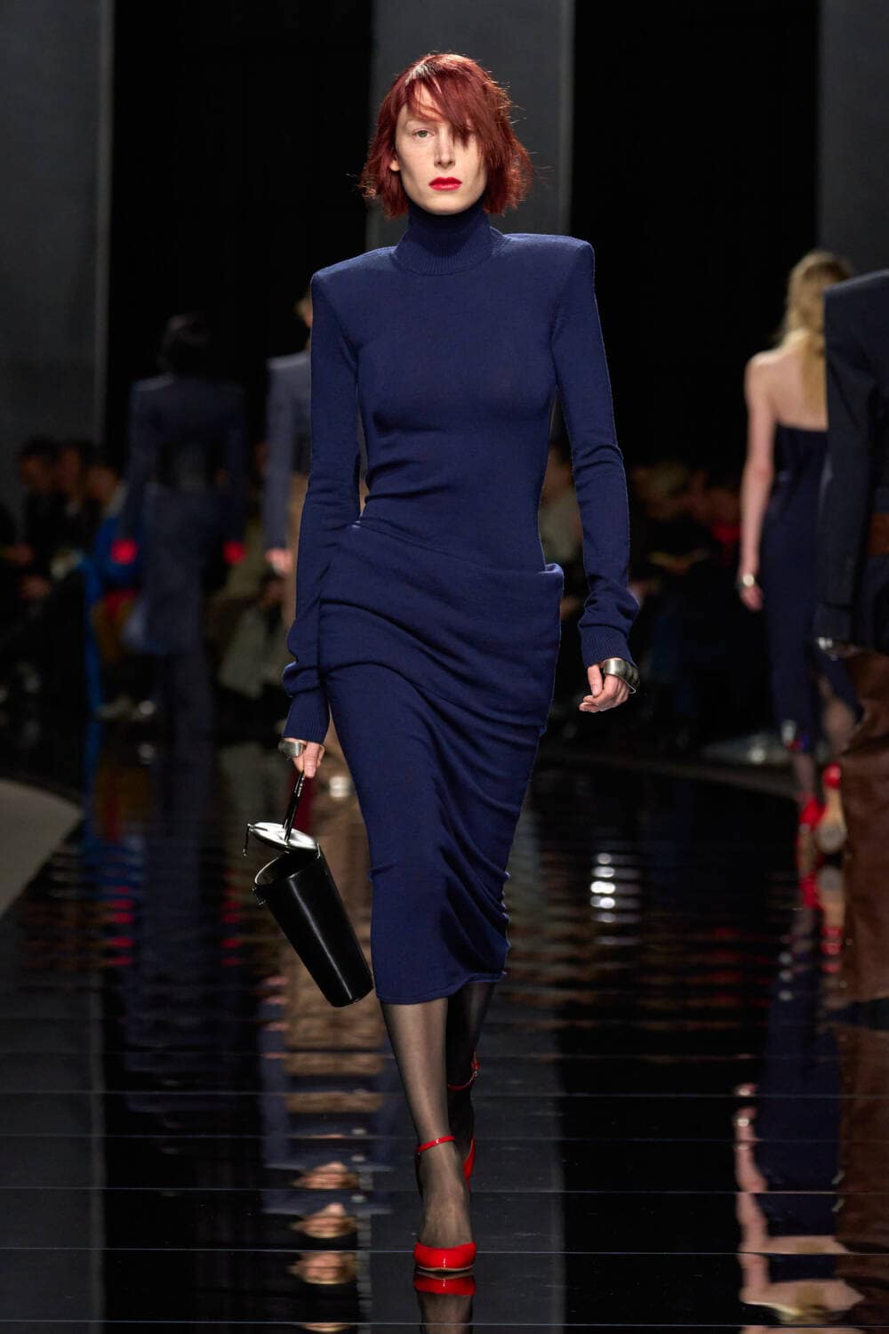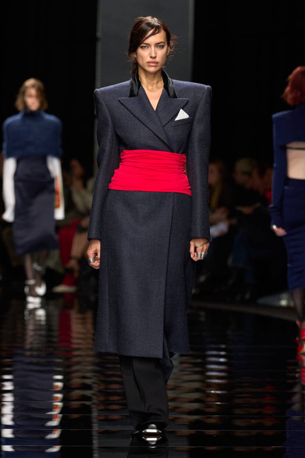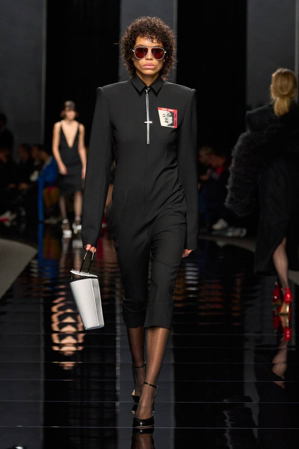 The palette was predominantly muted, consisting of black and navy, but with a consistent strain of bright and unavoidable pops of red. Taking inspiration from German singer Nico and the mysterious nature of her Camera Obscura album, the pieces also bounced off the magnetism of ‘80s music stars like Grace Jones, Debbie Harry and Annie Lennox. Paying homage to this theme, prints of the stars’s faces popped up across shirts, knits, dresses and jackets. The inclusion of scrunched waistbands, reminiscent of boxing shorts, enhanced the idea that the Sportmax woman is not to be tussled with. Details carved from plush velvet gave the collection an understated opulence, whilst dresses constructed from materials with a patent finish demonstrated its night-ready element.