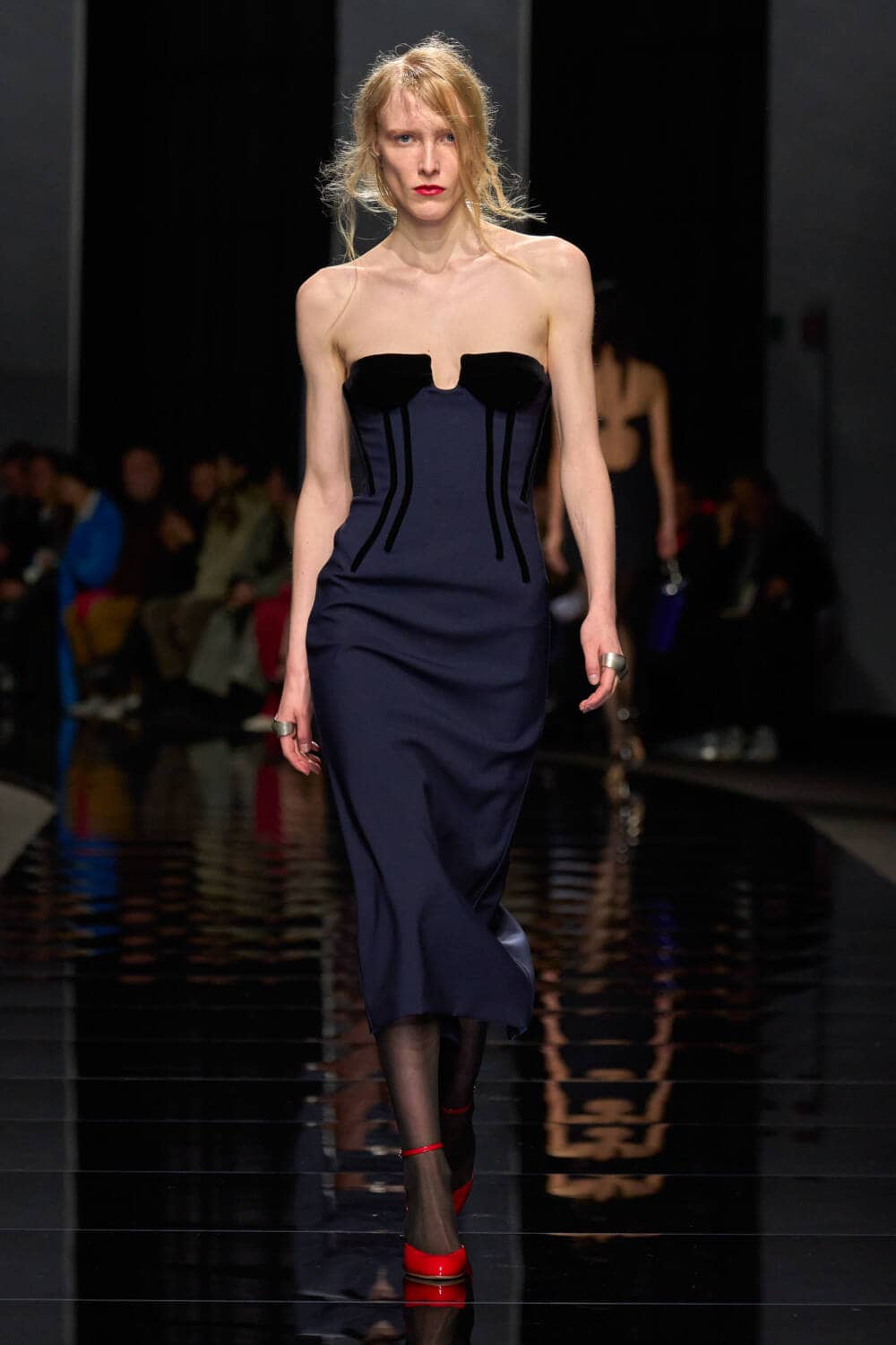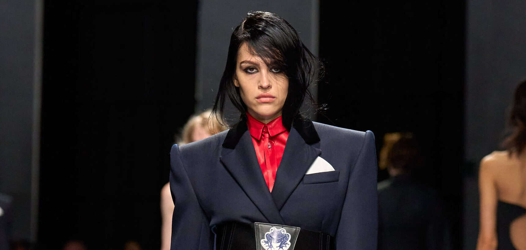 A vast room lit with luminous, ceiling-tall panels of deep red and black greeted Milan Fashion Week-goers as they took their seats for Sportmax’s AW24 offering entitled Camera Obscura. As the lights shut off to announce the beginning of the presentation, the strings of Teho Teardo’s ‘L’insonnia delle rondini’ swelled before red, neon lights lit up the runway and the first look walked out. Donning razor-sharp silhouettes, mesh panelling and tightly corseted waists, the procession of messy-haired models that ensued left one word swimming about the thoughts of onlookers – formidable.