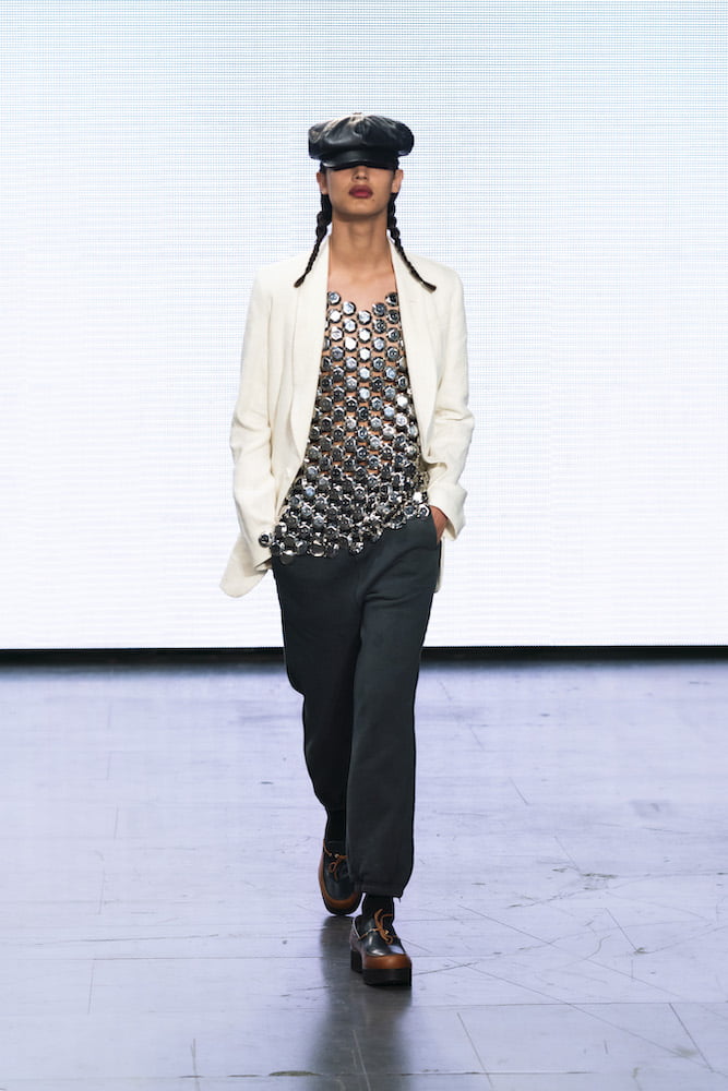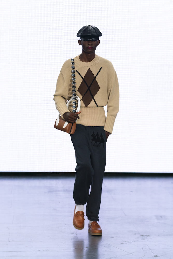 Cooke and Burt skip the faff when it comes to their fashions. They’re not interested in reinventing the man’s wardrobe, and instead, let the cut of a trouser, or the finishing of a knit, do the talking. A Union Jack jumper that appeared in the show could’ve easily read as a symbol of divisiveness, yet the mind was instantly cast back to Geri Halliwell at the Brits, or Liam and Patsy cuddled up in bed on the cover of Vanity Fair. That’s the power of British fashion, and ultimately, the power of Stefan Cooke.