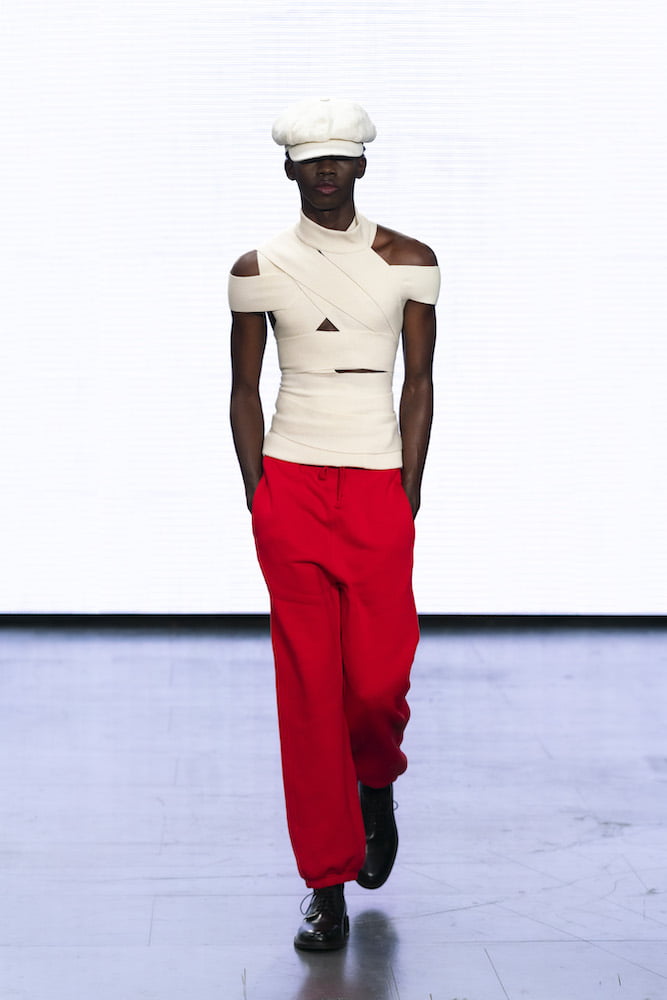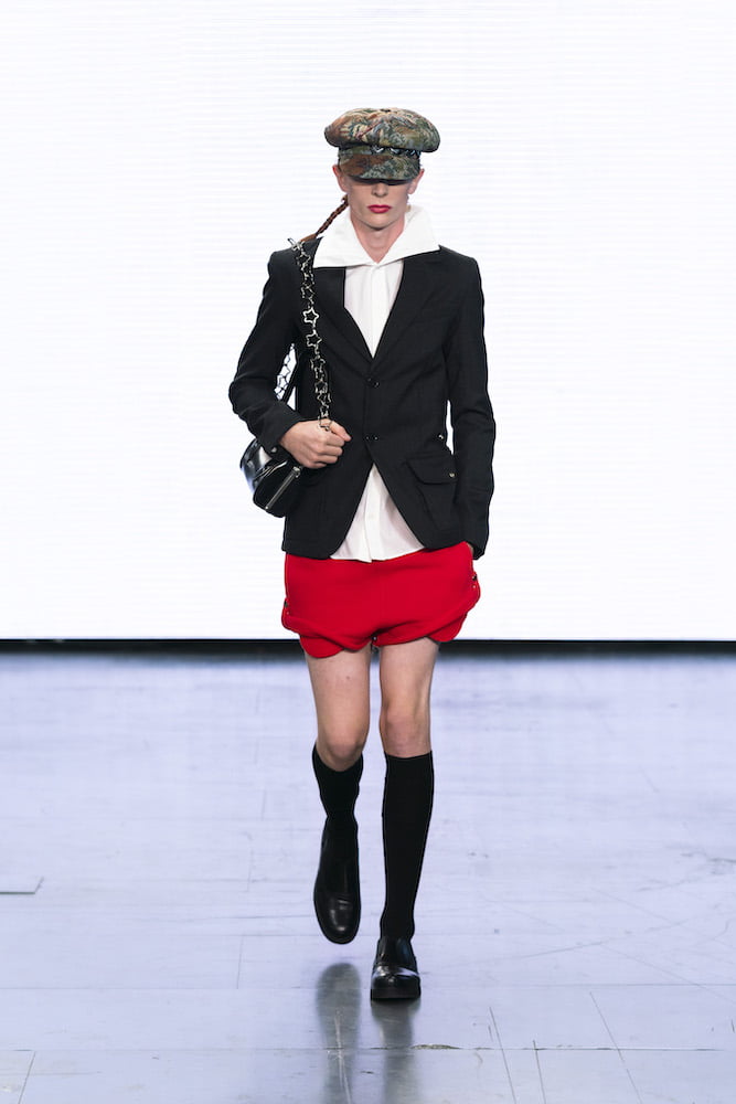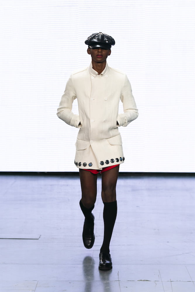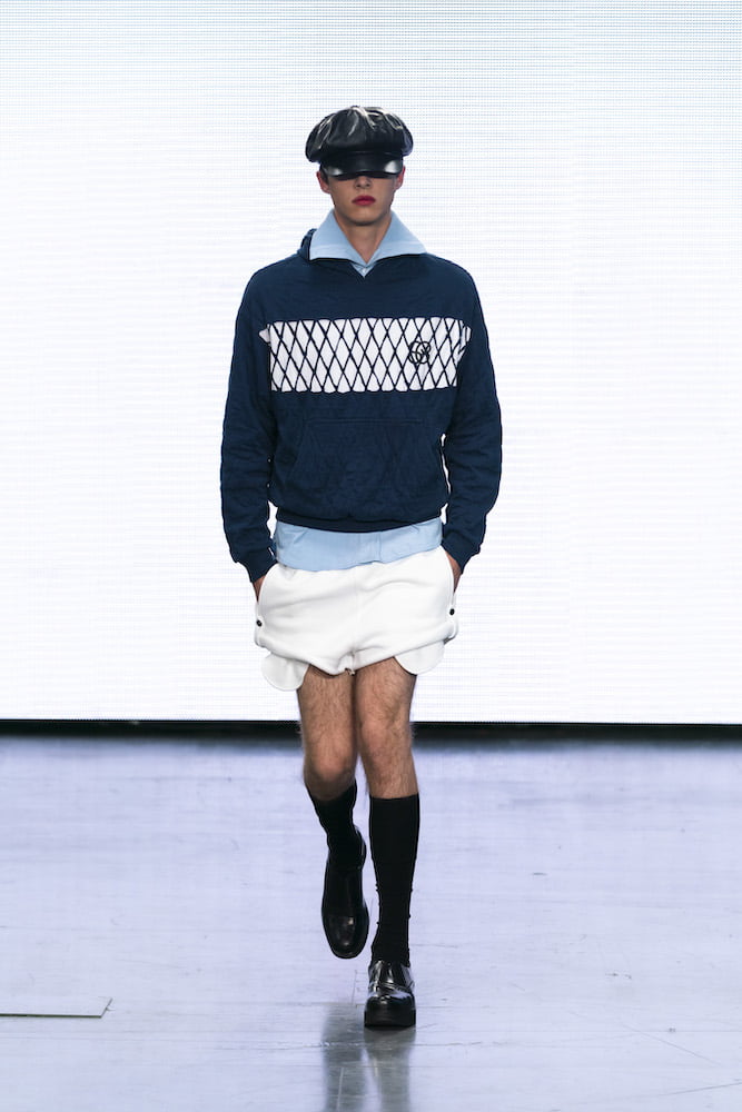 Sidestepping “the traditional tropes of wealth and luxury”, the duo (un)ironically pastiche all the New Look gems you regretfully bought back in the day, from baker boy caps to bandage tops. Trompe l’oeil shirts – a Stefan Cooke signature – came stamped in ghostly sketchings of military uniforms (a nod to when everyone dressed like army cadets post Cheryl’s “Fight For This Love”, perhaps?) and rugby jerseys were finished with exaggerated collars. Traditional knits were repurposed, now with exaggerated cuffs and ribbed waistbands, and the sort of paired-back trackies and short shorts that might’ve once been stamped with a Jack Wills logo were adorned with Cooke’s own insignia: a group of dancing ladies.