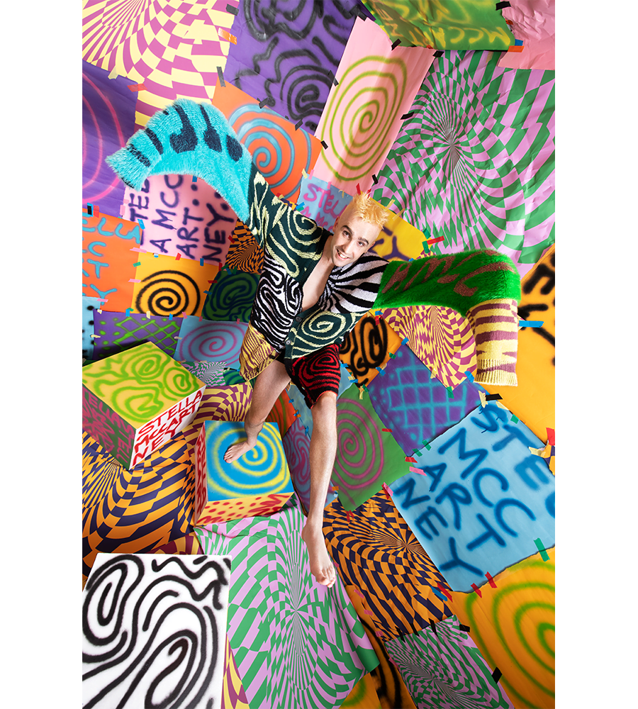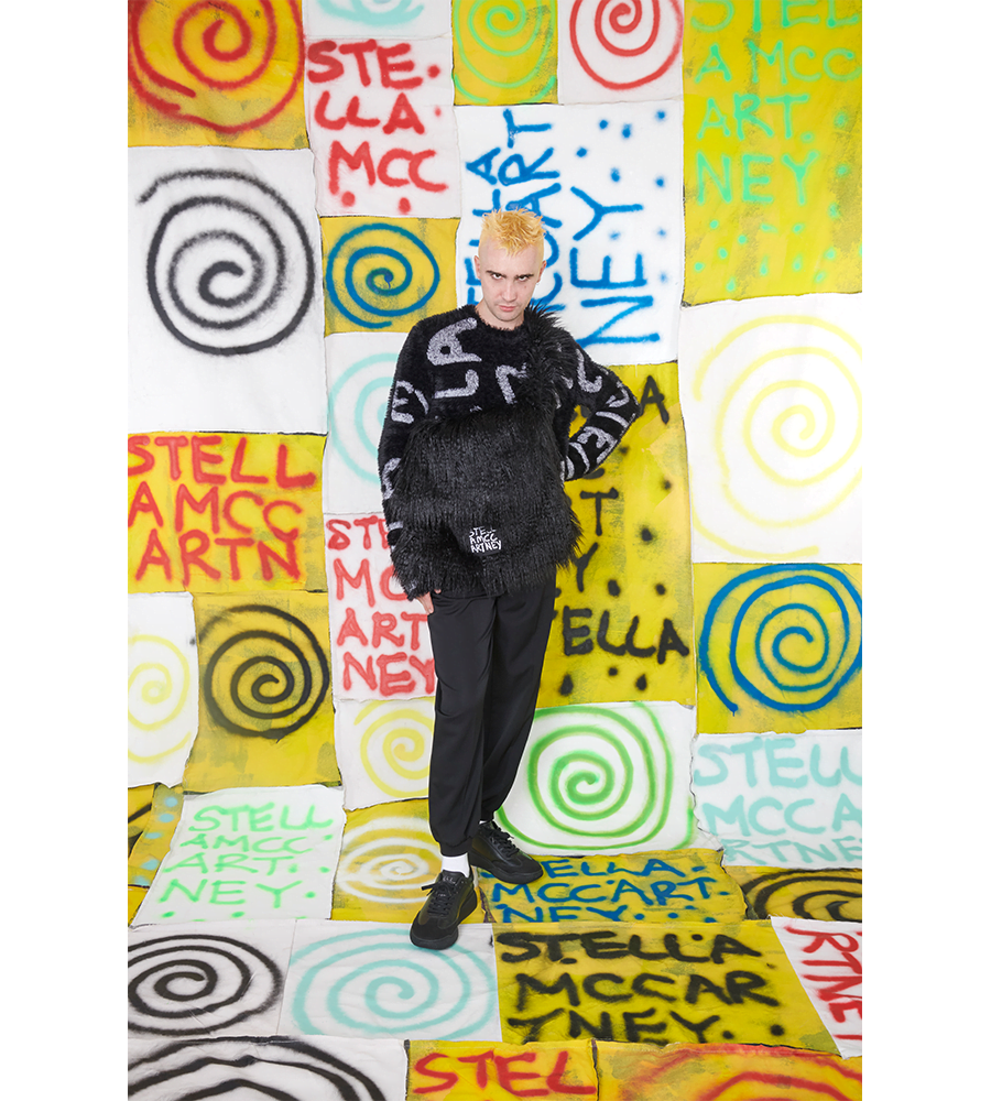 For Stella Shared 3, the designer brought his recognisable optical prints to laser-printed organic cotton denim and colourful furry jumpers with the artist’s free-hand spray-painted interpretation of the Stella McCartney logo blown up across the pieces. “There is definitely no concept behind this collection. Every step of creating this collection has been instinctive and It’s important that I don’t think too hard about it. I just have to trust what comes out,” adds Curtis.