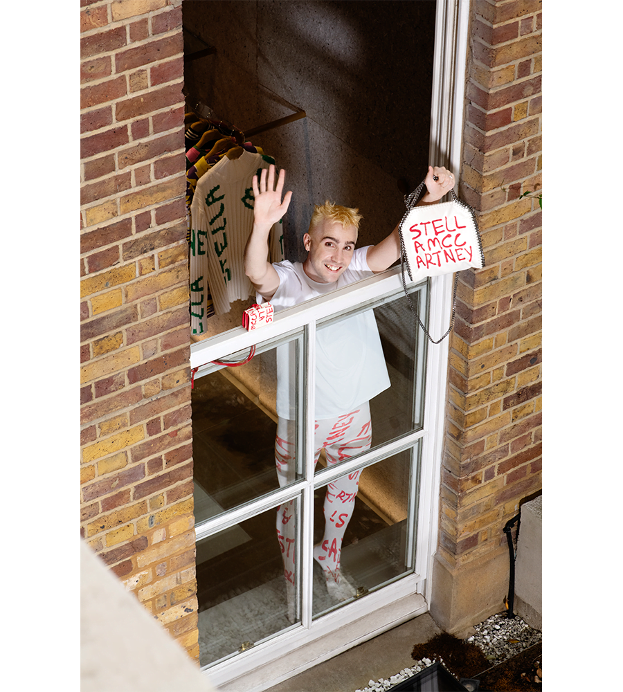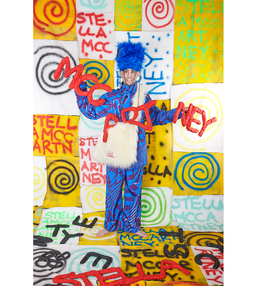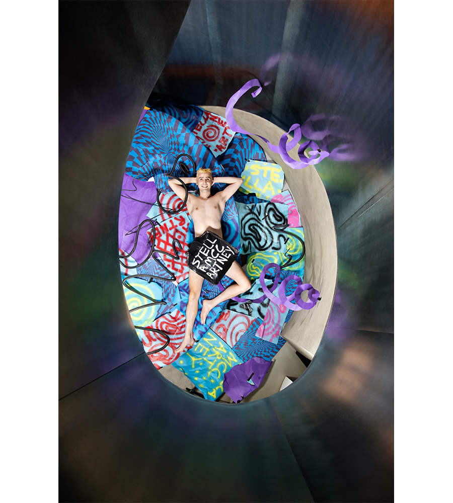 With an eccentric shoot to accompany the collection, the designer worked with set designer Lydia Chan to create a fully immersive space that reflects the collection. “For me, it’s important that the surroundings are as full-on, if not more than the clothes. I want that energy to exude out of the page or someone’s phone when they are looking at it,” he mentions. The shoot took place in Stella McCartney’s Mayfair store. “It was fun to bring a bit of chaos and walk around semi-nude whilst the store was still open to customers. We initially were going to shoot at night so customers could shop in peace but Stella wanted them to see, so we did it in the day.”