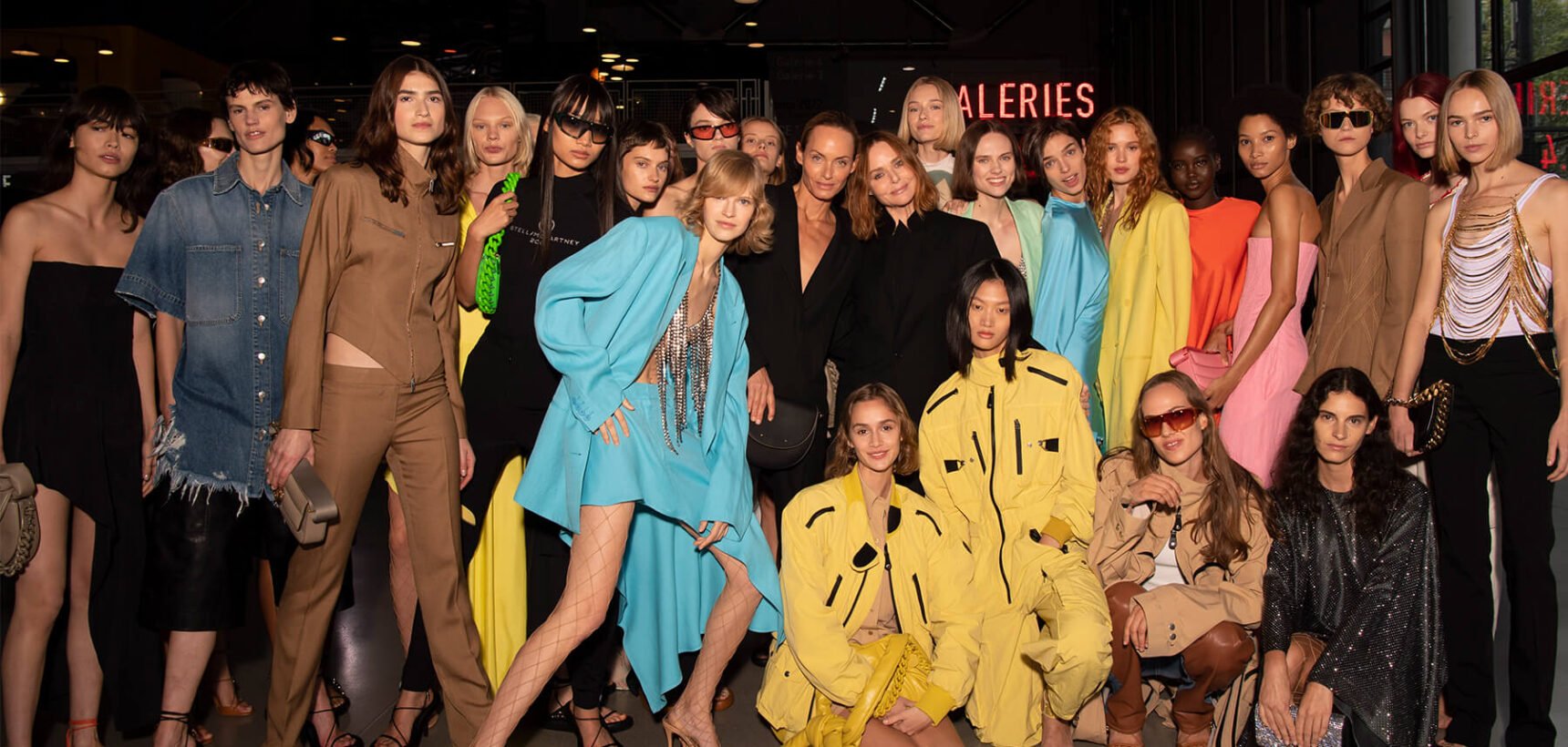 Across the colourblock catwalk, sporty styling cropped up as well, and racer sunnies were right on trend. There were also panelled jeans with western influences, sculpturally sound blouses with ballooning sleeves and distressed denim that felt a bit Kesha. Meanwhile though, every garment was evoked through the finest sustainable technology out there – not that we’d expect any less from the environmental innovator. Think pieces made from regenerative bio-diverse cotton; plant-based shoes made from materials like grape skins faux leather; bags in mycelium mushroom leather; and rhinestone pieces created sans animal glues and solvents. More brands should take note of the Stella way.