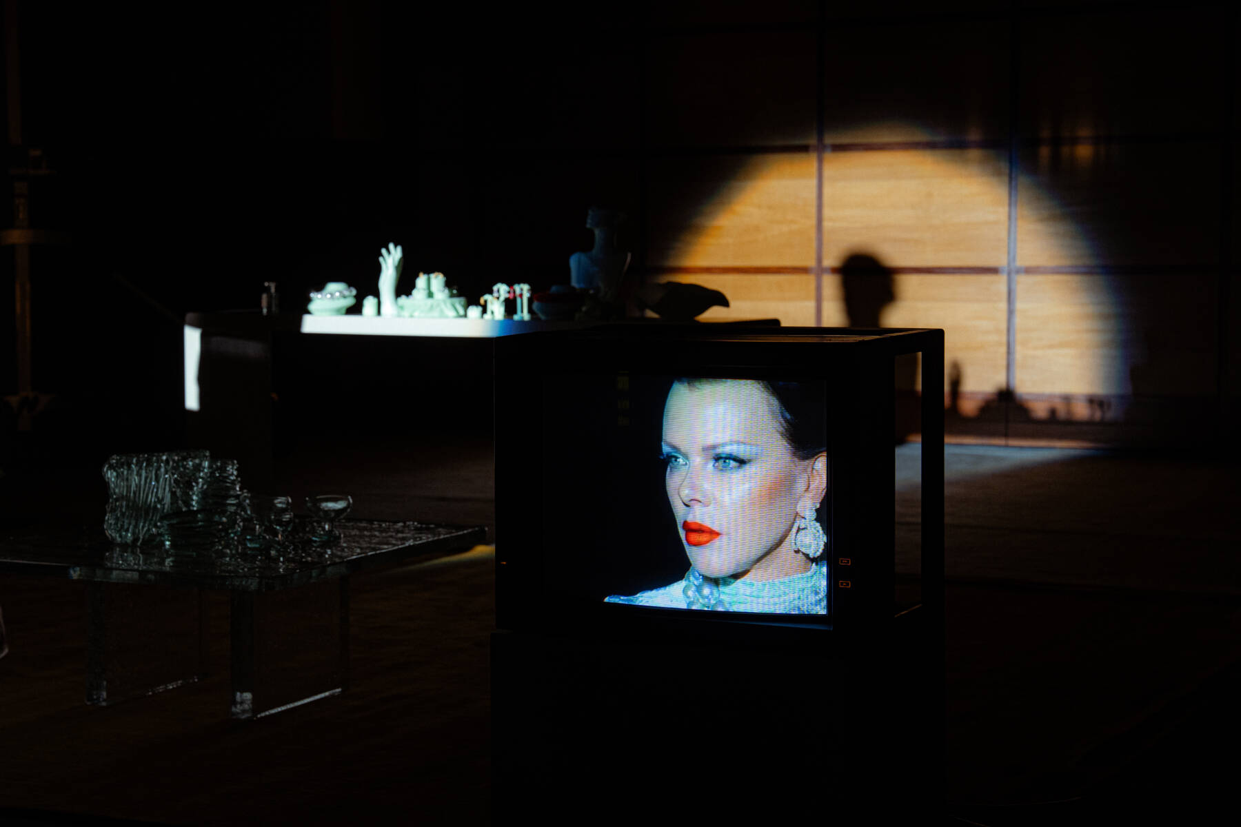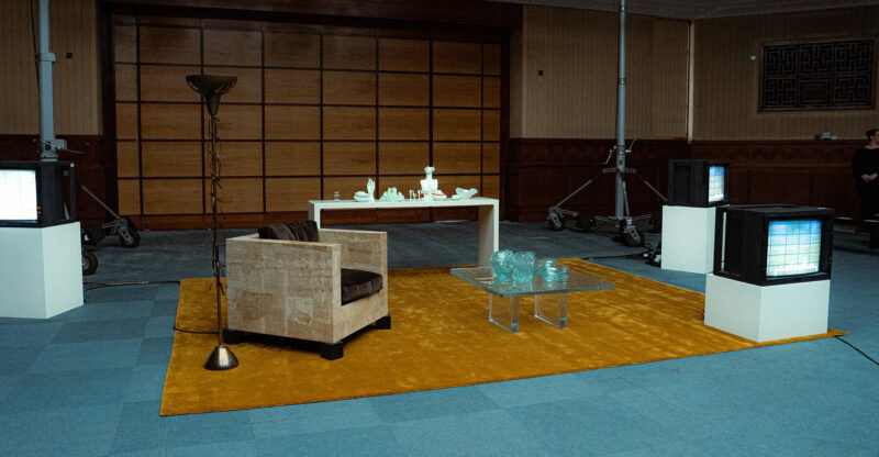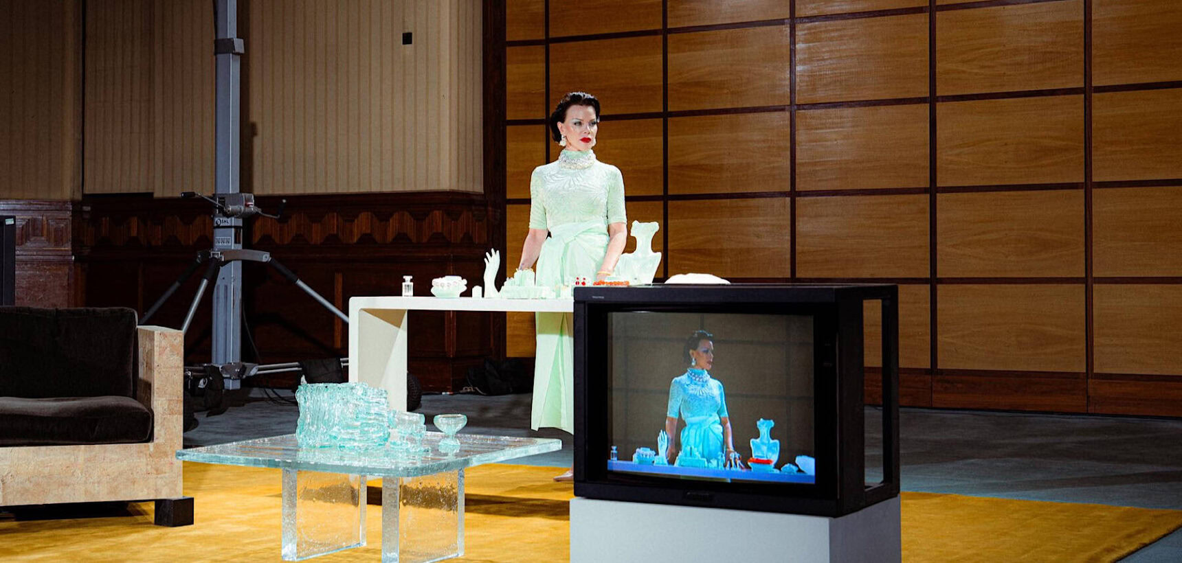 Hollie Bowden: I was so happy to be working with Completedworks and Anna again, on a second project together, after I designed their London showroom in 2023. Anna and I had a great shorthand together – a love of textured materials but with a purity and clean-ness about them. Initially I approached this project with a certain palette in mind, and Laura’s wonderful script also suggested a particular aesthetic. But as soon as I stepped into the location, Beveridge Hall, it sort of turned my concept on its head. The space is a glorious piece of late English Deco, and I knew in the first instant the production had to take its cues from the wood panelling, stone foyer and very modernist ambience. I was drawn to pieces that worked with Deco elements in the room, rather than being overtly from that historic period. More of a wink to the materials and finishes already present. The theme really evolved as I developed the set with the team. Debi’s costume was possibly going to go in quite a sexy, suit-y direction, so I wanted the set to compliment that. The concept of TV shopping through the lens of something more dark and sexy in a formal space was really intriguing.”
