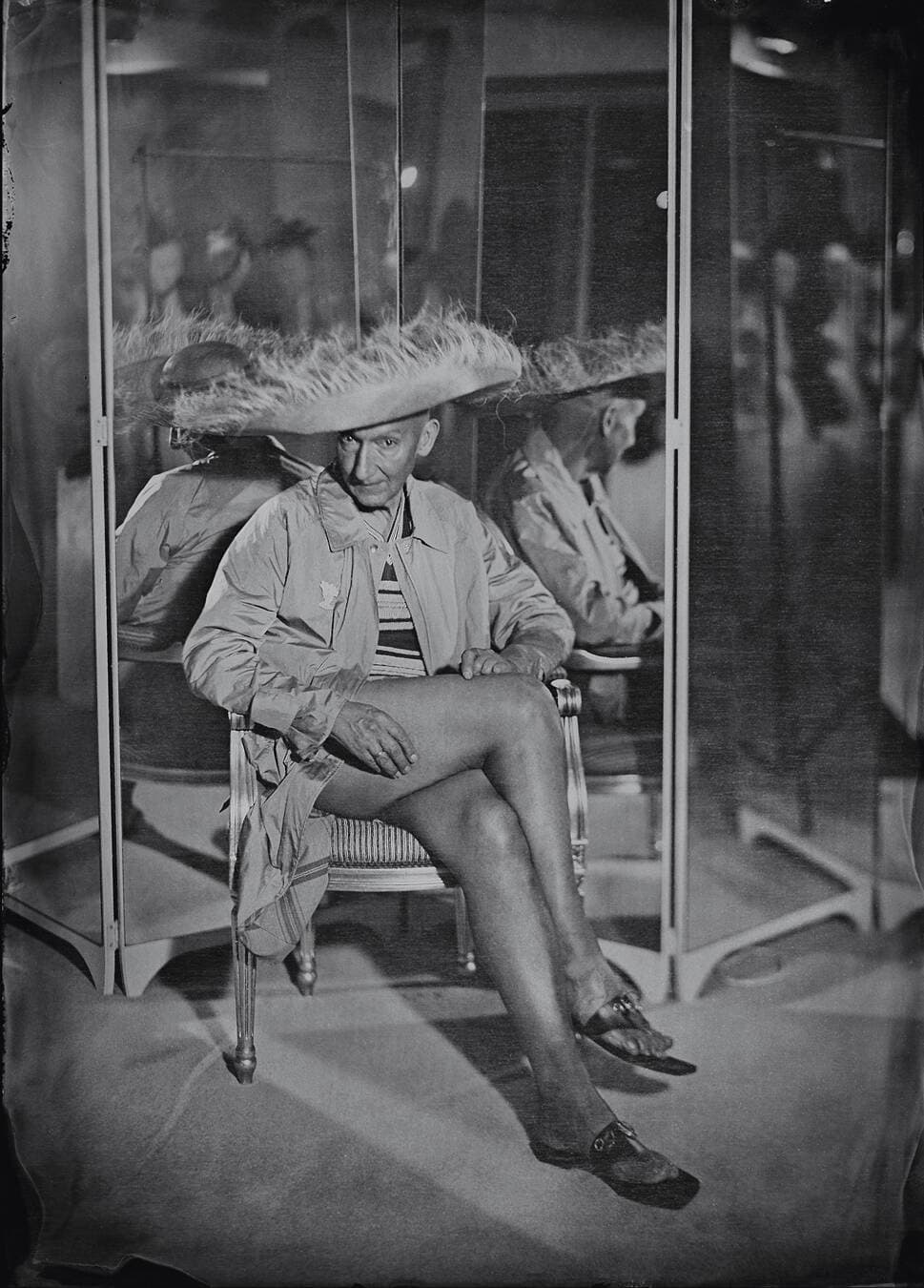 from left: suit by JOHN ALEXANDER SKELTON, shirt by MILKBOY, shoes by LOUIS VUITTON, hat by STEPHEN JONES MILLINERY FOR JOHN ALEXANDER SKELTON; top by WALTER VAN BEIRENDONCK, hat by STEPHEN JONES MILLINERY FOR WALTER VAN BEIRENDONCK