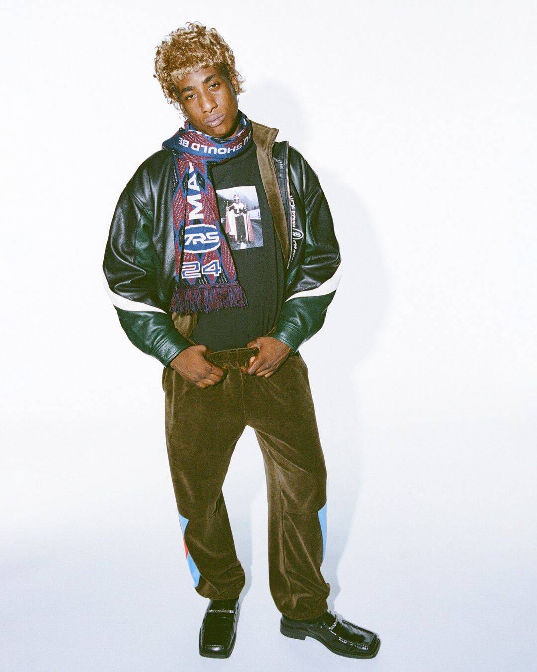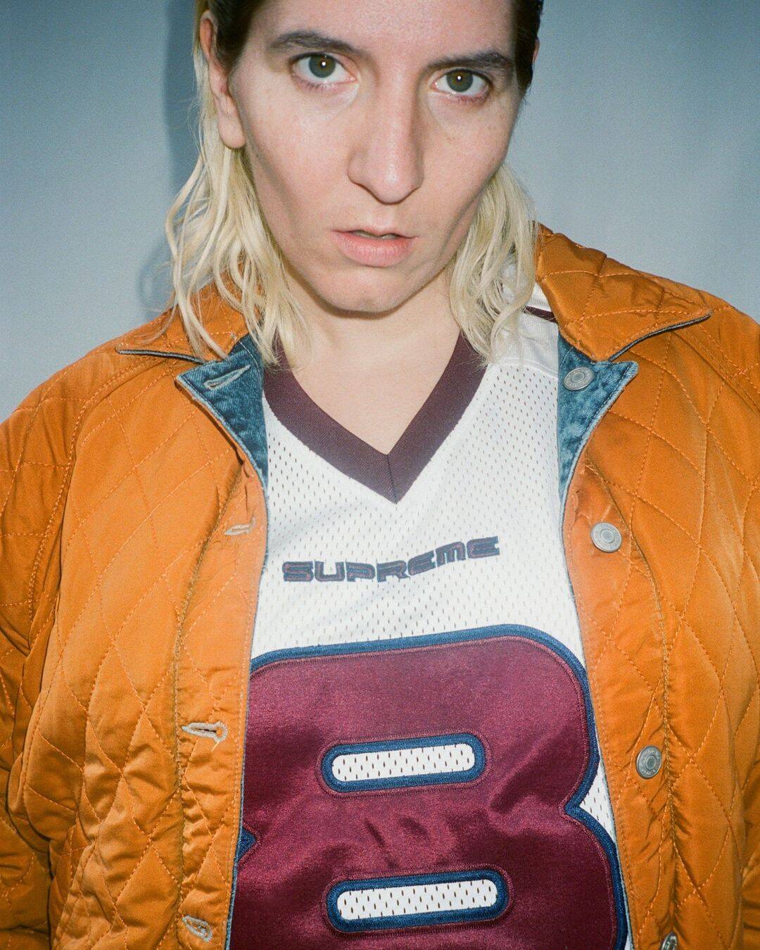 The collection is chock-full with velour trackies, co-branded football jerseys, retro knits and reversible denim jackets stamped with the names of New York neighbourhoods on one side, with a beer towel graphic featuring across the quilted side. Elsewhere, the collection features an updated rendition of Rose’s classic logo tees – now stamped with Supreme across the chest – alongside a range of accessories including shrunken duffle bags, scarfs and a croc-effect Clarks Originals shoe (Rose is currently the footwear brand’s first-ever guest creative director).