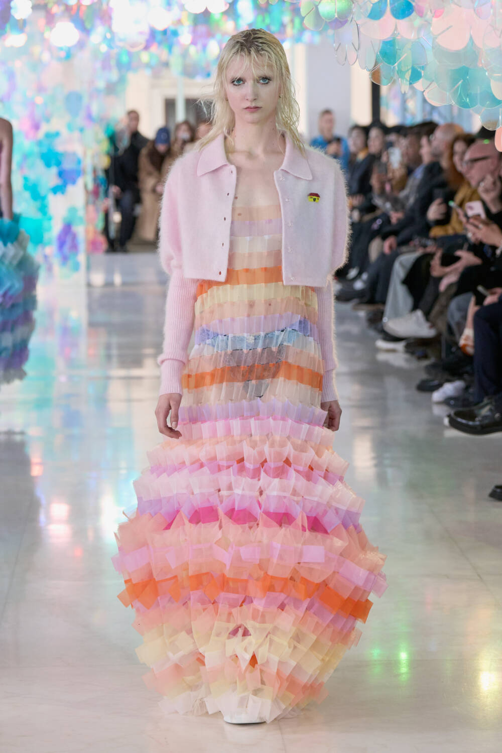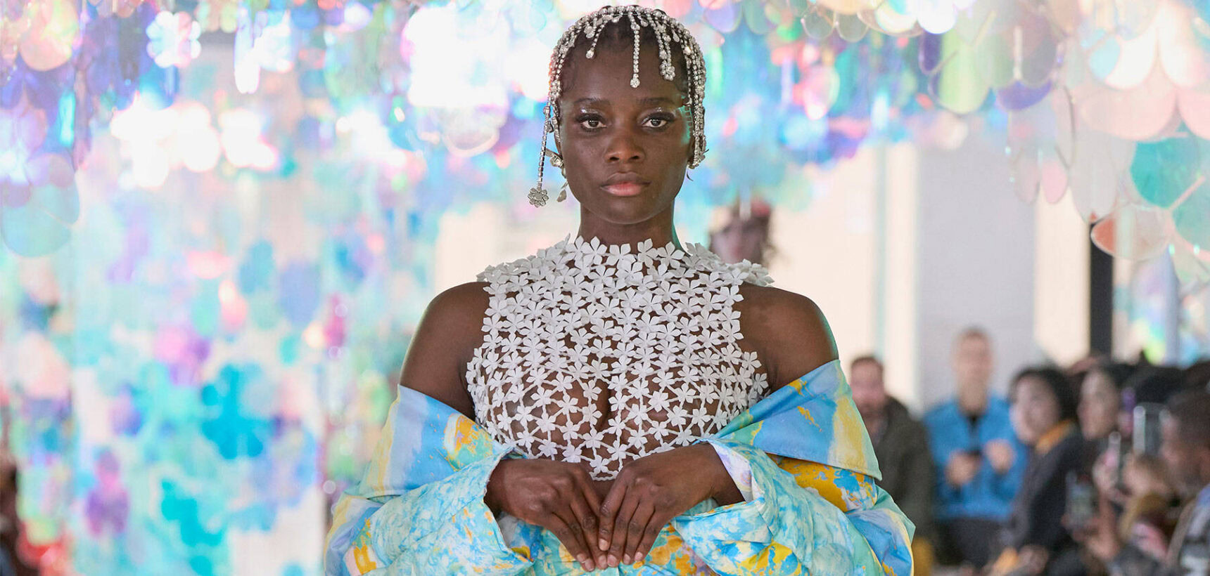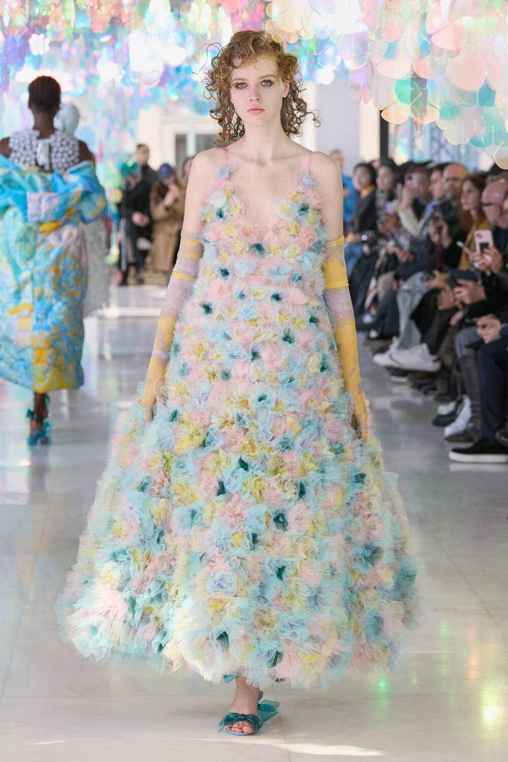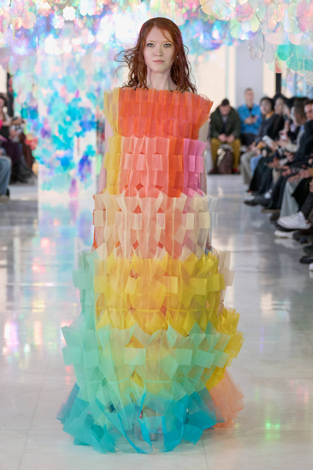 Fang is known for her whimsical approach and love of fractals and mathematical patterns. The designer opened with 3D assemblage, crystal and beaded flower dresses, which took craftswomen in her native China three months to make and then apply to a 3D printed base. Bringing technology and craftsmanship together is a Fang signature. As is the feel-good factor. Fang, who got married a few weeks ago also showed her own rainbow hued tulle gown. Summing up her colourful collection, the designer said it was about the pursuit of happiness. It certainly put a smile on our faces.