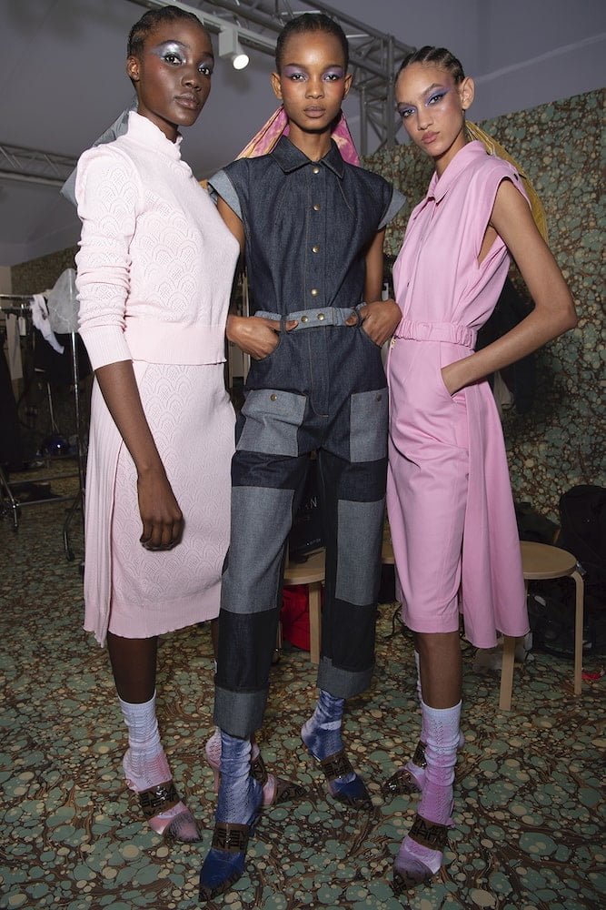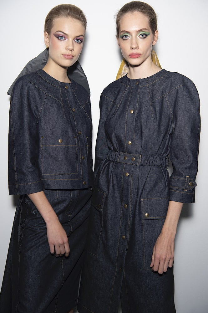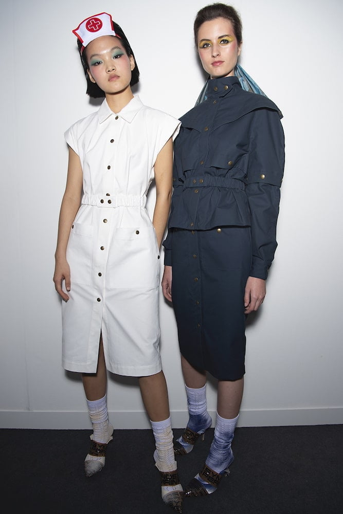For SS20, the duo continued their collaboration with Matches Fashion, having already shown their past collection at the retailer’s Townhouse on Mount Street during London Fashion Week in February. The venue for this season was the perfect setting for what Symonds Pearmain stand for – reconsidering dress codes of the past with a sense of satire and intelligence. Was this a performance on the Frieze schedule? Or just your regular fashion show? Well, a little bit of both actually. The context of Symonds Pearmain clothes adds depth to the rehashing of the past. 1940s via 1980s in the shape of workwear and uniforms give new life to ideas we would previously dismiss as “girly” or “old fashioned”. Snap buttons created a customisable factor to the garments which came in a whole variety of textiles – wools, denims, canvas and leather were all in the mix. Regardless the artistic intention behind them, these clothes are made to be worn out, rough and ready for the neurotic reality.