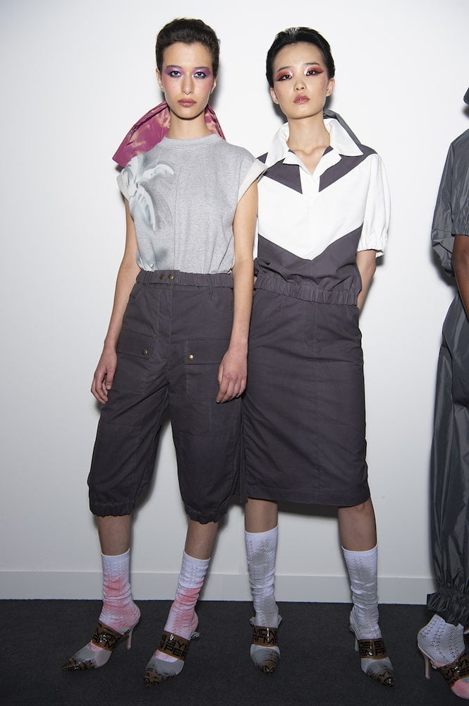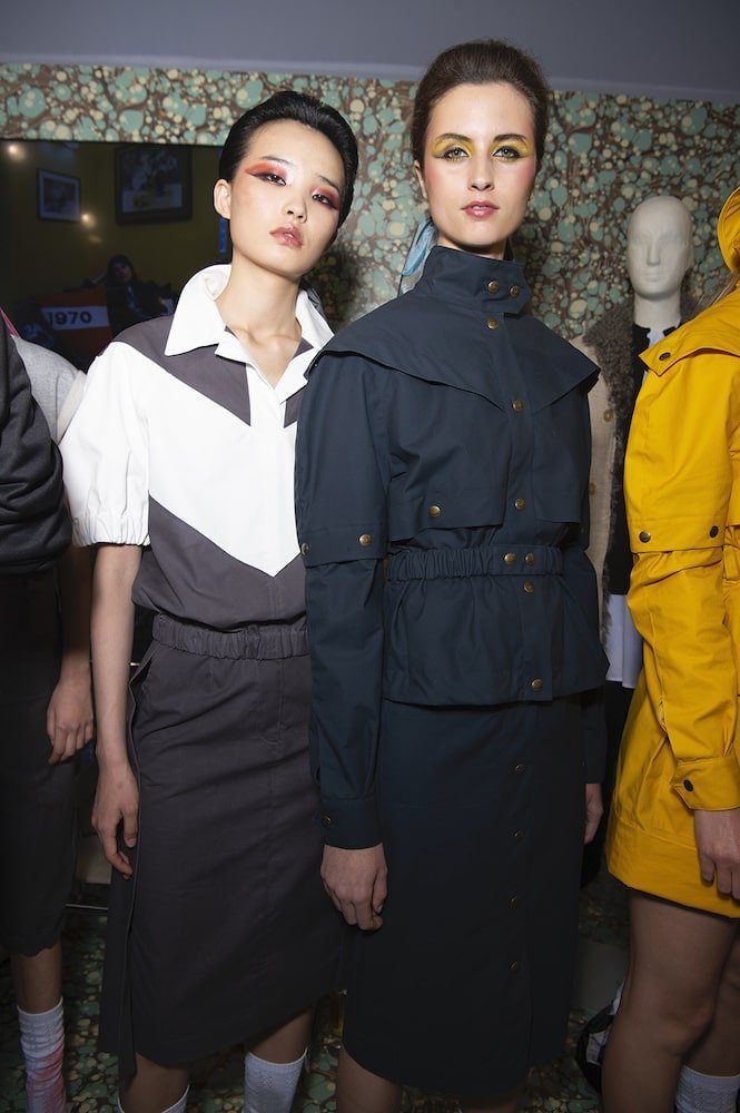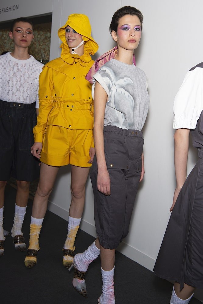 While some designers poetically laud about “their woman” being aspirational with her incredibly aloof character and semi-mystical aura, Max Pearmain and Anthony Symonds focus on the reality of things. The character they dress is a neurotic woman on the run, using her fashion to revolt against the plasticity that makes her everyday environment. Let’s be real – all of us carry a bit of that woman in us, perhaps even more so at the end of the gruelling weeks that make up fashion month. And so this woman entered the auditorium of the Frieze Art Fair, her heels taped up to her schoolgirl socks, simultaneously hyper-aware and lost in her own surroundings. Symonds Pearmain represent the merging of old and new school – Max being a stylist of the new generation and Anthony representing the 1990s scene, having worked with Galliano and Westwood before shifting into the art world. Both give a sense of an impeccable taste as they recreate the fashion pastiches into fresh garments, ready to be worn on the streets of tomorrow.