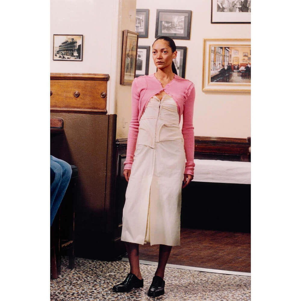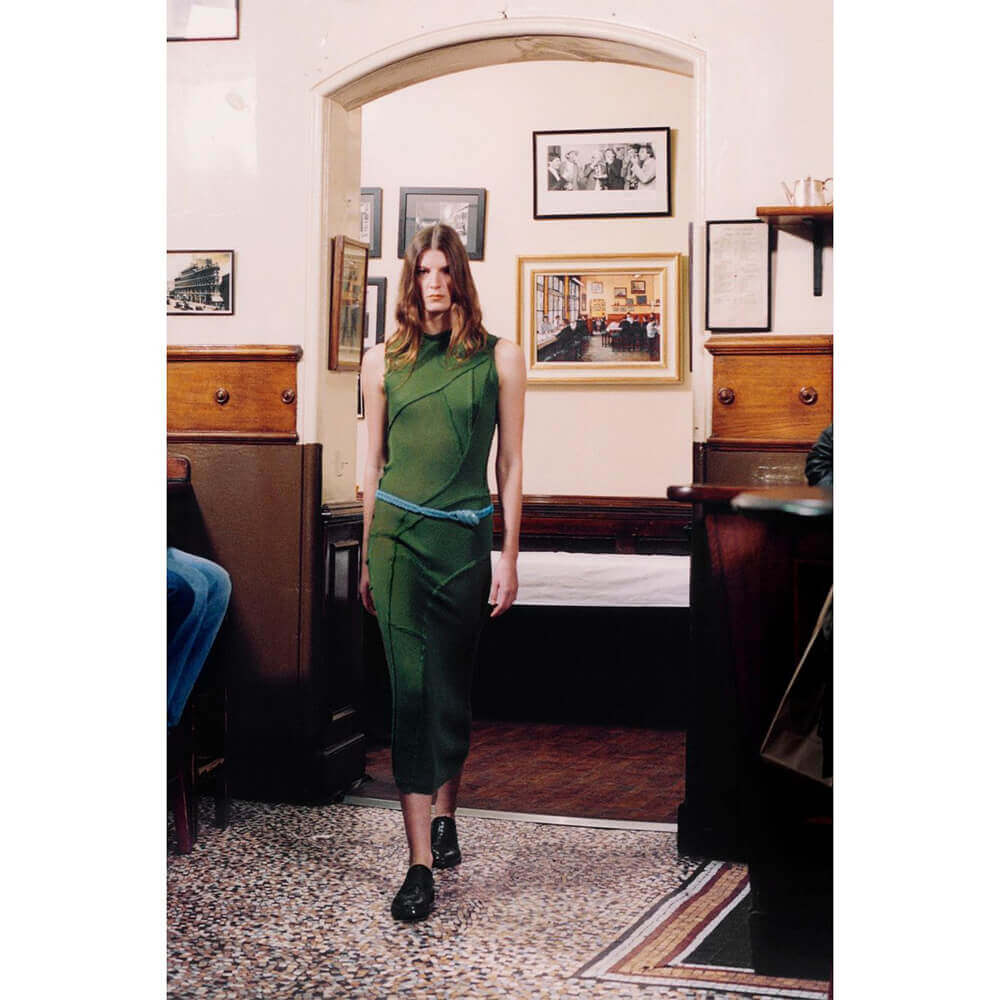 The brand’s tactile, woolen separates came in pleasantly, off-kilter finishings. From shrunken boleros through to dresses pulled in skew-whiff proportions.  Since her days at university – Talia graduated from the Central Saint Martins MA Fashion course in 2020 – the designer has shown a deft hand in draping. Here, lightweight knits, fashioned in blush pink, neon green and cream, traced the body’s frame, hugging in all the right places.