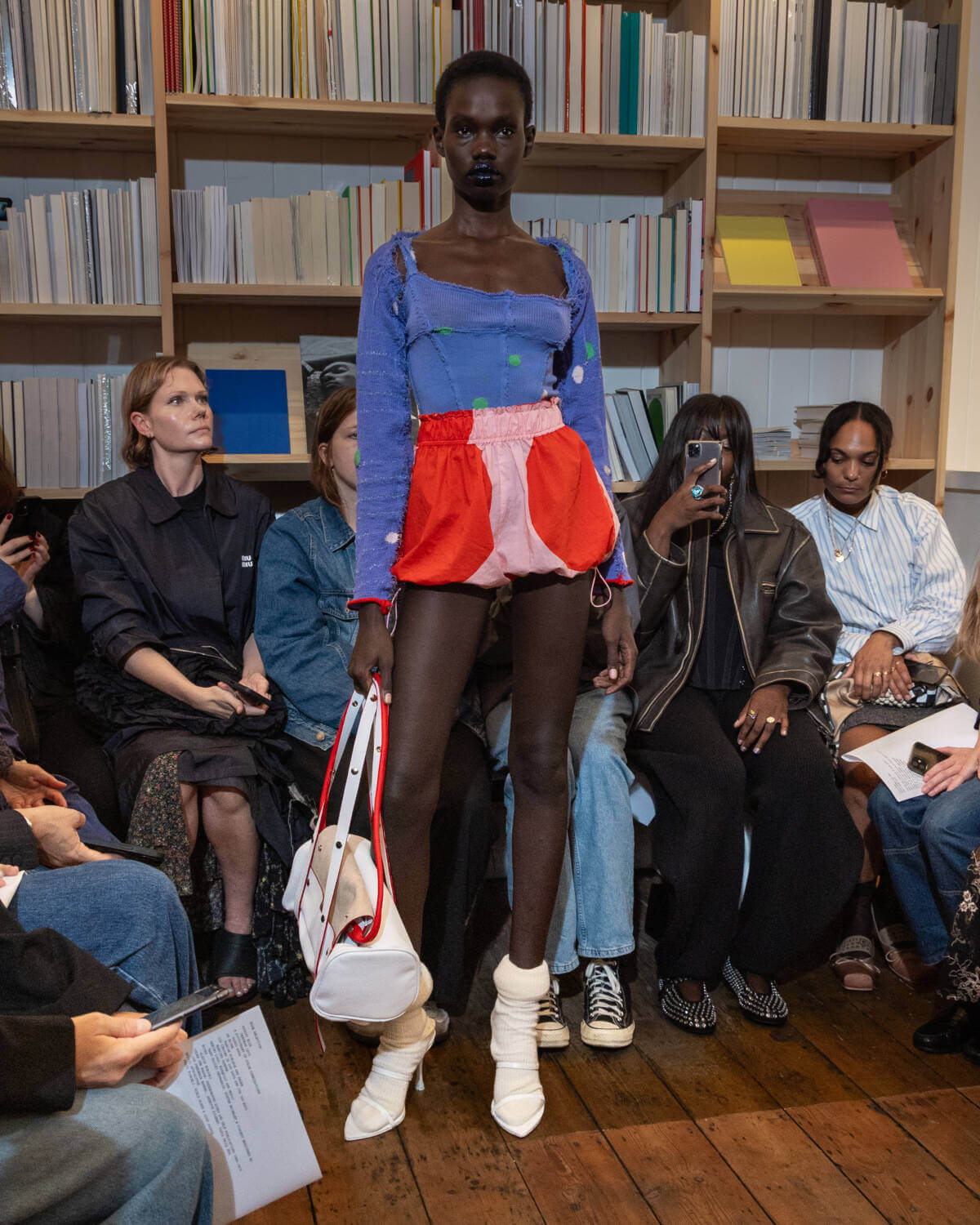 Silhouettes were understated but beautifully done, featuring zip-up jackets, pocketed midi skirts and puffy short-shorts modernised by frayed edges and cinched waists. Byre’s aptitude for historical aesthetics was illustrated through an array of candy-cane corseting and monochrome mini dresses. Knitwear was playful, forming high waisted hotpants and square neck tops, whilst voluminous silver maxi skirt and cropped capris proved to be collection highlights. A new addition to Talia Byre’s arsenal was also thrown into the mix – a plump leather and suede bolster bag called the Bolter, catered towards the contemporary, metropolitan woman. Gift wrapped in saccharine charm, Talia Byre’s SS24 offering nods to a bright future.
