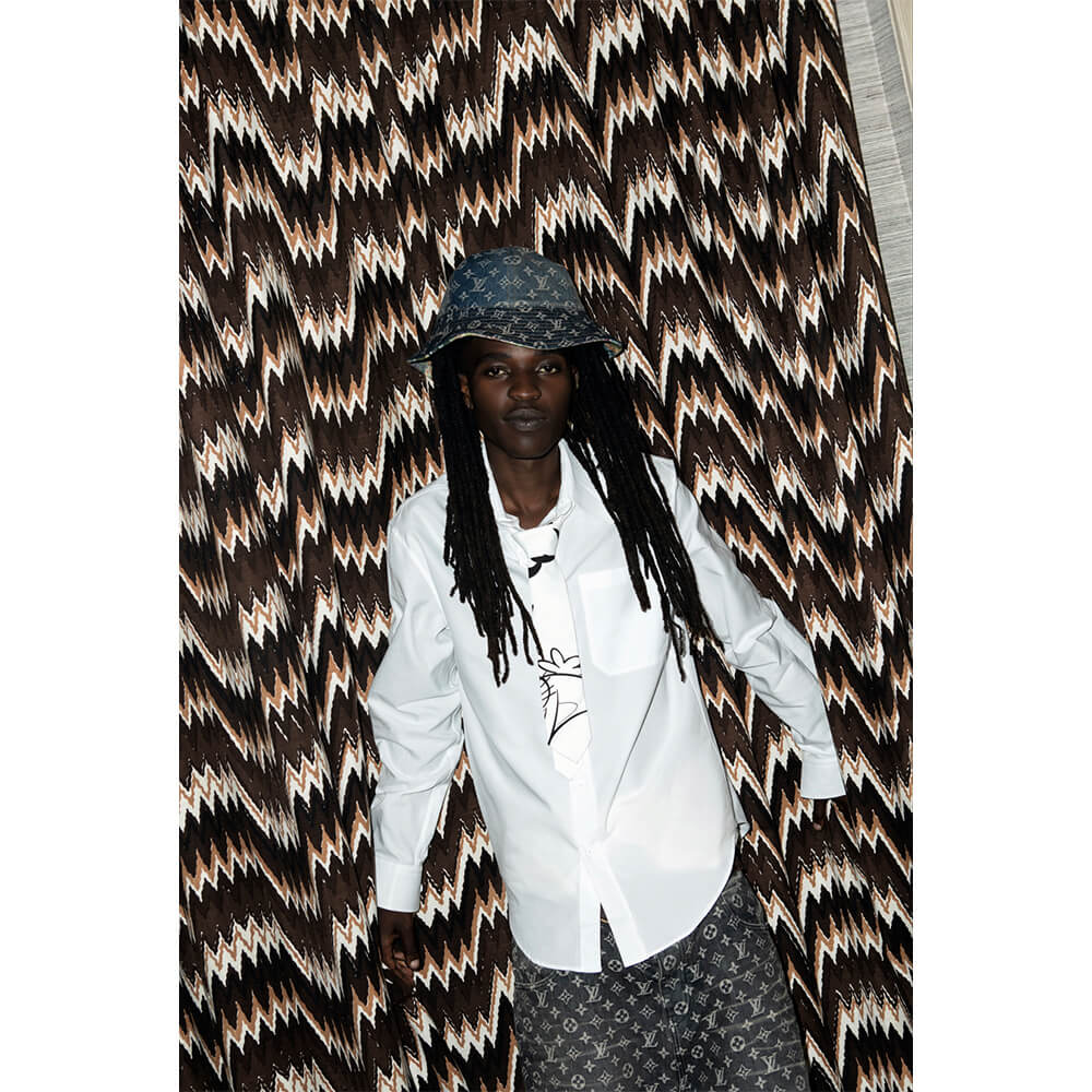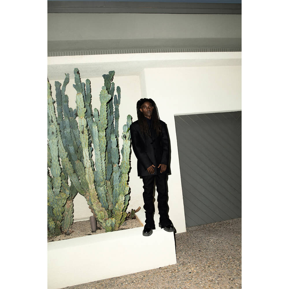 He’s supercharged by the sun and dressed in a pure white woollen suit from the late Virgil Abloh’s last collection for Louis Vuitton menswear. The artist, musician, producer and model, known as Tapz Gallantino (real name Tapiwa Mutingwende), grew up in Wedza, Zimbabwe, “in a very rural place – the fact that I’m even here right now makes very little sense” before moving with his family to Wellington, New Zealand, at the age of 10. “I’m a walking culture clash, that’s why my art is the way it is,” he says. “We’d listen to a lot of traditional Zimbabwean music, a lot of Bob Marley, too. Some Michael Jackson and Prince, but I never really understood English, I just felt the music. In New Zealand, it was punk rock.” With his debut album All For What set to come out towards the end of the year, Tapz now resides in Los Angeles, where he currently feels most empowered, because “ultimately, I’d rather be Black in America than be Black in New Zealand. At least here I’m not alone.”