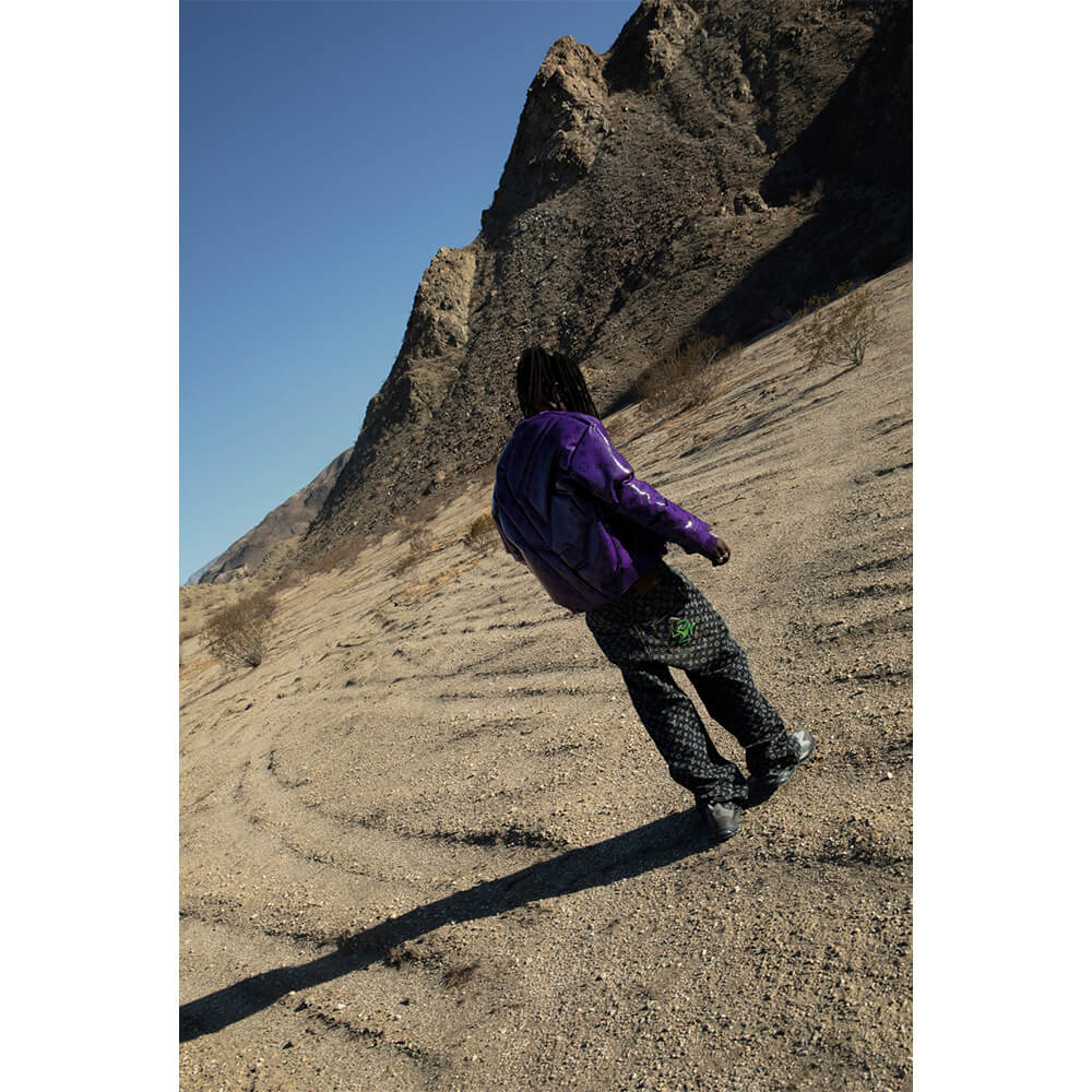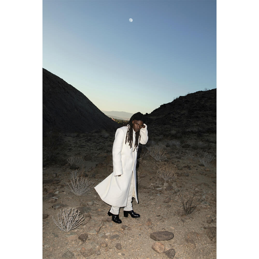 Music is just one piece of the puzzle, but it’s an endeavour that will undoubtedly reach great heights. Gallantino wants to work with Beyoncé, Rihanna, M.I.A. and A$AP Rocky because no feat is too big. He is at peace with where he’s at in his journey and home is wherever he finds himself. The rapper attributes his self-awareness to “ghetto therapy – like this interview – or staying up with my friends until dawn, just talking,” and his painting practice, influenced by Jean-Michel Basquiat and the Zimbabwean style of Weya art. Gallantino’s garden in East Hollywood is lined with a rainbow of his brilliant, abstract paintings. “I feel euphoric when I’m painting. Like oxygen has just been introduced into my lungs for the first time. I don’t listen to music when I’m painting. I just listen. It’s such a haven. You can hear the wind kissing the leaves, the birds harmonising, laughter in the distance.” His superpower is listening. Today, Gallantino is running through the desert in one of his hero’s creations, smiling, feeling deep gratitude and standing for creative justice. “The things that give you the greatest reward initially require discomfort. But it’s always worth it.”