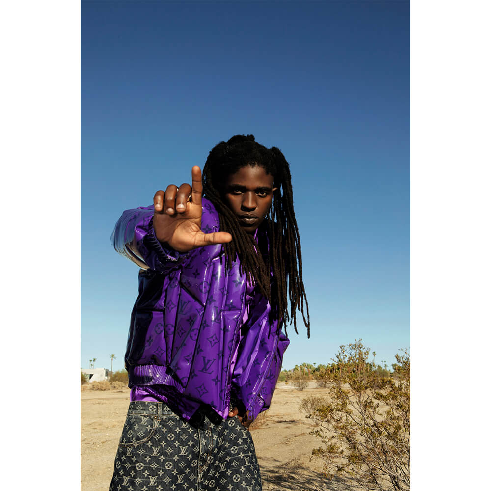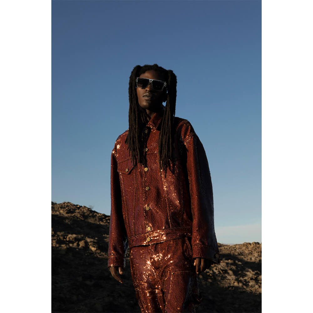 Gallantino’s style lies in the intersection of his mum’s and dad’s looks when they go on date nights. “The balance between masculine and feminine,” he says. While he always looks epic, it’s evident today that he’s in his element, gliding gracefully through the desert in Abloh’s last designs for Louis Vuitton. The mark on culture that the designer made has had a deep impact on him. “It wasn’t his work, it was his humanity, his existence, that impacted me. I never got to meet him, but I felt what he did. The thing I loved most about what he did was that he wasn’t afraid to do. He was one of the best listeners of culture and that’s why he informed culture as much as he did. It was less about clothes with Virgil. And Virgil always replied. He invited everyone in. In my culture you have more food, you have more things to offer, your table gets bigger. It’s very different to the Western world in which it gets smaller and your fence gets higher. But Virgil embodied that mentality, that we all eat at the table.” The single “Louis V”, released last November, exemplifies Gallantino’s love for the house and his appreciation of Abloh’s cultural impact – it is a “perfectly aligned example of manifestation”, he notes, with a laugh.