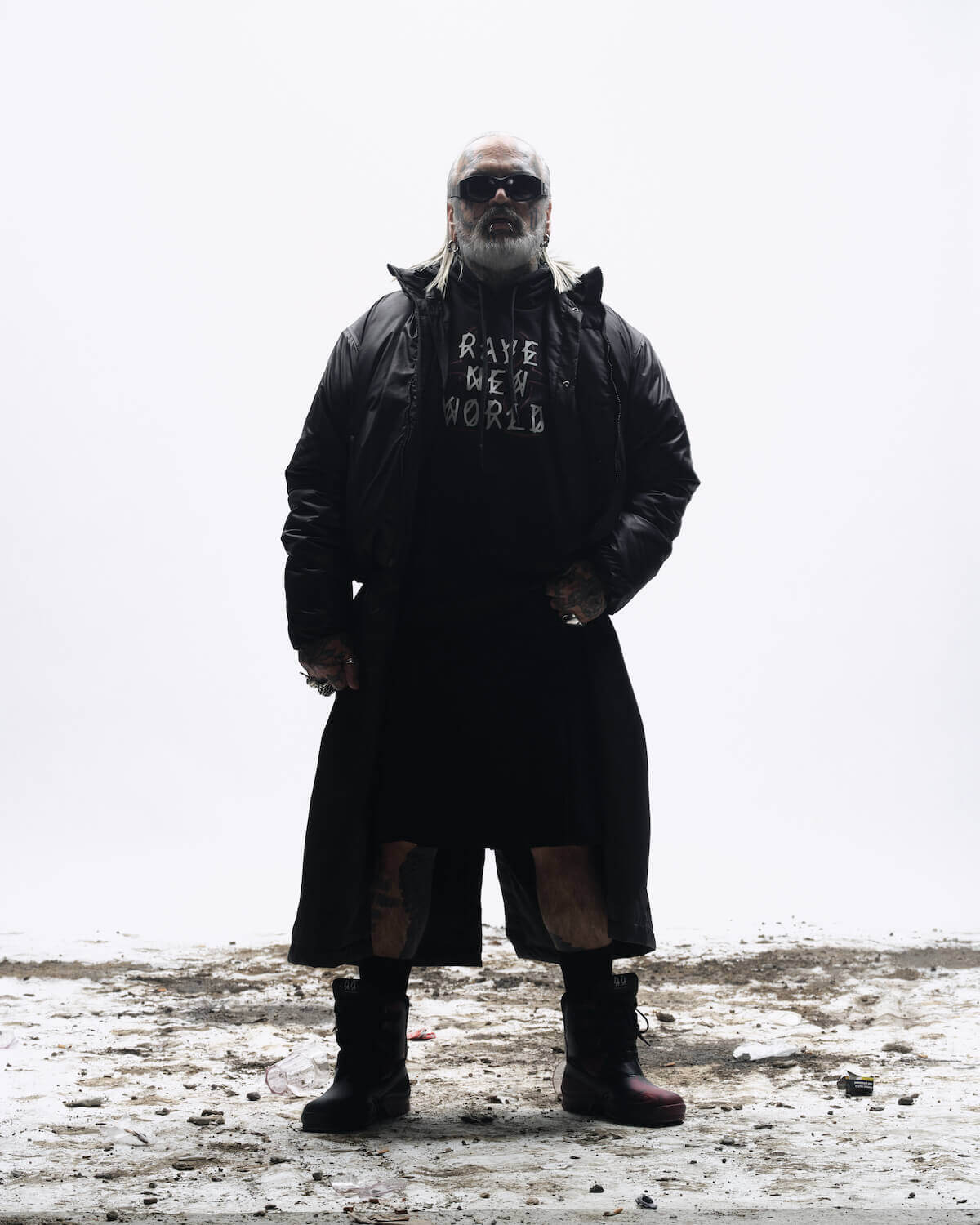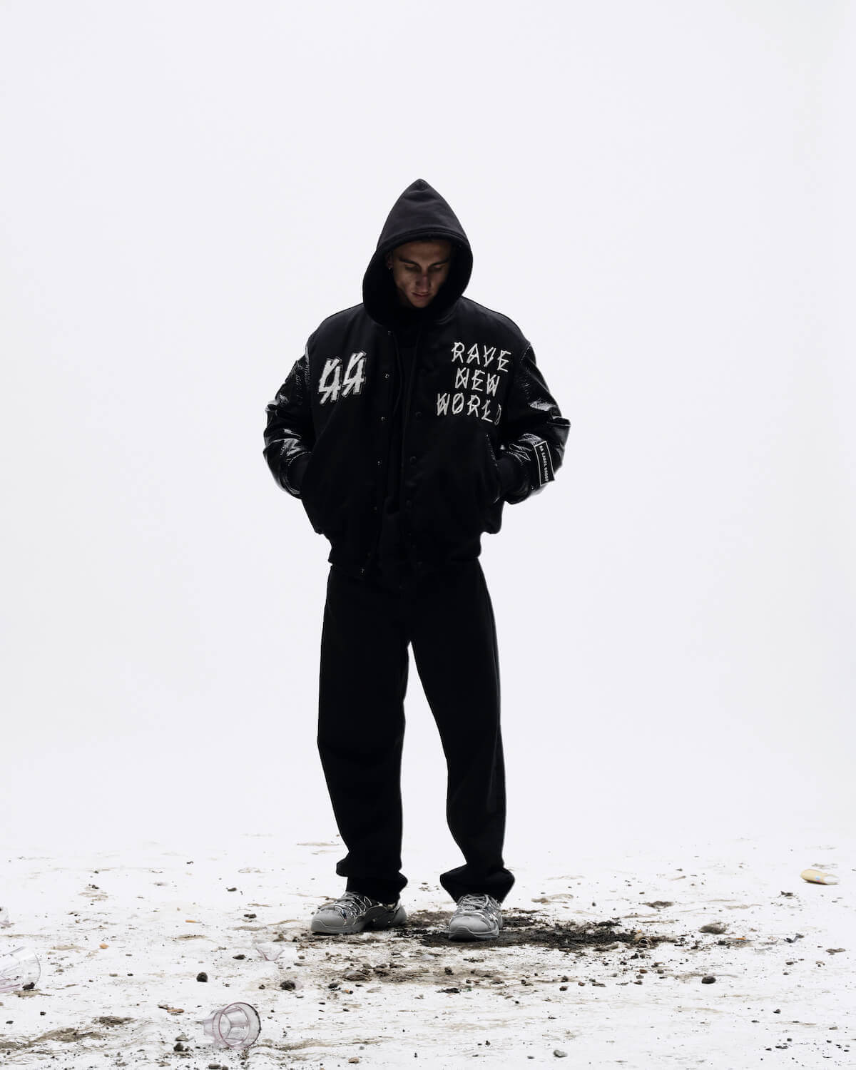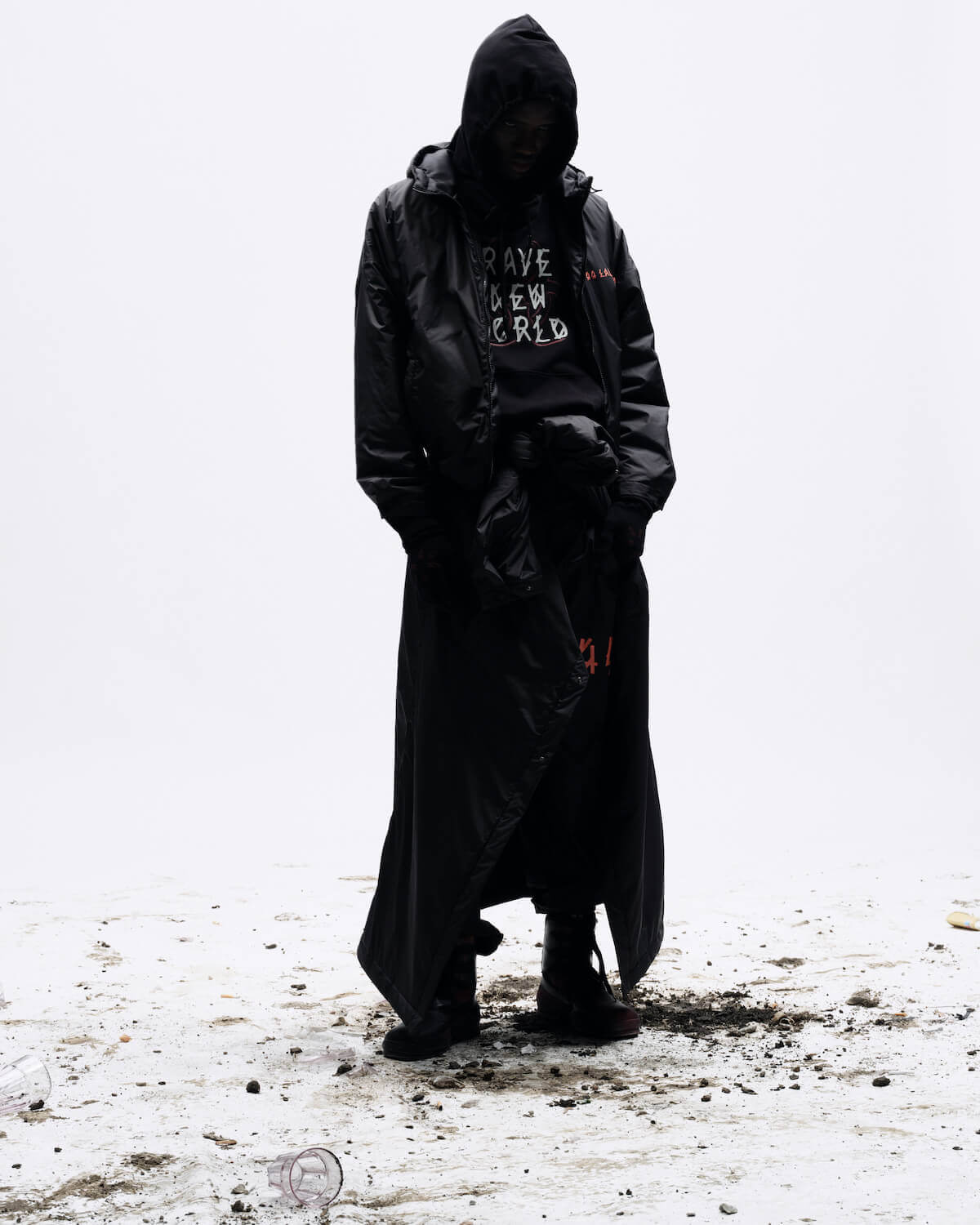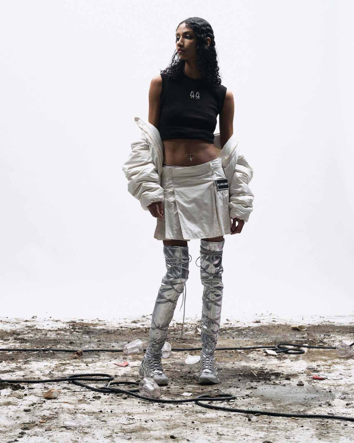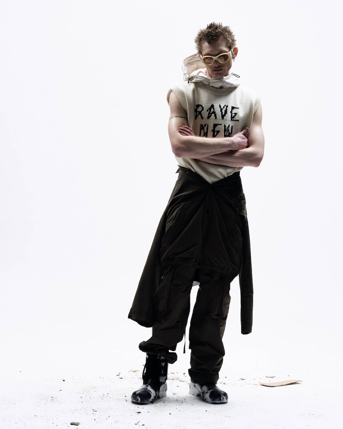 Max Kobosil’s 44 Label Group just dropped its AW23 collection of post-modern rave wear. Constructed from coarse fabrics – washed greyscale denim, textured rubber, rough canvas – to create high-strength utilitarian uniforms, full body boiler suits, pleated combat skirts, huge hoodies and DJ luggage made in collaboration with UDG. Dubbed Blame Society, it sets a desolate scene, muddied and dark, to depict alternate futures and digital dystopia also coursing through the typographic clothes. Berghain Berlin’s rugged bouncer wears the bold designs, cementing the collection’s status as clothes for the club kids of a doomed future.