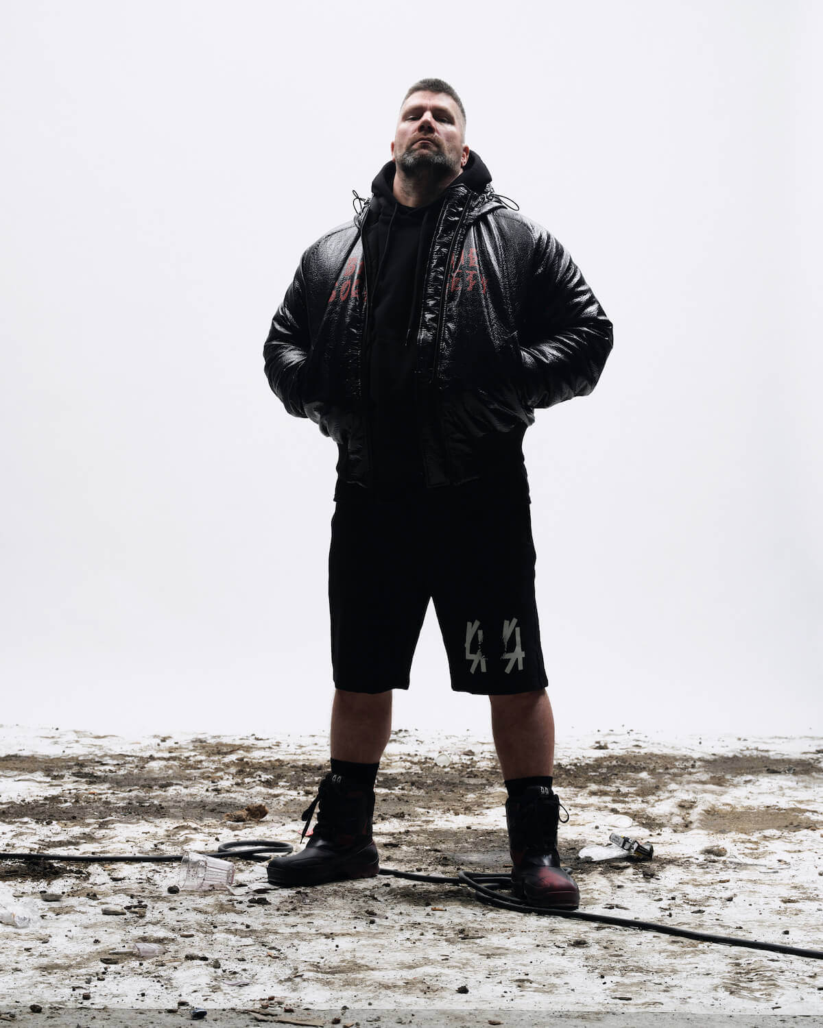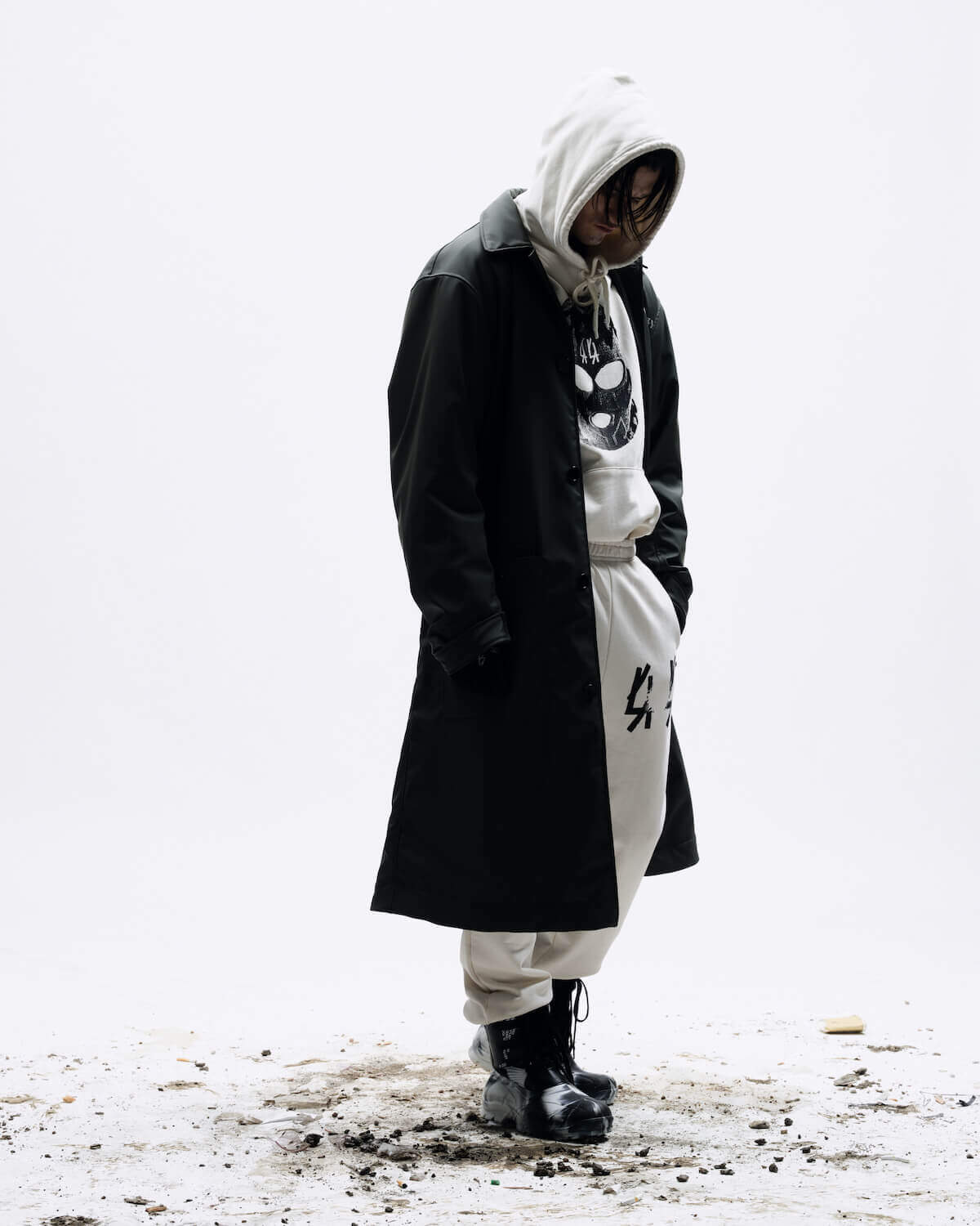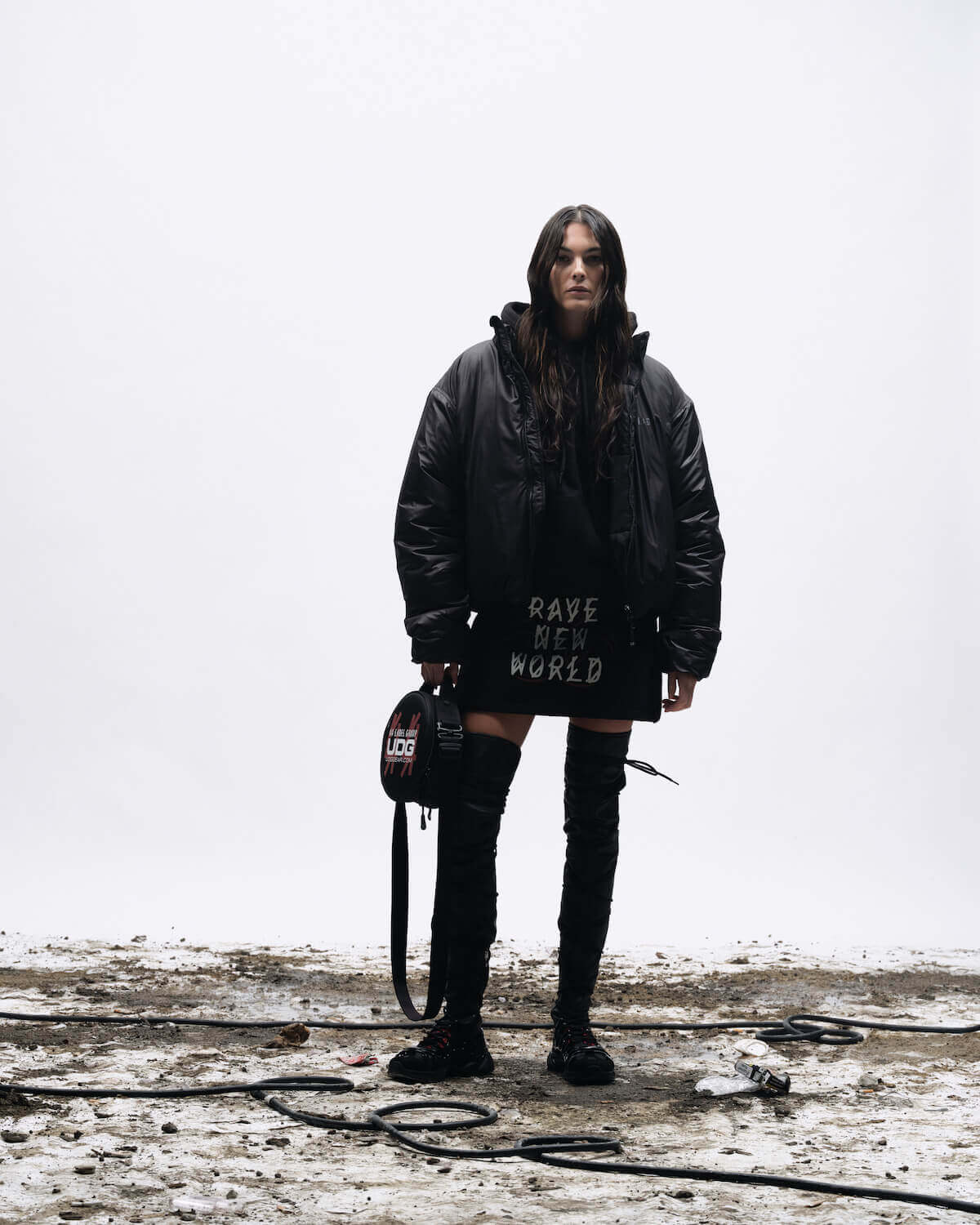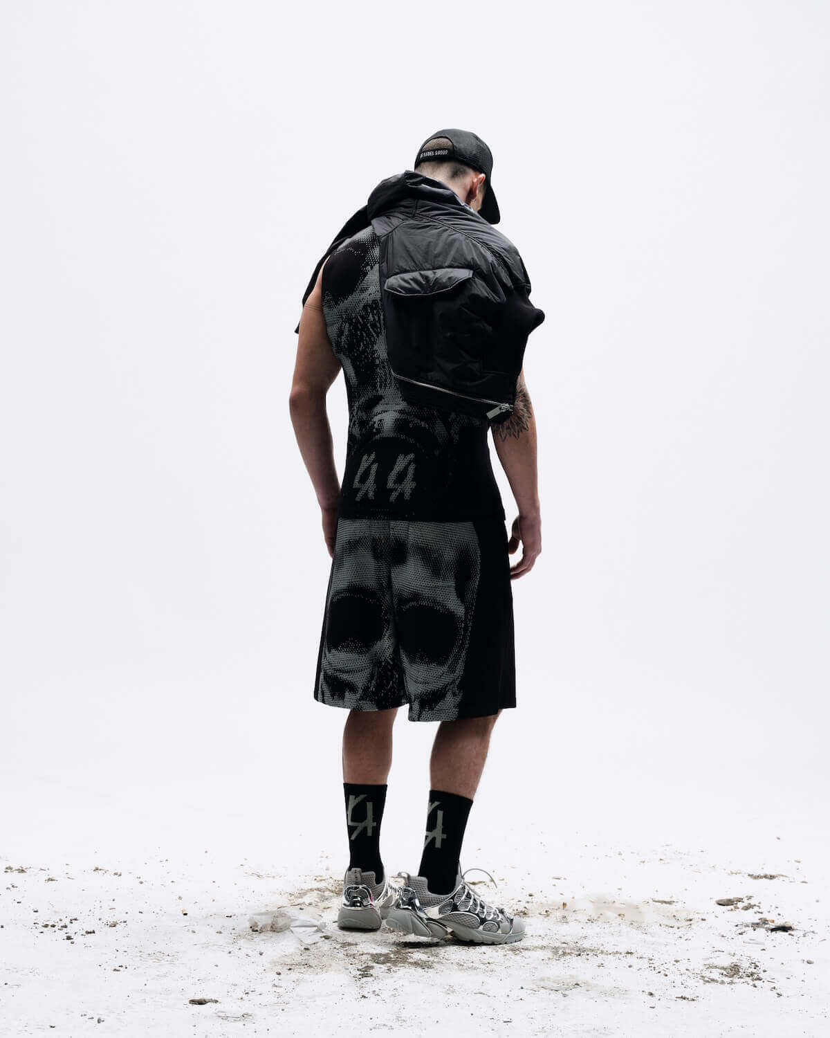 Max Kobosil’s 44 Label Group just dropped its AW23 collection of post-modern rave wear. Constructed from coarse fabrics – washed greyscale denim, textured rubber, rough canvas – to create high-strength utilitarian uniforms, full body boiler suits, pleated combat skirts, huge hoodies and DJ luggage made in collaboration with UDG. Dubbed Blame Society, it sets a desolate scene, muddied and dark, to depict alternate futures and digital dystopia also coursing through the typographic clothes. Berghain Berlin’s rugged bouncer wears the bold designs, cementing the collection’s status as clothes for the club kids of a doomed future.