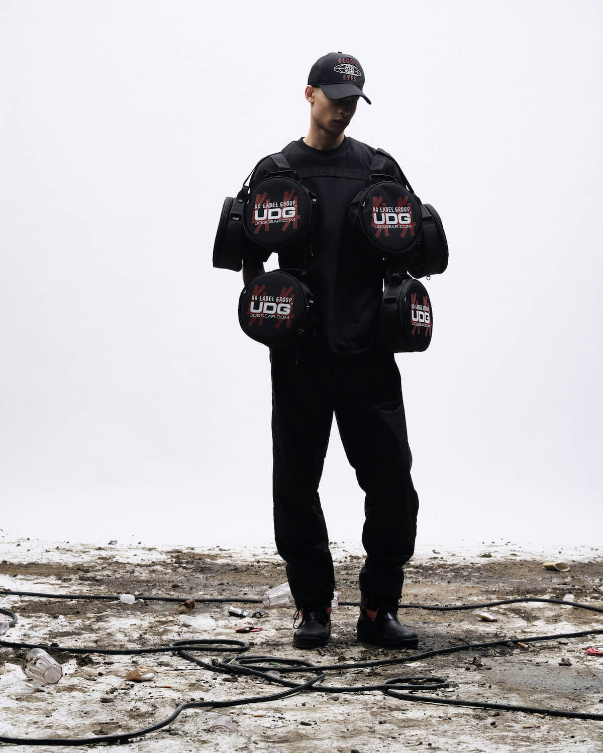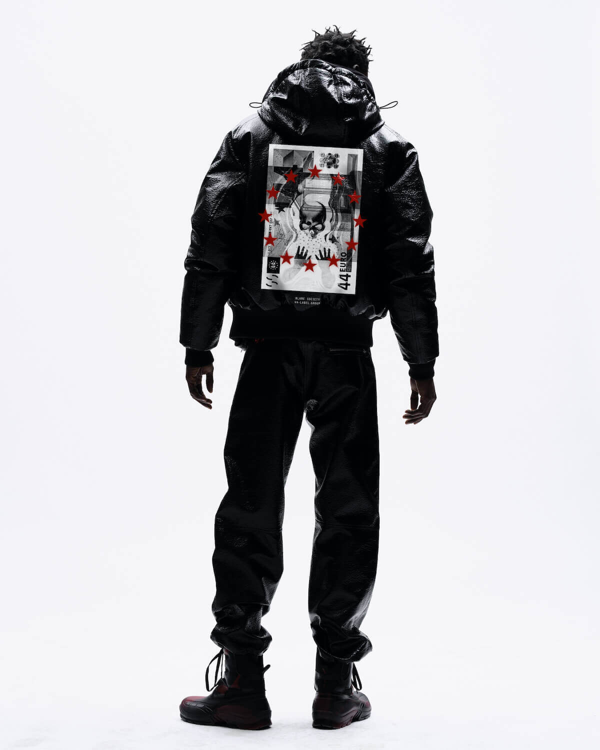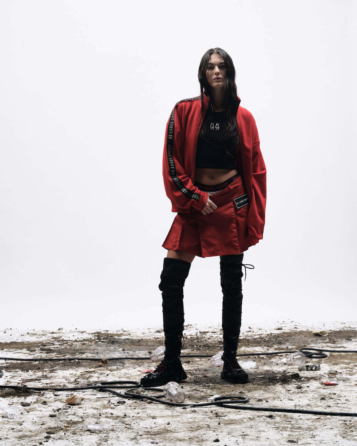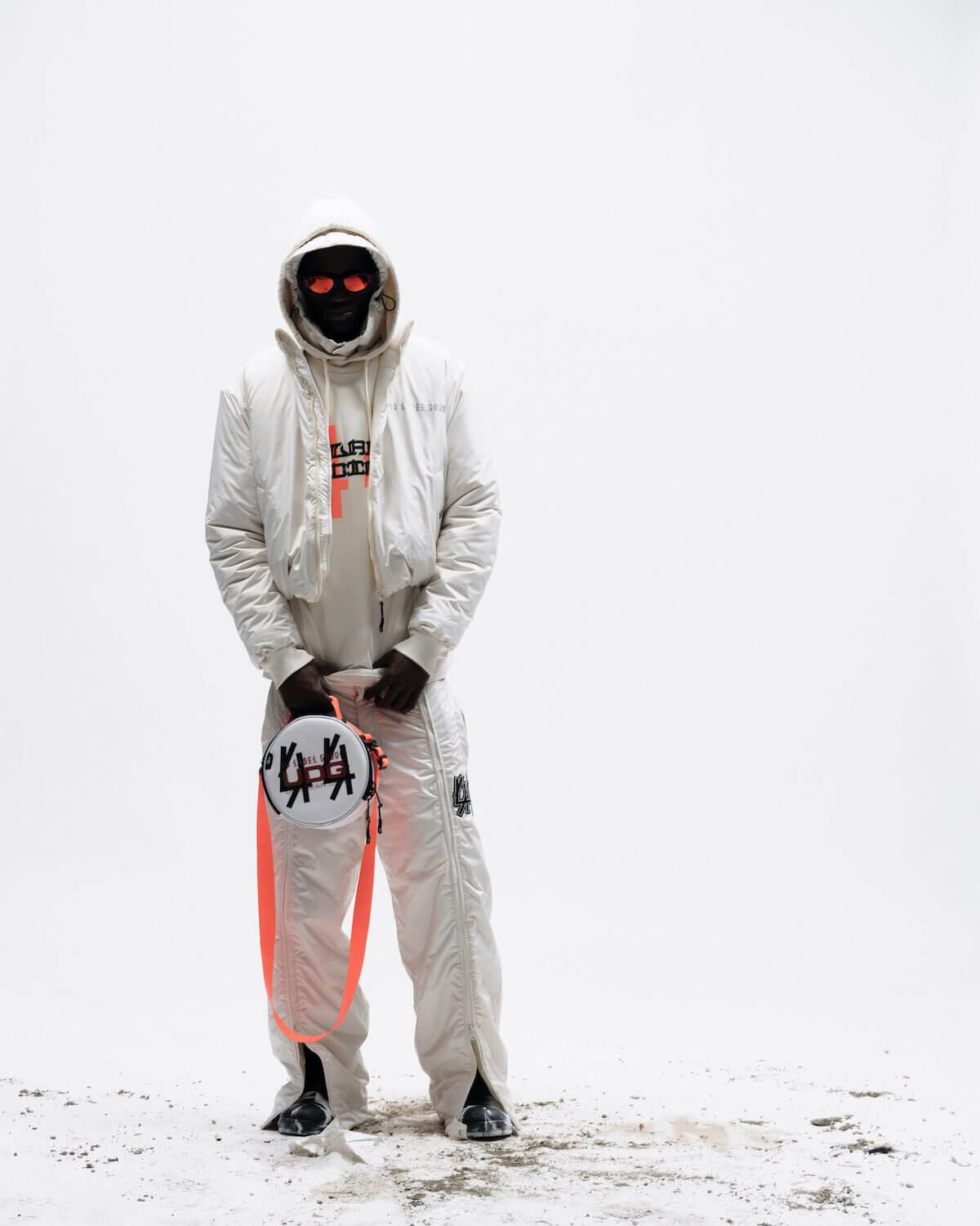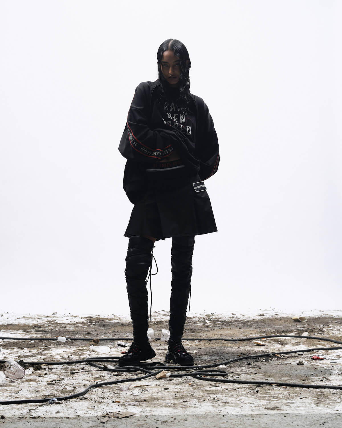 Max Kobosil’s 44 Label Group just dropped its AW23 collection of post-modern rave wear. Constructed from coarse fabrics – washed greyscale denim, textured rubber, rough canvas – to create high-strength utilitarian uniforms, full body boiler suits, pleated combat skirts, huge hoodies and DJ luggage made in collaboration with UDG. Dubbed Blame Society, it sets a desolate scene, muddied and dark, to depict alternate futures and digital dystopia also coursing through the typographic clothes. Berghain Berlin’s rugged bouncer wears the bold designs, cementing the collection’s status as clothes for the club kids of a doomed future.