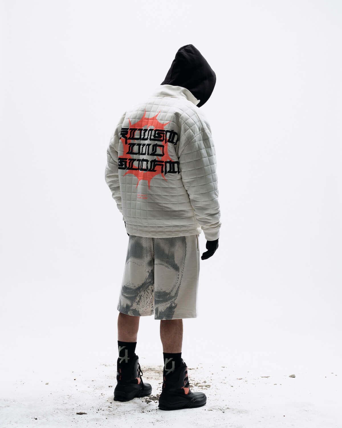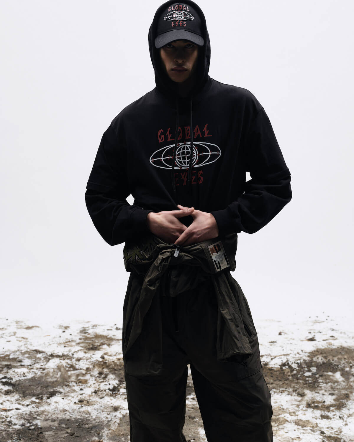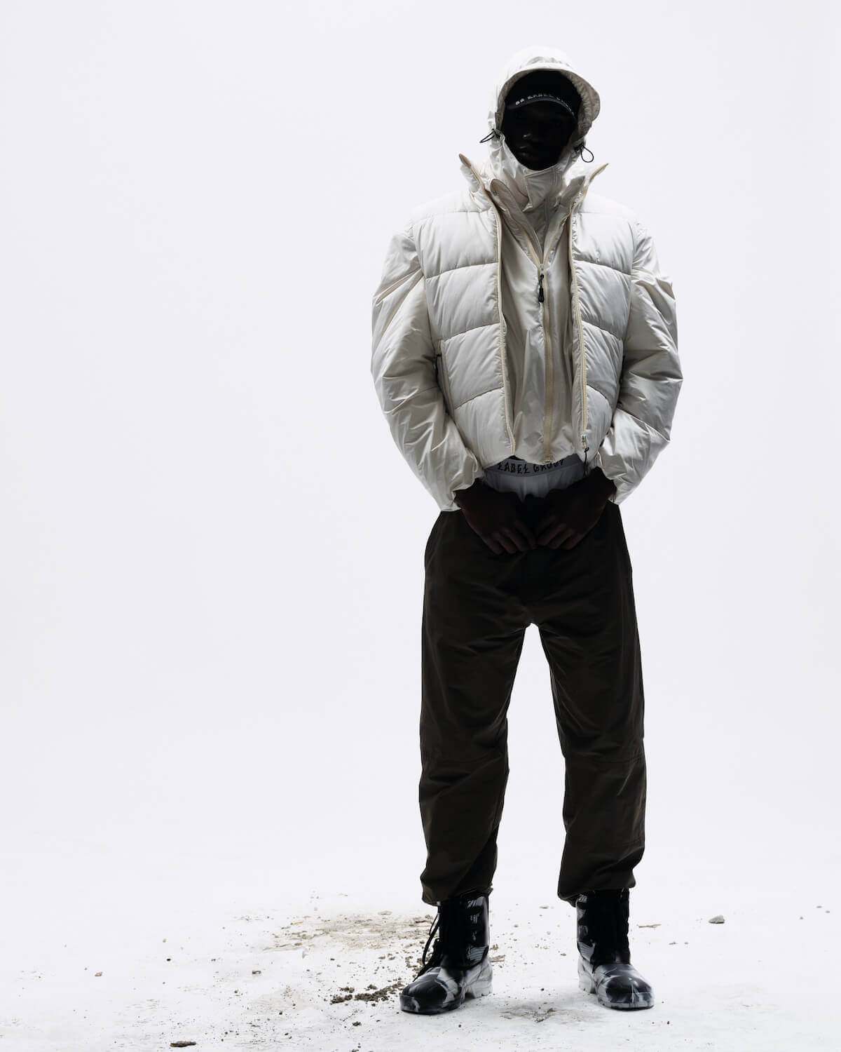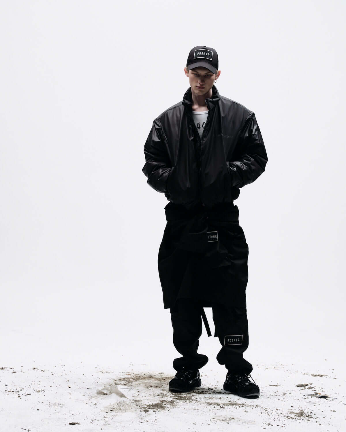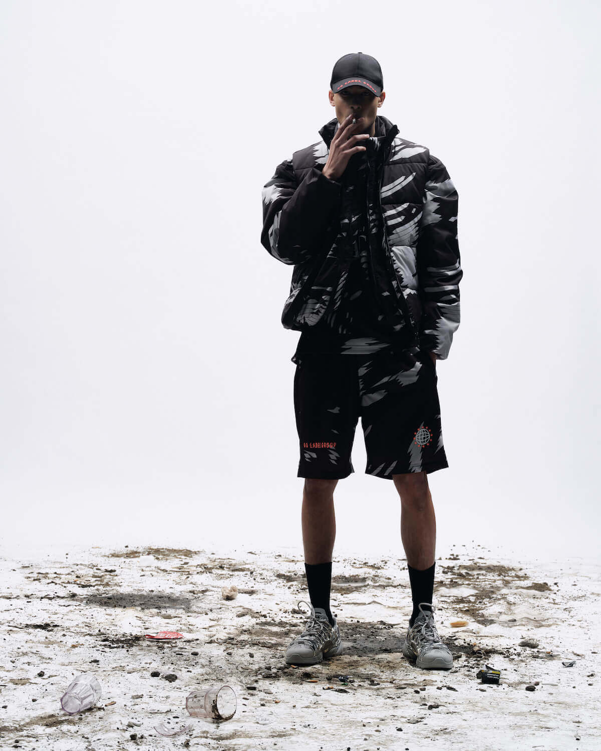 Max Kobosil’s 44 Label Group just dropped its AW23 collection of post-modern rave wear. Constructed from coarse fabrics – washed greyscale denim, textured rubber, rough canvas – to create high-strength utilitarian uniforms, full body boiler suits, pleated combat skirts, huge hoodies and DJ luggage made in collaboration with UDG. Dubbed Blame Society, it sets a desolate scene, muddied and dark, to depict alternate futures and digital dystopia also coursing through the typographic clothes. Berghain Berlin’s rugged bouncer wears the bold designs, cementing the collection’s status as clothes for the club kids of a doomed future.