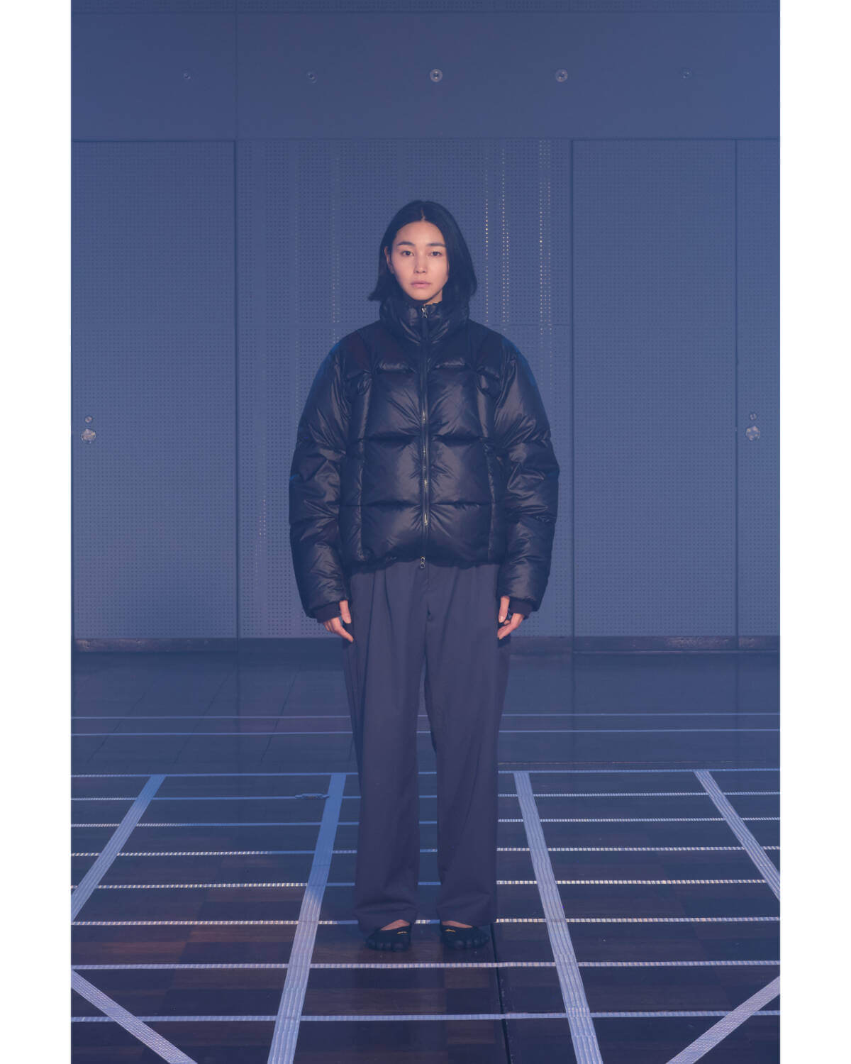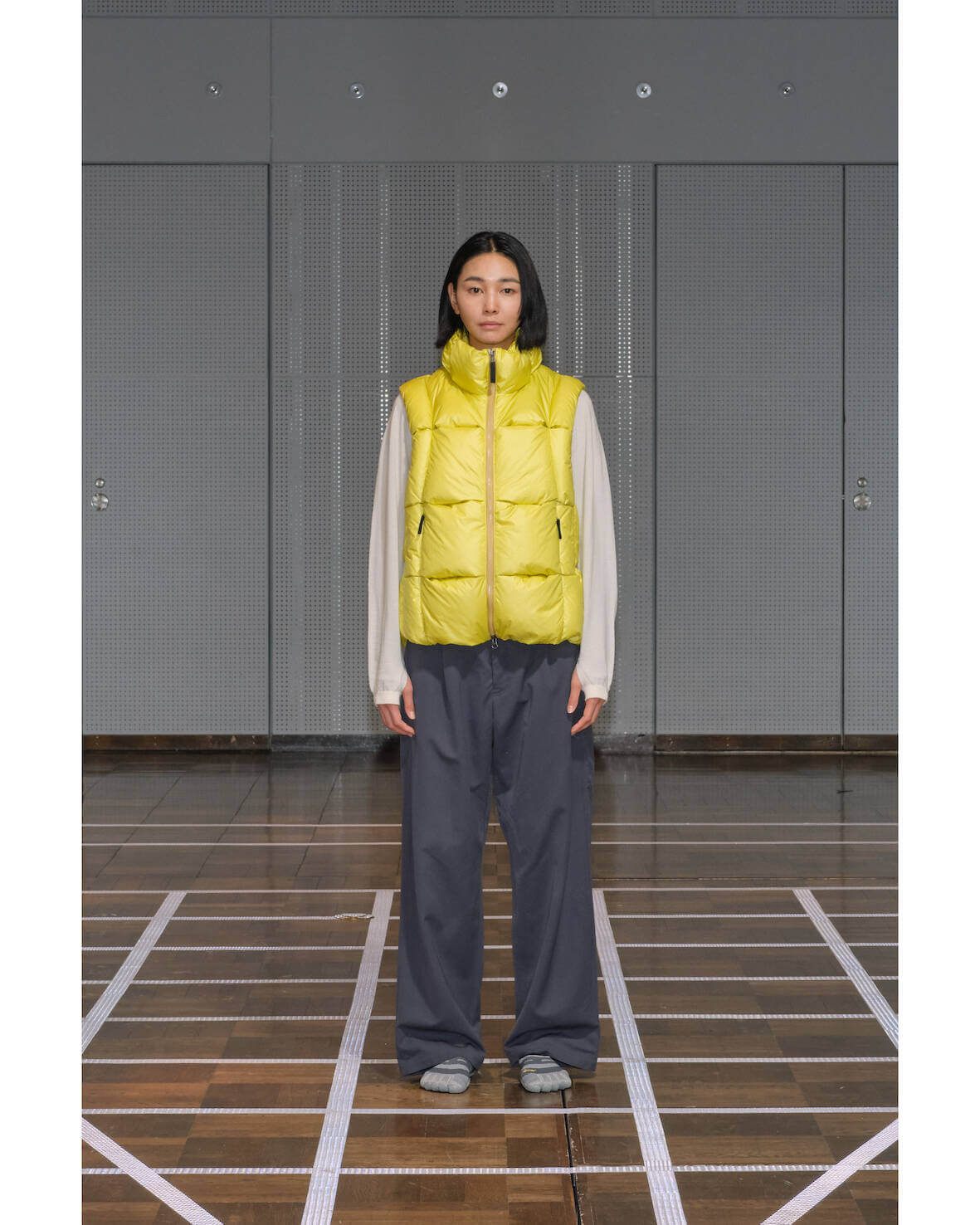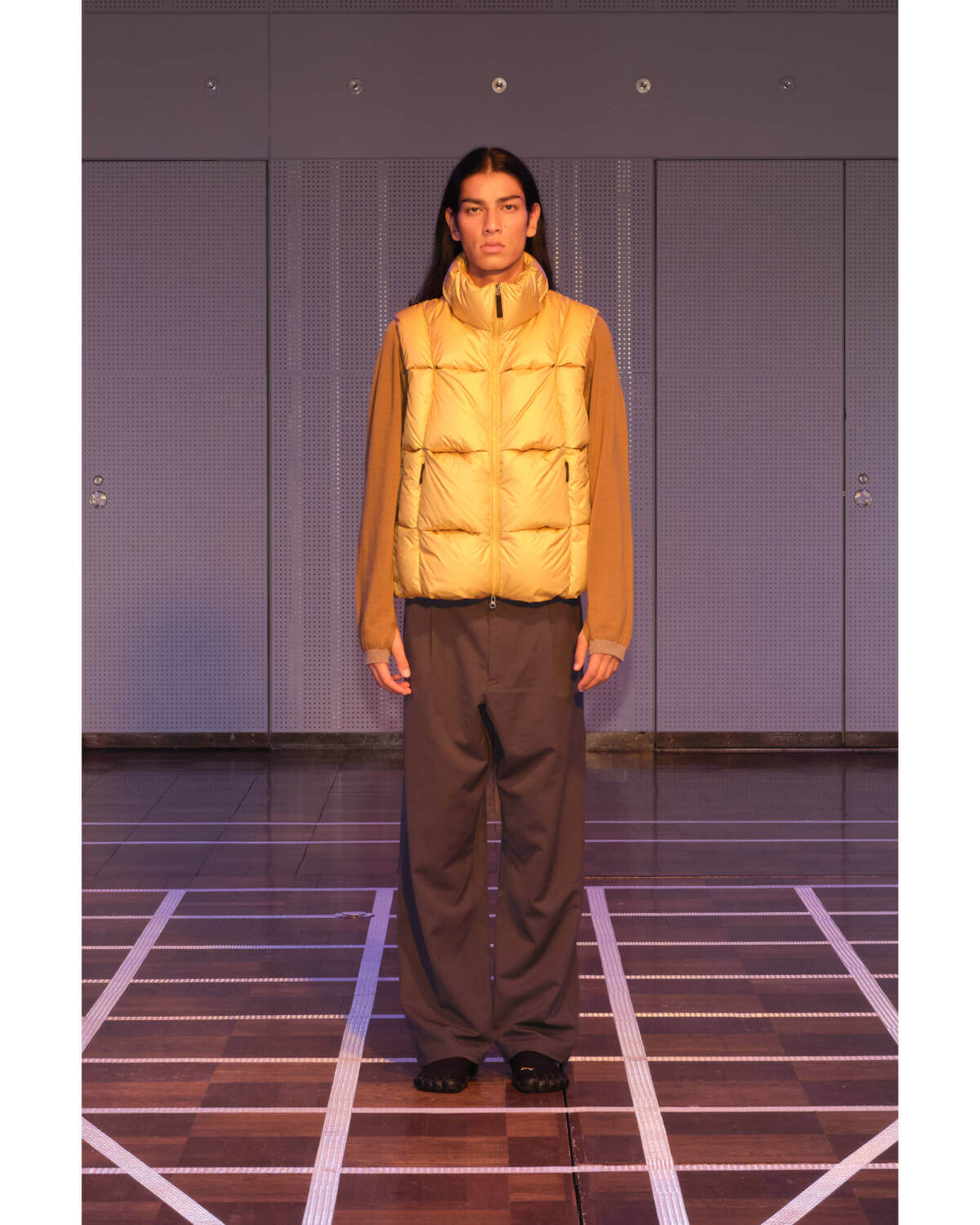 The collection itself is a concoction of recycled down jackets with 3D baffle construction, knit pullovers and pants that somehow merge the elegance of tailored pants with the utility of climbing gear.