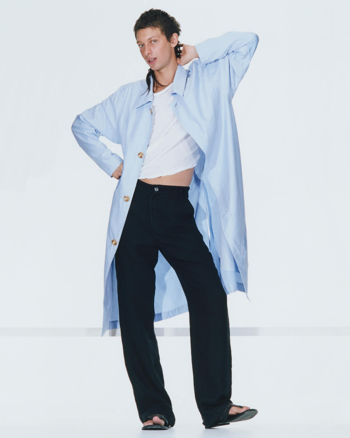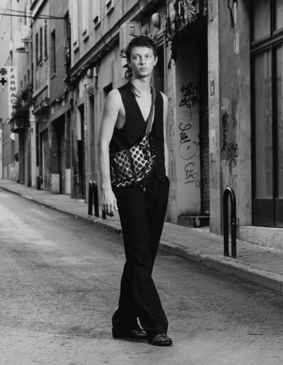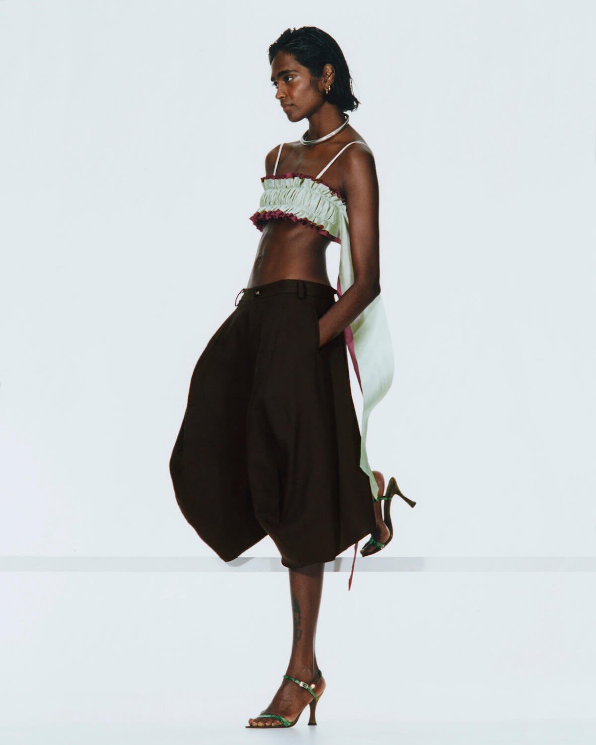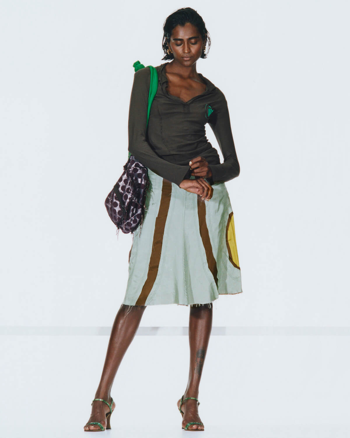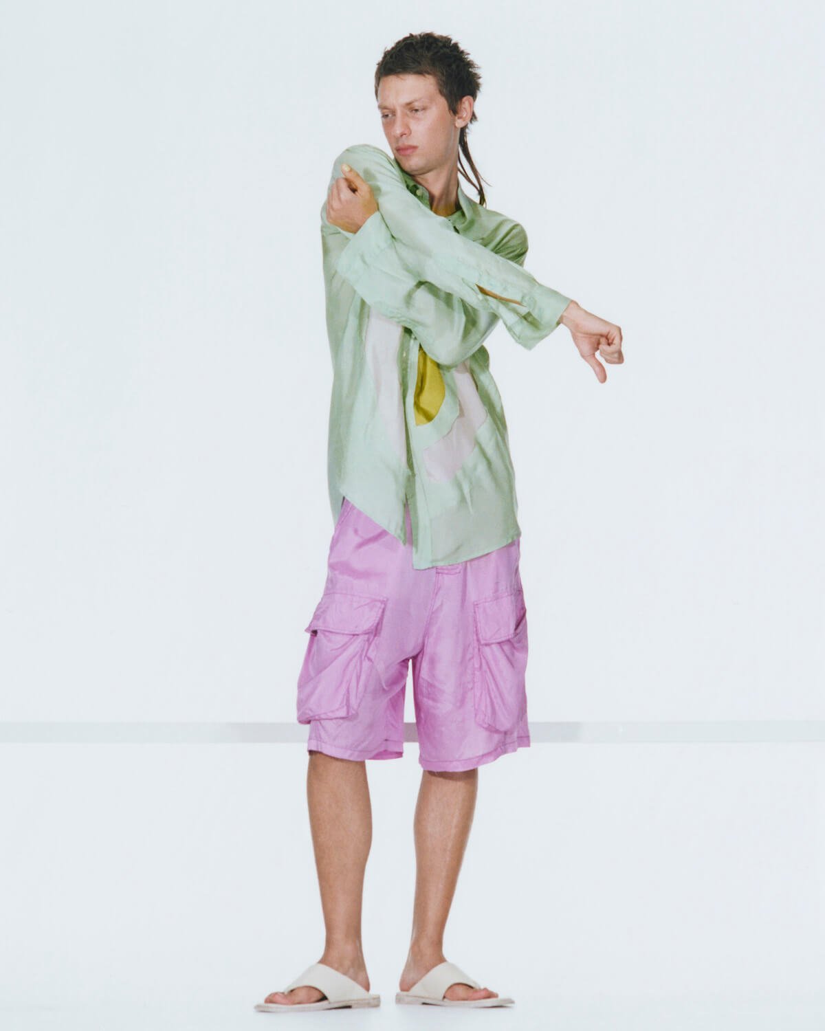 SS23 sees Edward Cuming’s experimental expertise come to life. The sunset-coloured spring collection, aptly dubbed Thirsty, is a sexy assortment of deconstructed dressy elements and body-wrapping silhouettes. Staples of the namesake label of the Australian-born, Madrid-based designer and Central Saint Martins Menswear MA graduate, are rife, spanning androgynous treatments and strange sartorialism. Playing with concepts of inversion, subverting traditional techniques and highlighting imperfections, slouchy trousers, sharp tailored garments and see-through summer knits are all on offer. The new generation designer said, “I want to encourage people to try a garish, silky, purple pair of trousers – to feel excited, bold and confident in what they wear and who they are – even if it won’t sell thousands of units.”