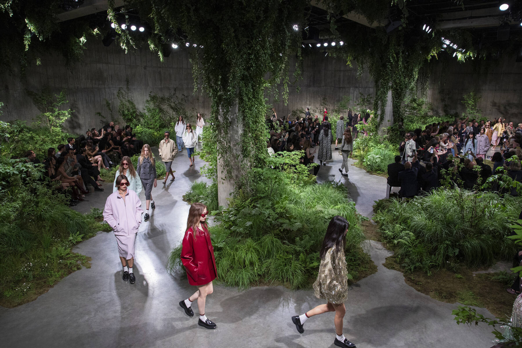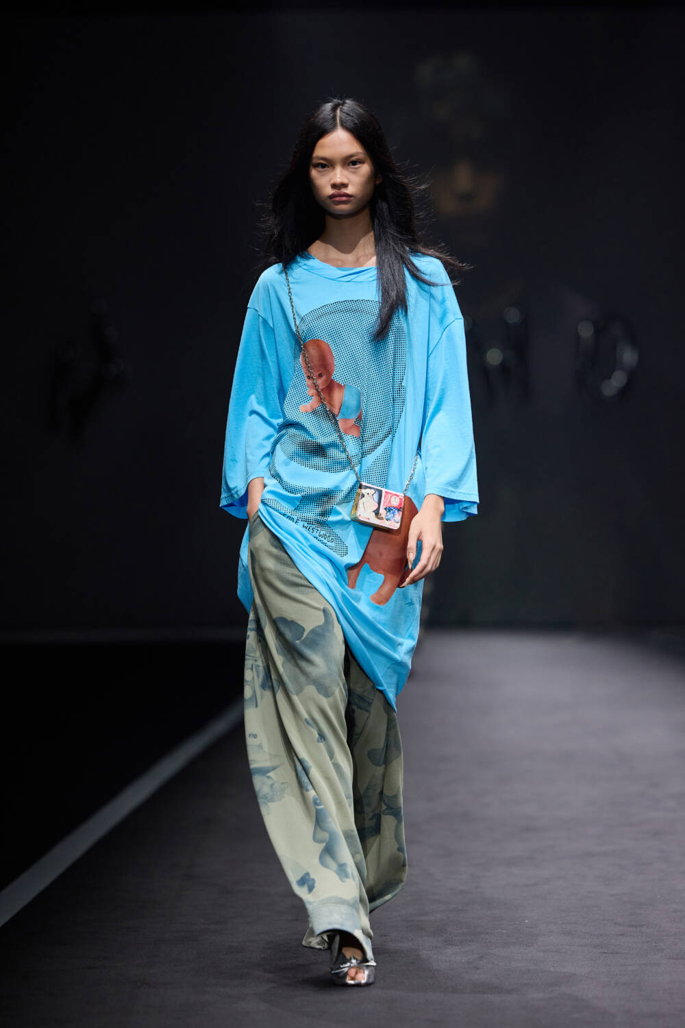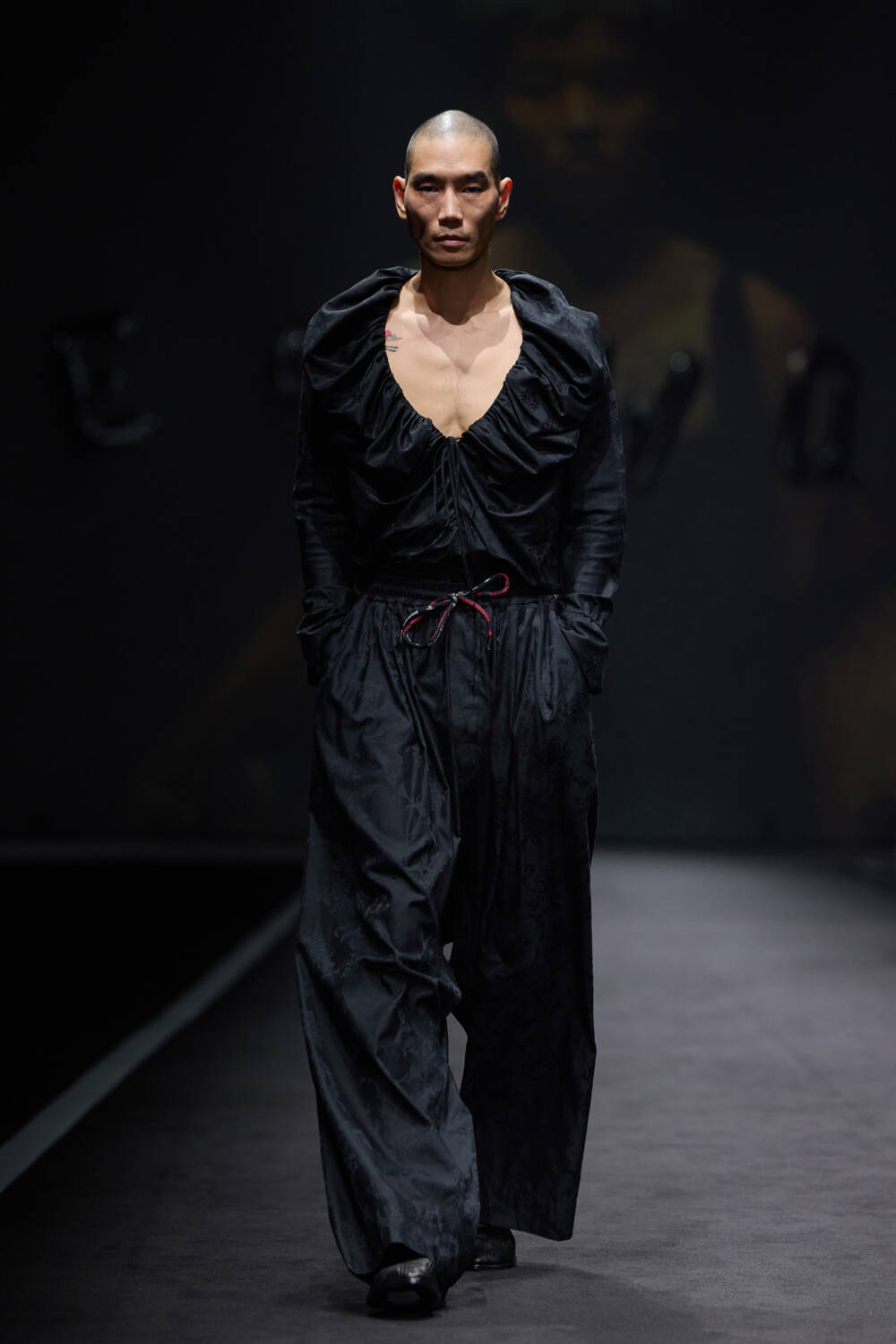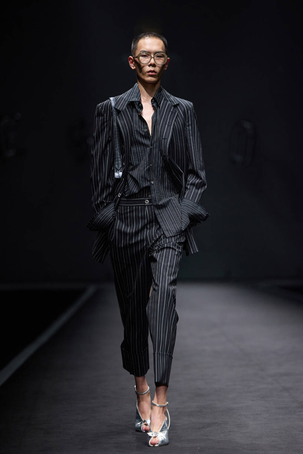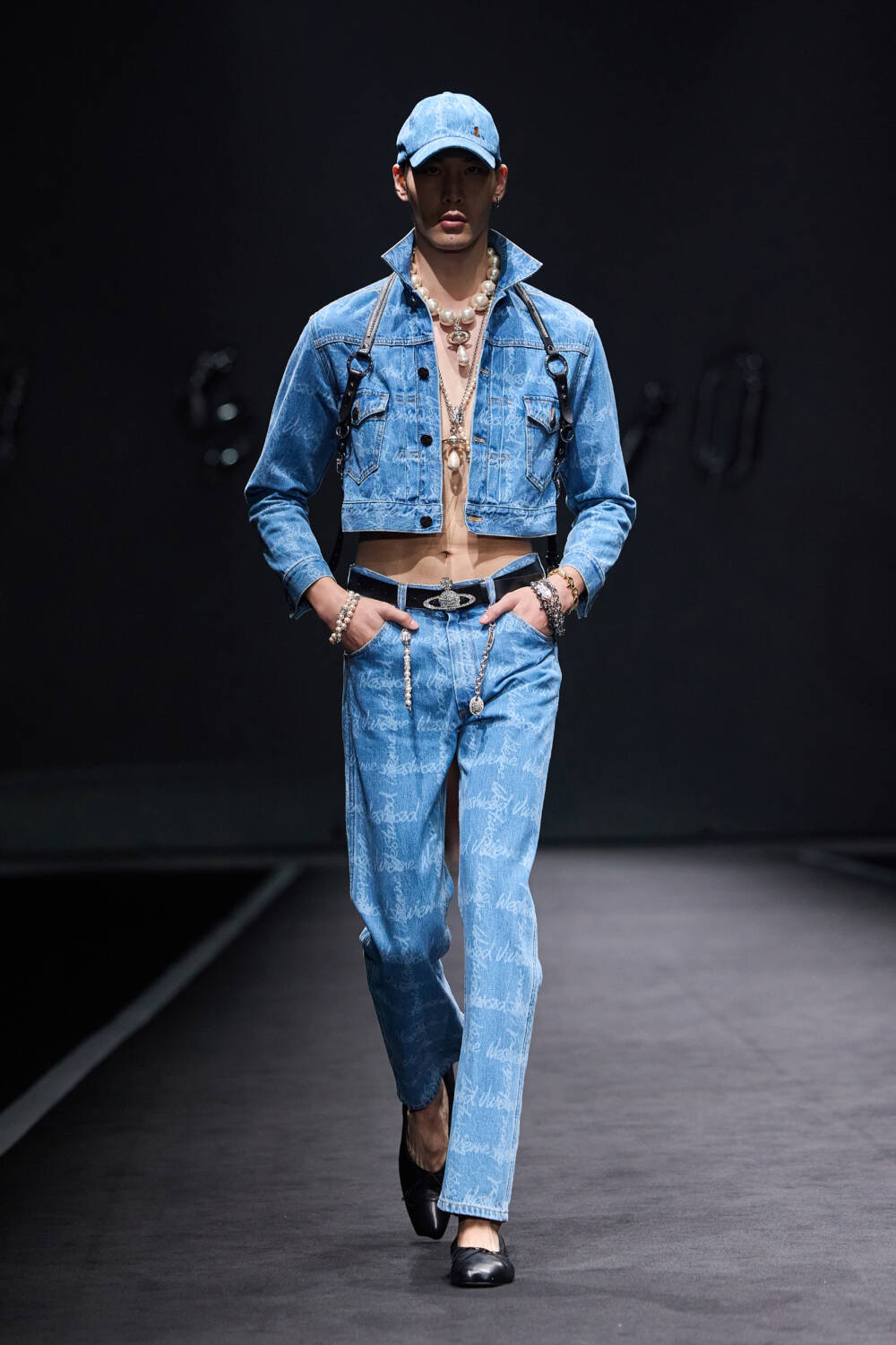 After a five-year break from the runway, Vivienne Westwood took to Shanghai to present its spring/summer 2025 collection, framed as a dialogue between the clothes and the people wearing them. The collection opened with a pinstriped black suit that would make even Lydia Deetz smile, followed by a series of equally dark, almost gothic ensembles with low necklines and long silhouettes that transitioned seamlessly from funeral-to-funfair. Soon, more colour was introduced with neon yellow pinstripe suiting and twill scarves and a few fun nods to the house’s codes – think check denim, Britishness, structured tailoring and brand favourites like the Sunday dress and Monday skirt. There were also some characteristically innovative elements like a series of T-shirts with scaled up photographs of random ceramic figurines printed in newspaper print.