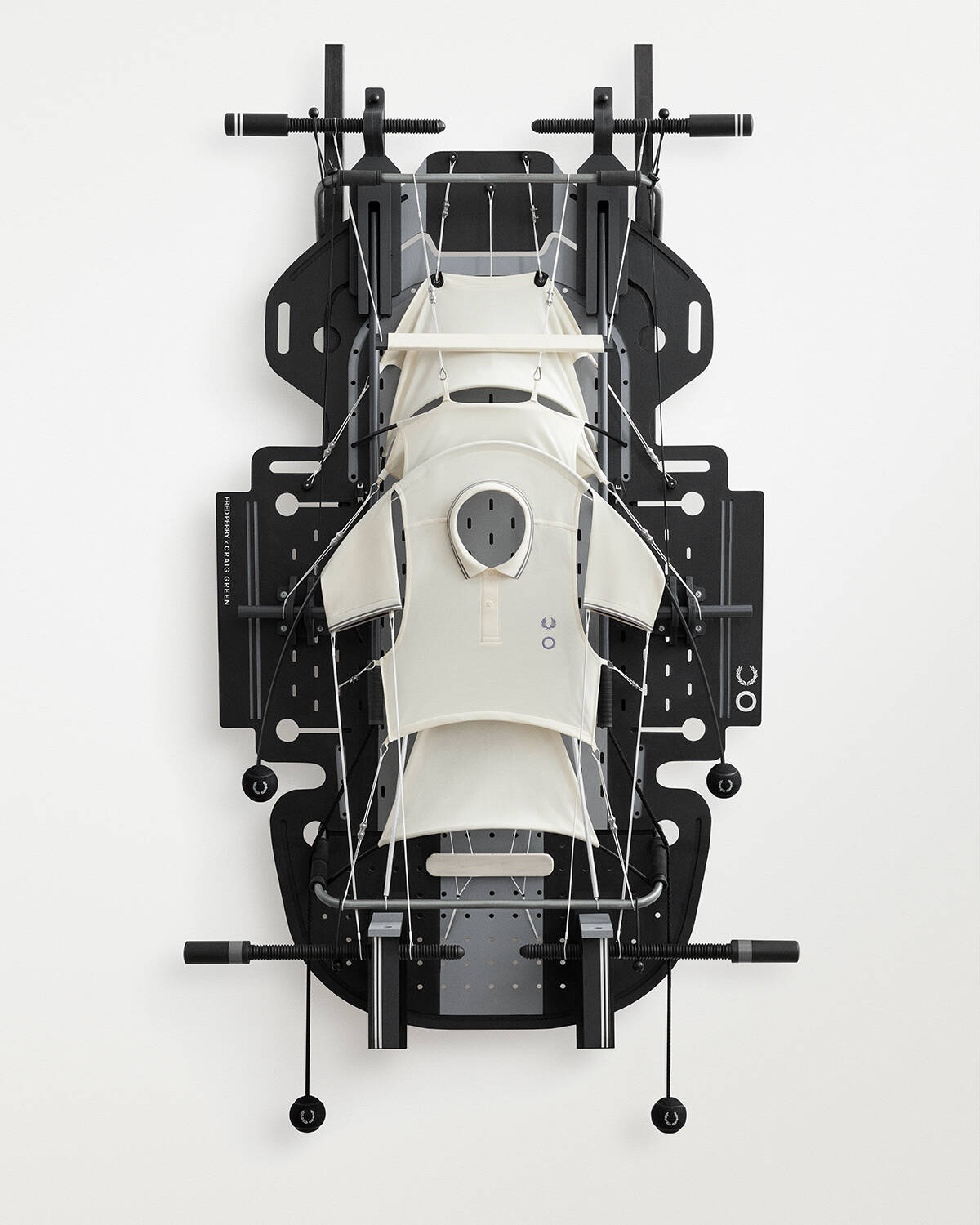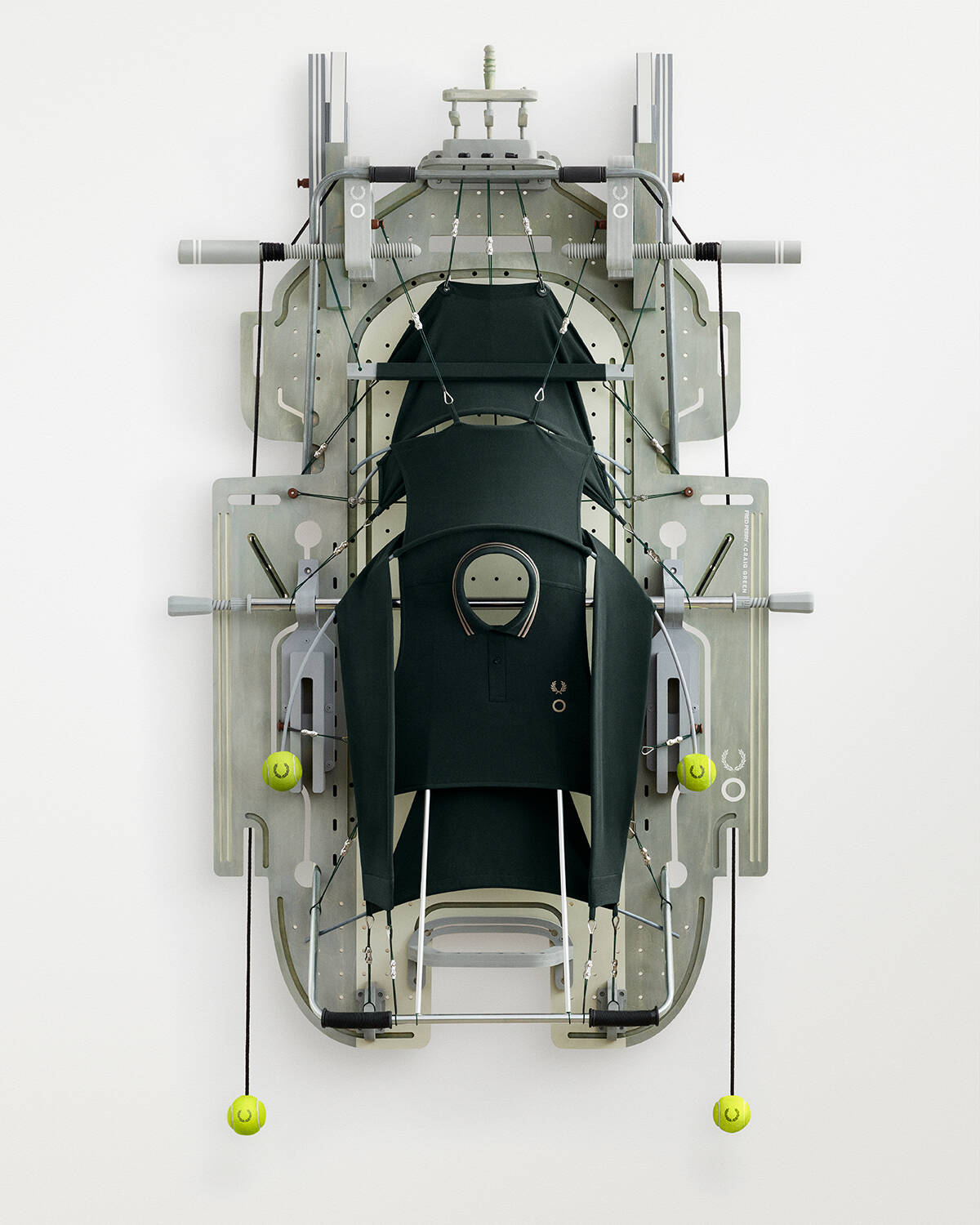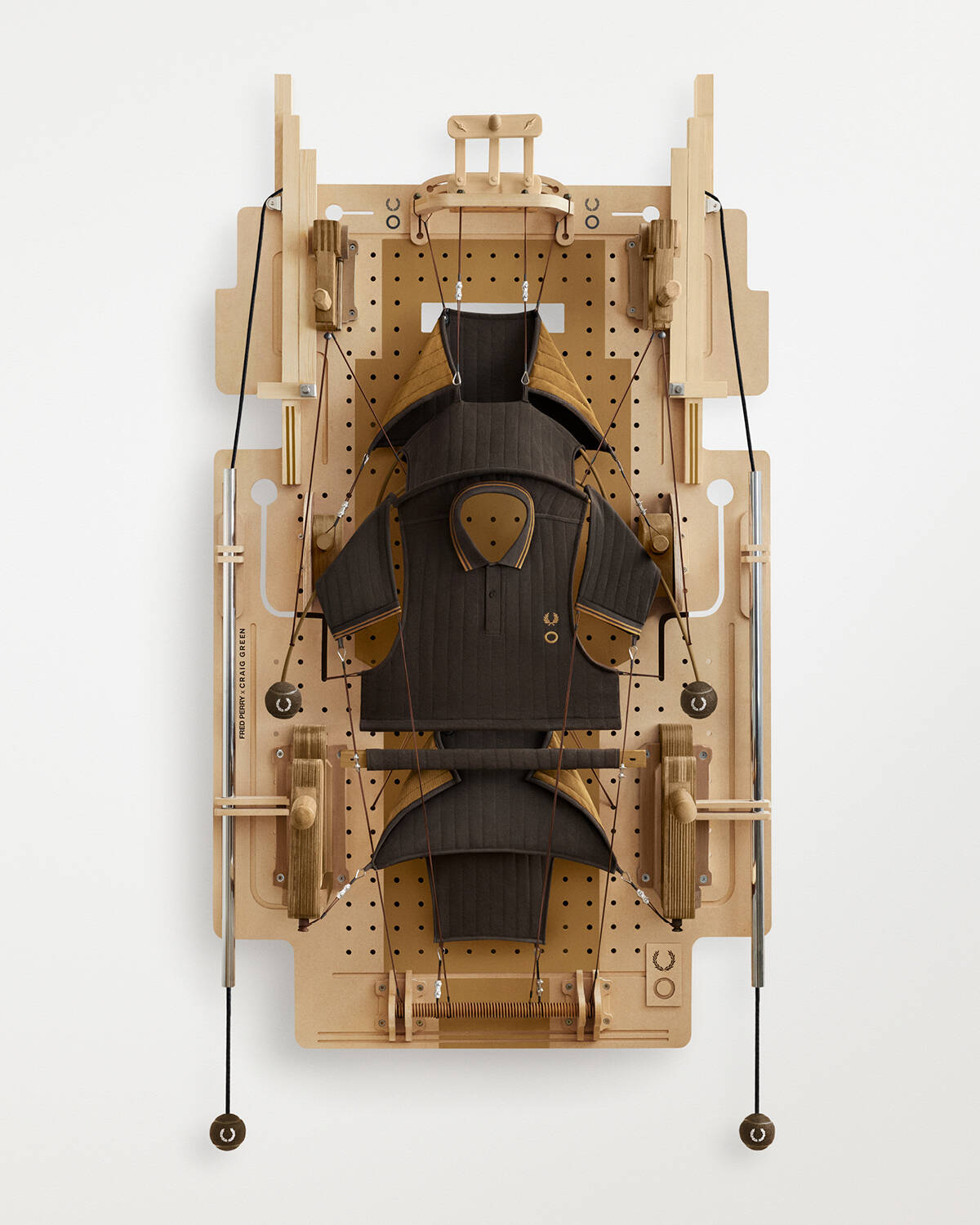 Comprised of four polos the collection becomes the “uniform of the non-uniform” according to a press release: a duo of reversible shirts feature doubled fabrics and contrasting faces, whilst two quilted polos spotlight Green’s signature stitched channels which run through the tops. In a campaign photographed by Amy Gwatkin, the polos are meticulously stretched out onto sculptural machines. With set design by David Curtis-Ring, a frequent collaborator of Green’s, two of the mechanical sculptures will be displayed in Dover Street Market London from today. Freya Goodchild-Bridge