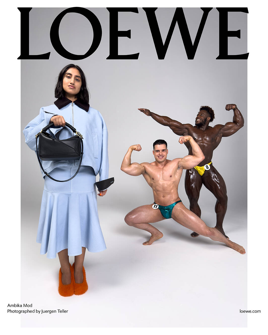 Drew Starkey, Ambika Mod and two bodybuilders walk into a bar… this, among other unexpected combinations is the premise of Loewe’s SS25 precollection campaign. Shot by superstar photographer Juergen Teller, the images seek to present fans of the Spanish luxury brand with a commentary on the duality existing between talent and personality: human archetypes – represented by some of the creatives that have formed the ever-evolving cult around creative director Johnathan Anderson and Loewe – appear on white backgrounds alongside human stereotypes like the gardener, the bodybuilder, and the biker. Netflix’s Richard Gadd, of Baby Reindeer fame, poses next to an agriculturist with a giant vegetable, Sue Kroll beside a swim-suit-clad surfer and Leo Woodall by a very swanky looking knight. The point? To show that characters are defined by what they wear, that dress is costume and that a good sense of humour goes a long way. Joshua Beutum