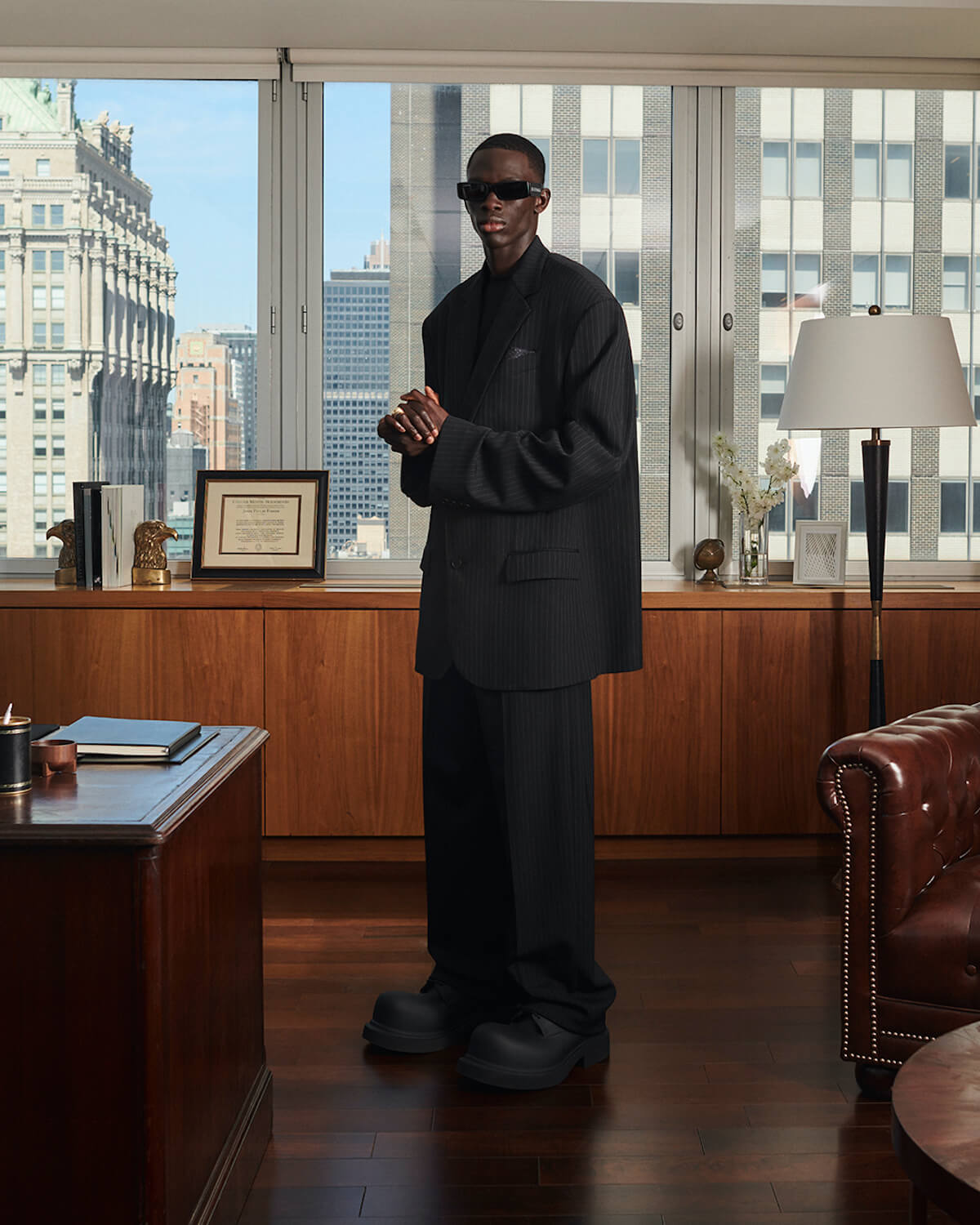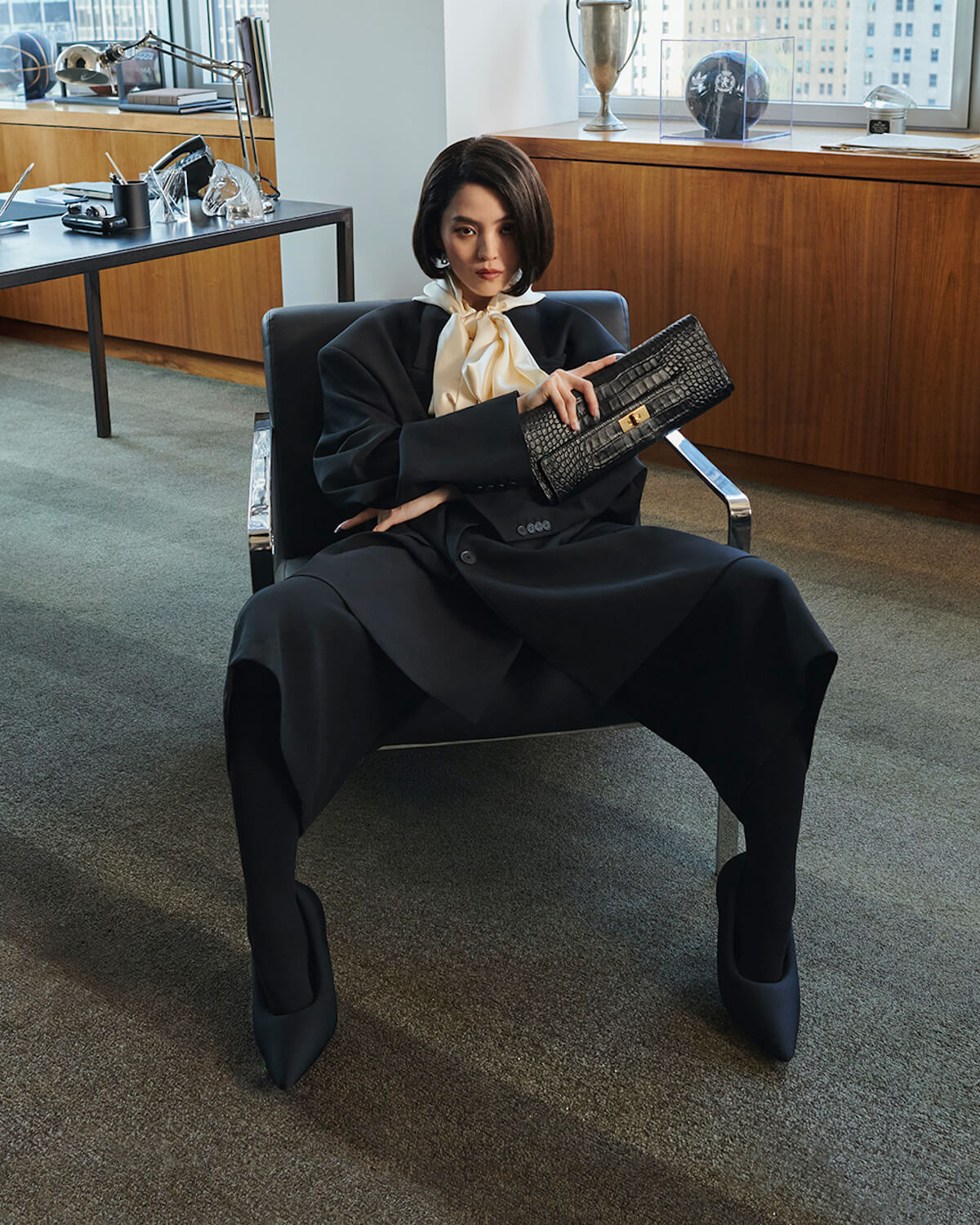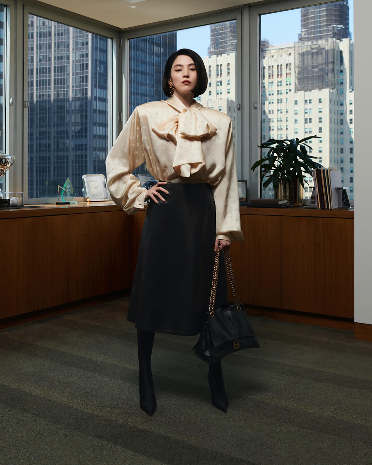 First seen on the trading room floor of the New York Stock Exchange, Balenciaga’s Garde Robe collection just rematerialized in an ironically humdrum campaign for spring 2023. Documented by award-winning photojournalist Joshua Bright – and with Rosie Marks behind the video – Nicole Kidman (Demna‘s new muse), Isabelle Huppert, Han So Hee, Bella Hadid and Khadim Sock look lavish in the centre of a mundane Manhattan office space. Surrounded by somewhat dated day-to-day office paraphernalia such as landline phones, desktop computers, jars of pens, cut glass awards, piles of paper, folders and cardboard boxes, Balenciaga power suiting and key accessories come to the fore – fashioned from wool, silk, gabardine, and artisanal denim. Emily Phillips