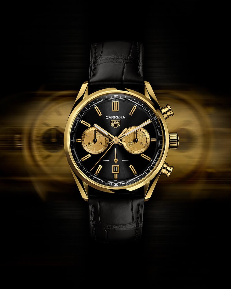 Tag Heuer’s ultimate driver’s watch just got the golden treatment. In a captivating black and 18K yellow gold, the Carrera Chronograph is reborn, taking inspiration from an iconic racing livery to reinforce the collection’s connection to motorsport. Known as the wrist piece of choice to many of Formula 1’s best drivers and teams for decades, its sophisticated deep black dial, golden gilded subdials and overall sleek design give it the legs to stand out in a sea of bespoke timepieces. First designed in 1963 with the racetrack in mind, the Carrera has embodied many different expressions of itself. In 1970, the first yellow gold automatic models were introduced: the 1158 CHN. Now inverted, the watch is just as attractive as it was in the ’70s, but with a new black alligator strap, a gold pin buckle and a highly legible and utterly uncluttered face. Shop now. EP