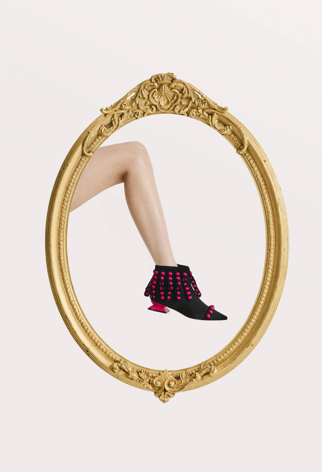 Available from the 13 of May, the first ‘A Splendid Blahnik’ style for Summer 24 is the ‘Sene’, a black satin boot with a bright pink sculptural heel and pom poms. Already the brand is renowned for its timeless and exclusive designs, and the codes of the ‘Sene’ holds testament to this through its detailed crotchet tassels and bold silk-covered accoutrements which are inspired by the architecture and fashion Belle Epoque era.