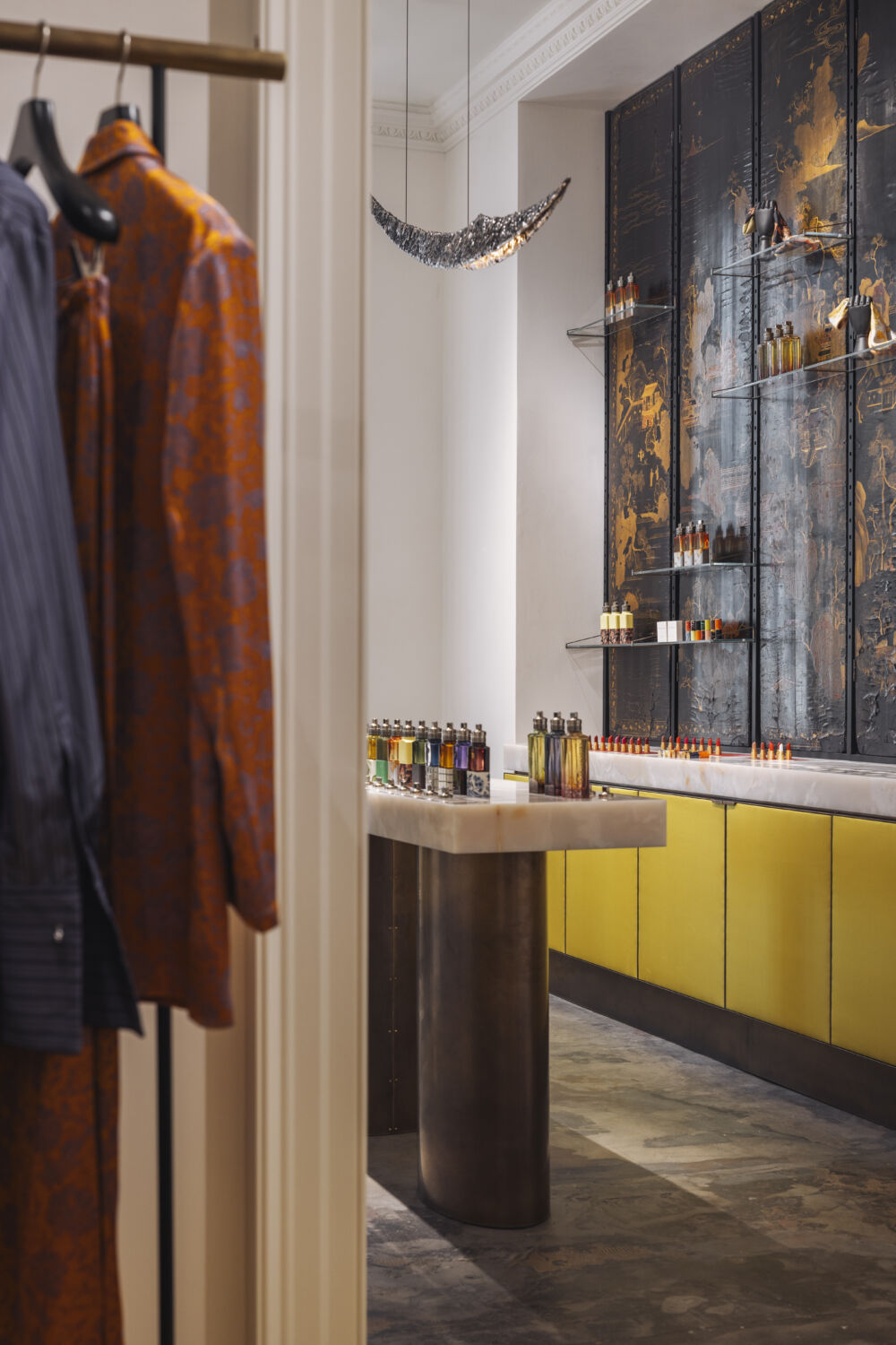 In a major move for Dries Van Noten, the Antwerp-based brand has opened the doors to its first-ever London flagship store, transforming a former bank into a 270-square-meter, two-floor space. The store blends fashion, fragrance, beauty, antiques and design in a richly curated environment reflecting the brand’s distinctive style. Contrasts define the interior: contemporary yet historic, refined yet eclectic. Highlights include a Vladimir Slavov Labia chandelier, a William Waterhouse artwork and a Collier Webb mirror that plays with light and perspective.