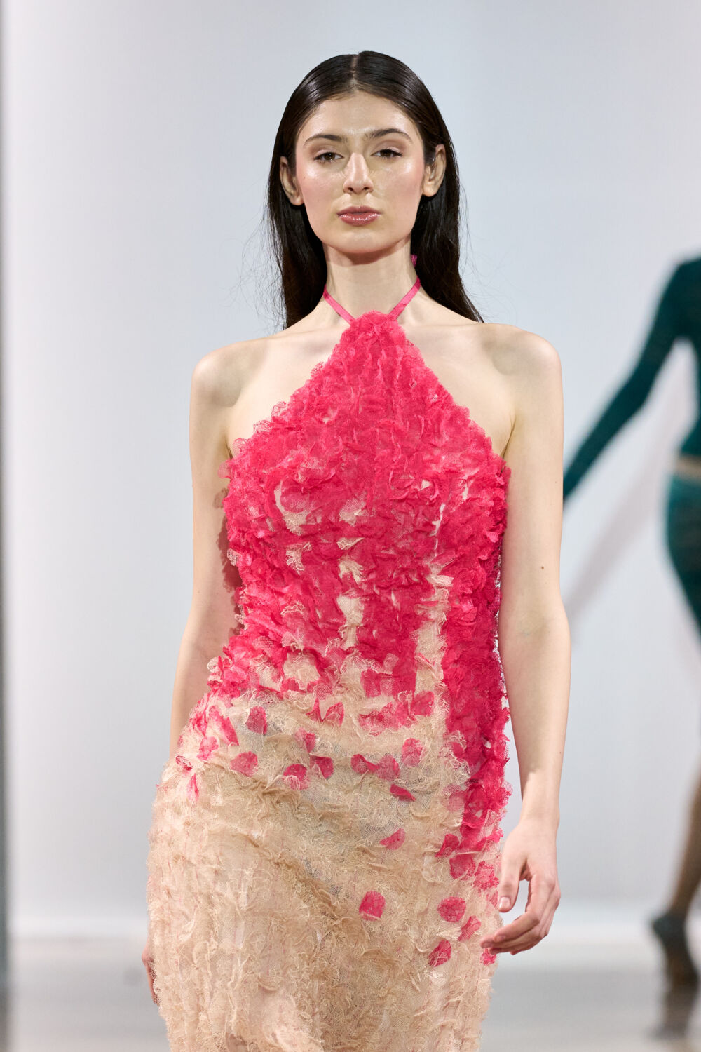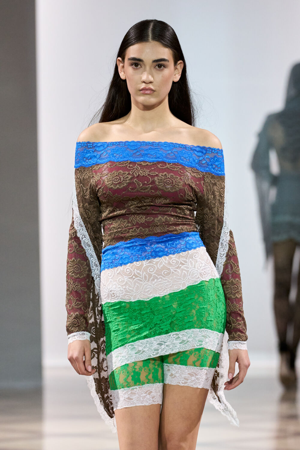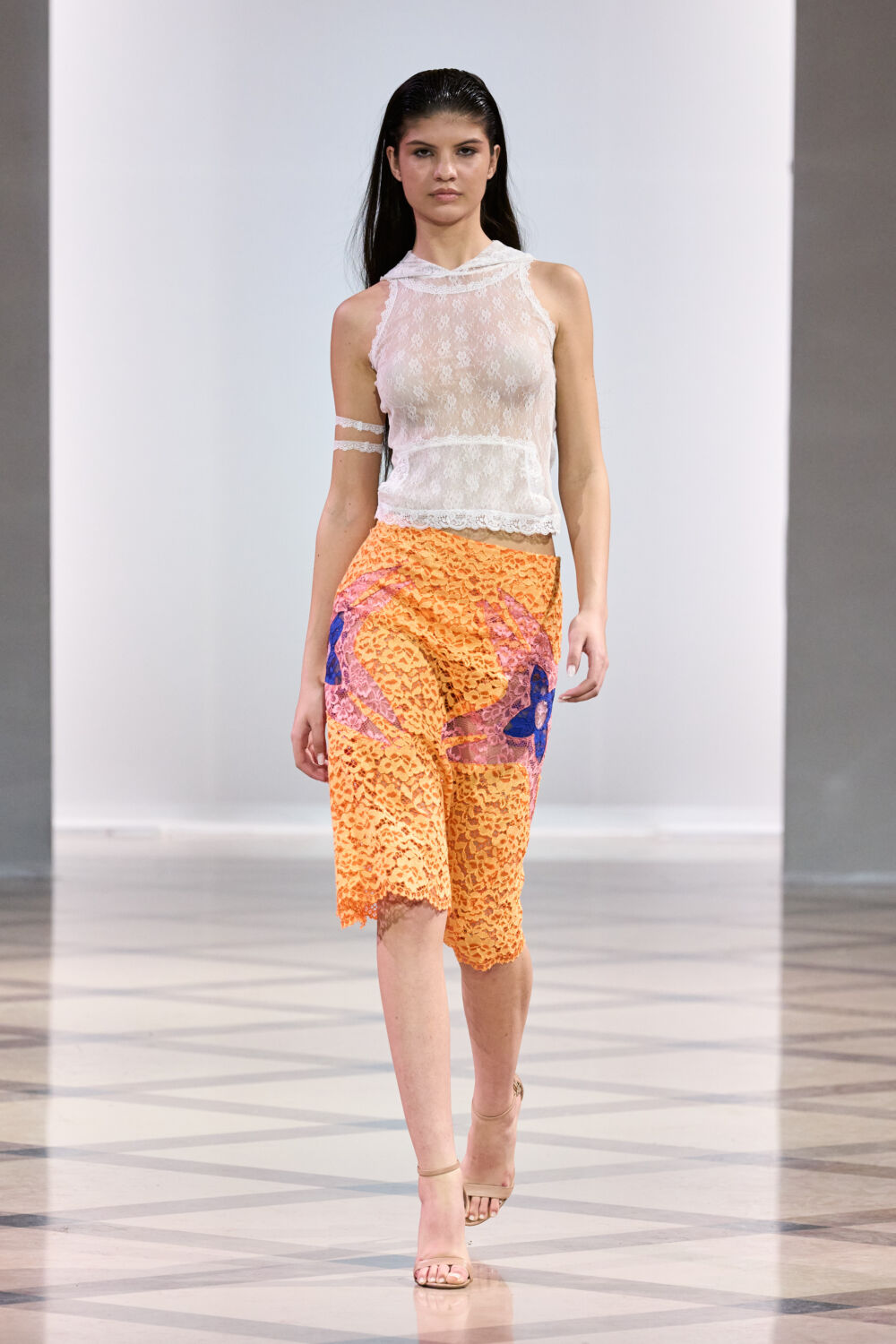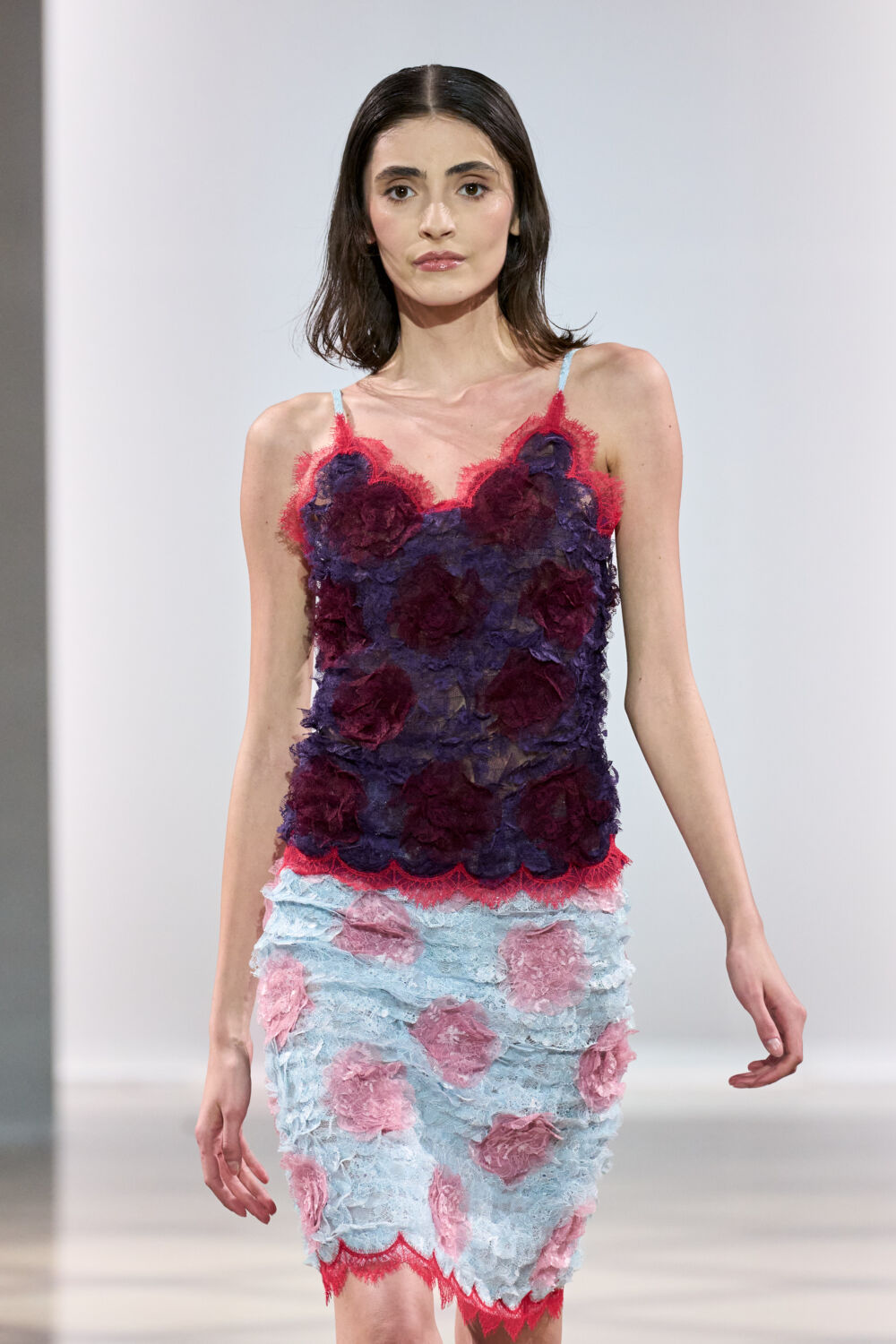 Alexandra Șipa, the London-based Romanian designer known for her innovative use of upcycled lace, made a striking debut with her AW25 collection, Water Under the Bridge, at Mercedes Benz Bucharest Fashion Week. Rooted in Romanian history and club culture, the show was a hauntingly beautiful exploration of memory and material. Lace – knotted, fringed, sequinned and layered – was transformed beyond recognition. Hand-cut lace sequins made from fabric scraps shimmered on tulle, while sculptural 3D knotted lace flowers added surreal, organic dimension. Fringe arcs inspired by a 1938 Madeleine Vionnet gown echoed the elegance of Queen Marie of Romania, contrasted with playful nods to 2000s Barbie films. Across 18 looks, the collection shifted between sultry loungewear and intricate, glamorous silhouettes, reflecting various stages of identity and life. With muses drawn from both personal relationships and history, Șipa’s runway debut offered a raw, ambitious reimagining of lace, redefining its place in contemporary fashion.