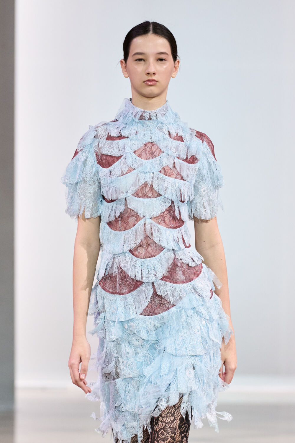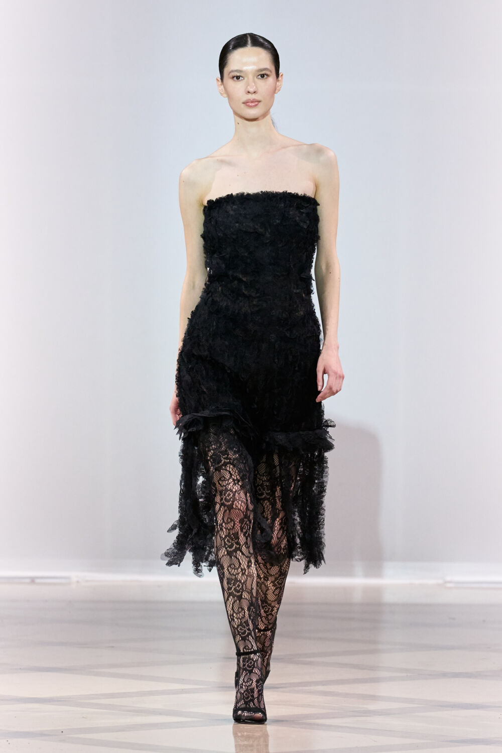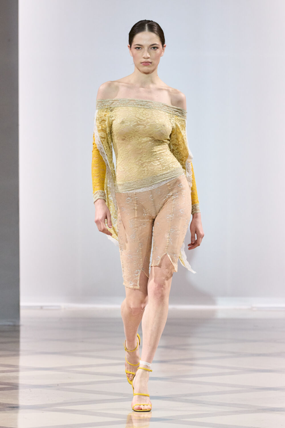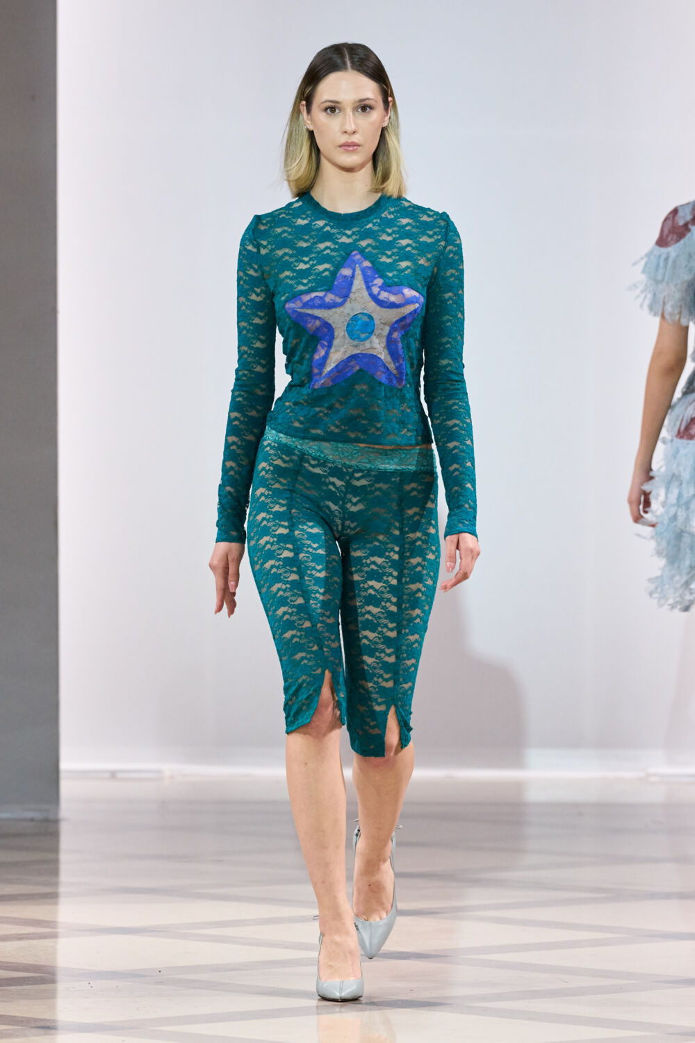 Alexandra Șipa, the London-based Romanian designer known for her innovative use of upcycled lace, made a striking debut with her AW25 collection, Water Under the Bridge, at Mercedes Benz Bucharest Fashion Week. Rooted in Romanian history and club culture, the show was a hauntingly beautiful exploration of memory and material. Lace – knotted, fringed, sequinned and layered – was transformed beyond recognition. Hand-cut lace sequins made from fabric scraps shimmered on tulle, while sculptural 3D knotted lace flowers added surreal, organic dimension. Fringe arcs inspired by a 1938 Madeleine Vionnet gown echoed the elegance of Queen Marie of Romania, contrasted with playful nods to 2000s Barbie films. Across 18 looks, the collection shifted between sultry loungewear and intricate, glamorous silhouettes, reflecting various stages of identity and life. With muses drawn from both personal relationships and history, Șipa’s runway debut offered a raw, ambitious reimagining of lace, redefining its place in contemporary fashion.