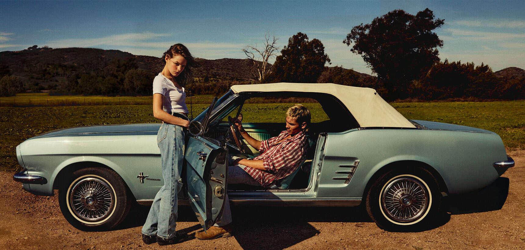 Whether lounging in a vintage Ford Mustang or curled up on a derelict, sun-faded sofa, the pair stare into the lens as if caught red-handed – yet too defiant to part ways. In that sense, they channel the innocence of star-crossed lovers, but with a rebellious streak. Guess Jeans distills that tension perfectly, blending timeless cool with modern edge. Tommy Dowling